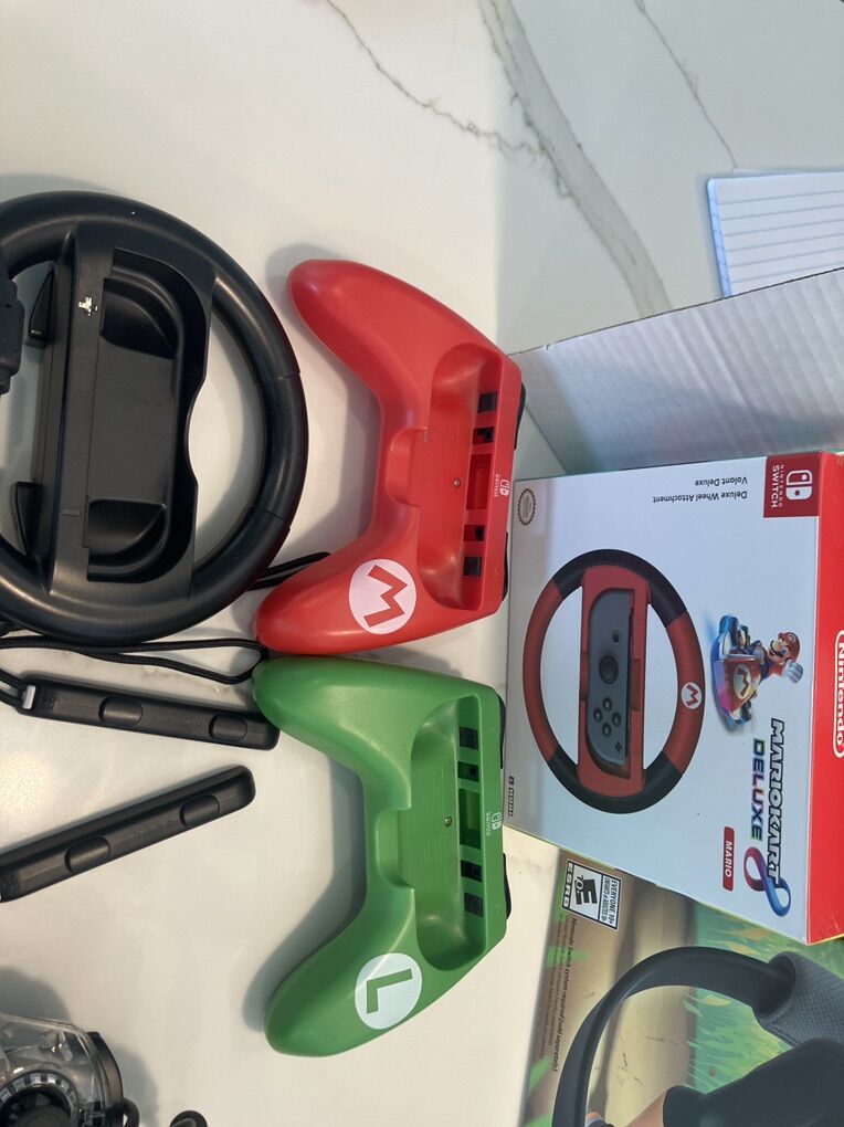 Pricing WIRELESS CONTROLLERS (SOLD OUT) WIRED CONTROLLERS (left side) $8/ea MARIO MARIOKART WHEEL (open box) $10 MARIOKART WHEEL (black) $5 MARIO AND LUIGI JOYCON GRIPS (SOLD) SWITCH CAR CHARGER SEALED (SOLD) RINGFIT ADVENTURE RINGCON ONLY (no game) $20 CONTROLLER CASE $5