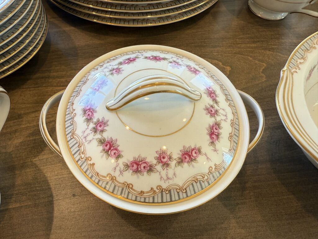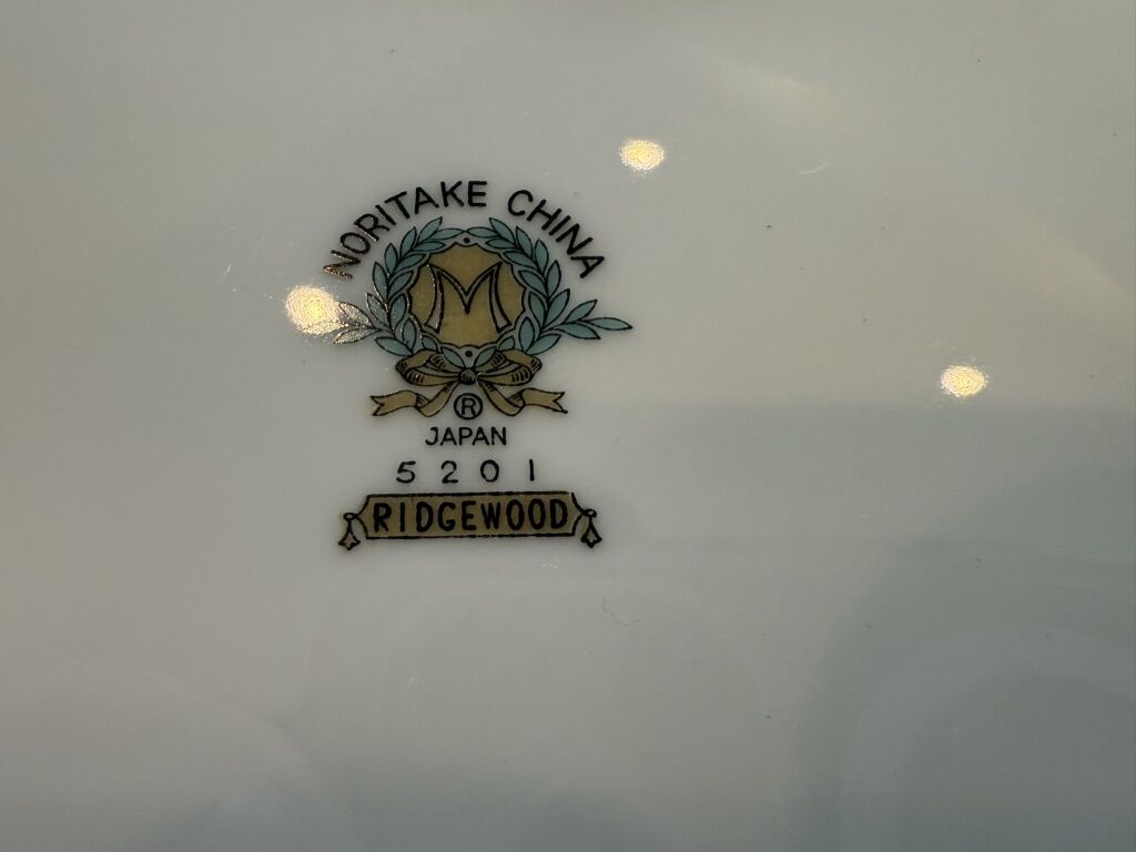 VenmoNoritake Ridgewood China, made in Japan between 1951-1961, Included is a six piece, 8 place setting. Dinner plate, salad plate, bread and butter plate, fruit bowl, footed cup and saucer. I also have creamer, 13” serving platter, covered vegetable bowl, sugar bowl with lid and gravy boat with attached under plate. There is also and unrelated creamer. Everything is in perfect condition.