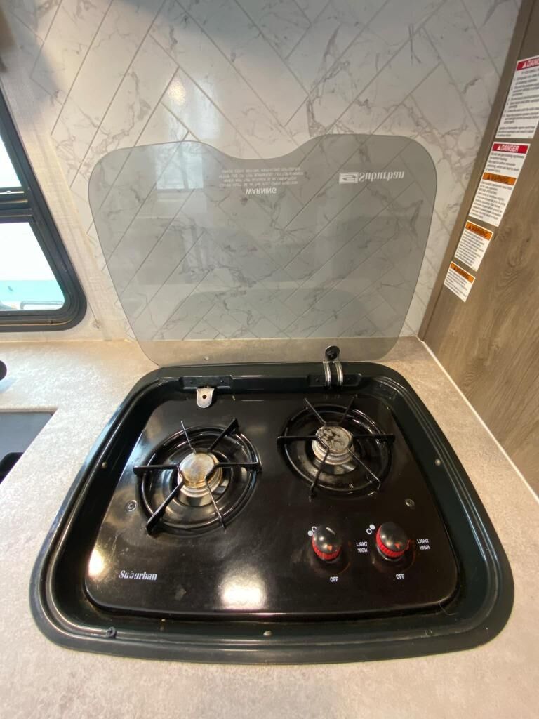 Bring along family or friends in this travel trailer that can sleep up to six people each night. The** dinette slide** will provide the chef space to cook on the two burner cooktop, or they may just head outdoors to cook on the outside kitchen. There is also an outdoor shelf here and a spray port for your convenience. The true queen-size bed up front is sure to provide a great night's rest, plus there is a "Stargazer" front window that will allow natural light in and beautiful starry nights.