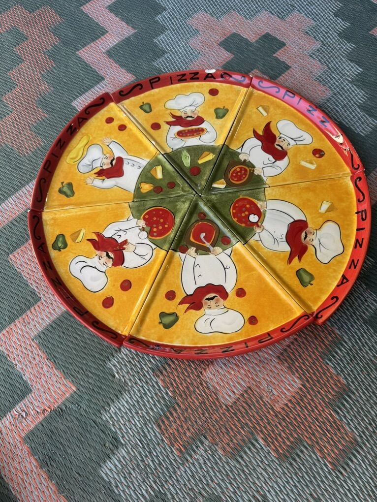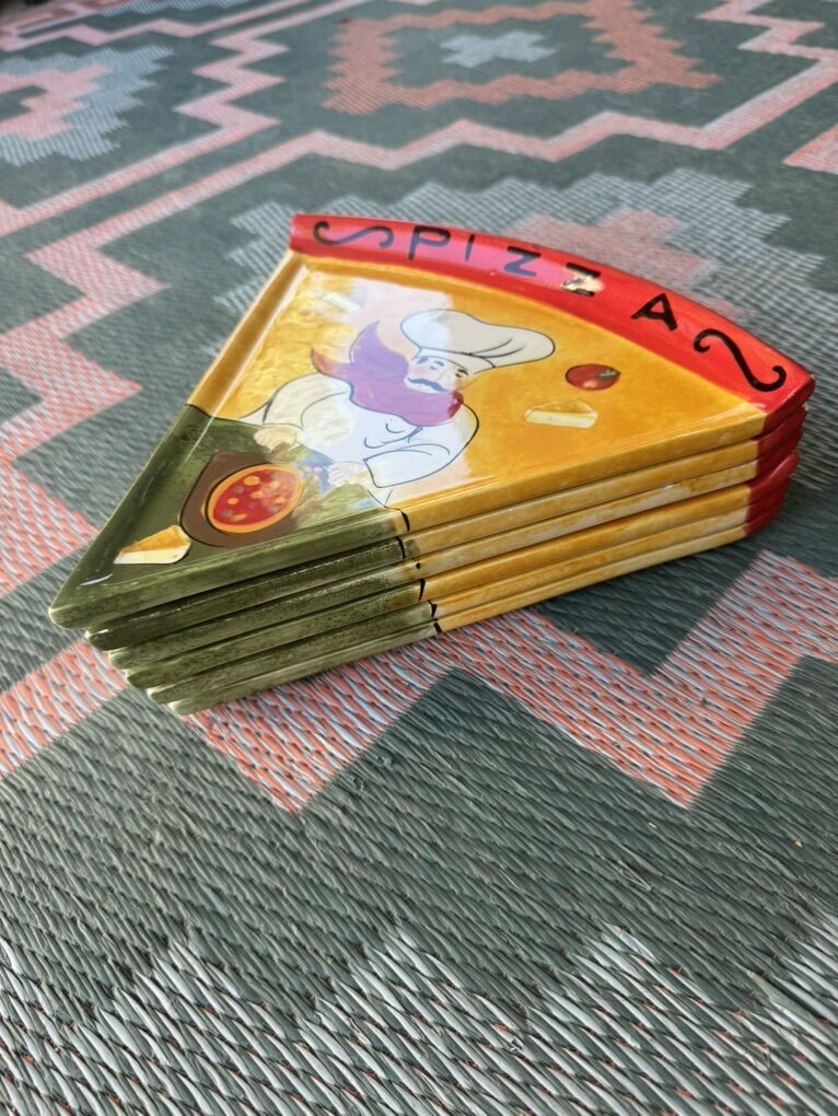 Adorable set of six hand-painted ceramic plates, perfect for pizza or snacks! Kids will absolutely love them. They are in great shape, with 3 small chips. Each plate or slice measures 10 in length and 10 at the widest part (the crust!)