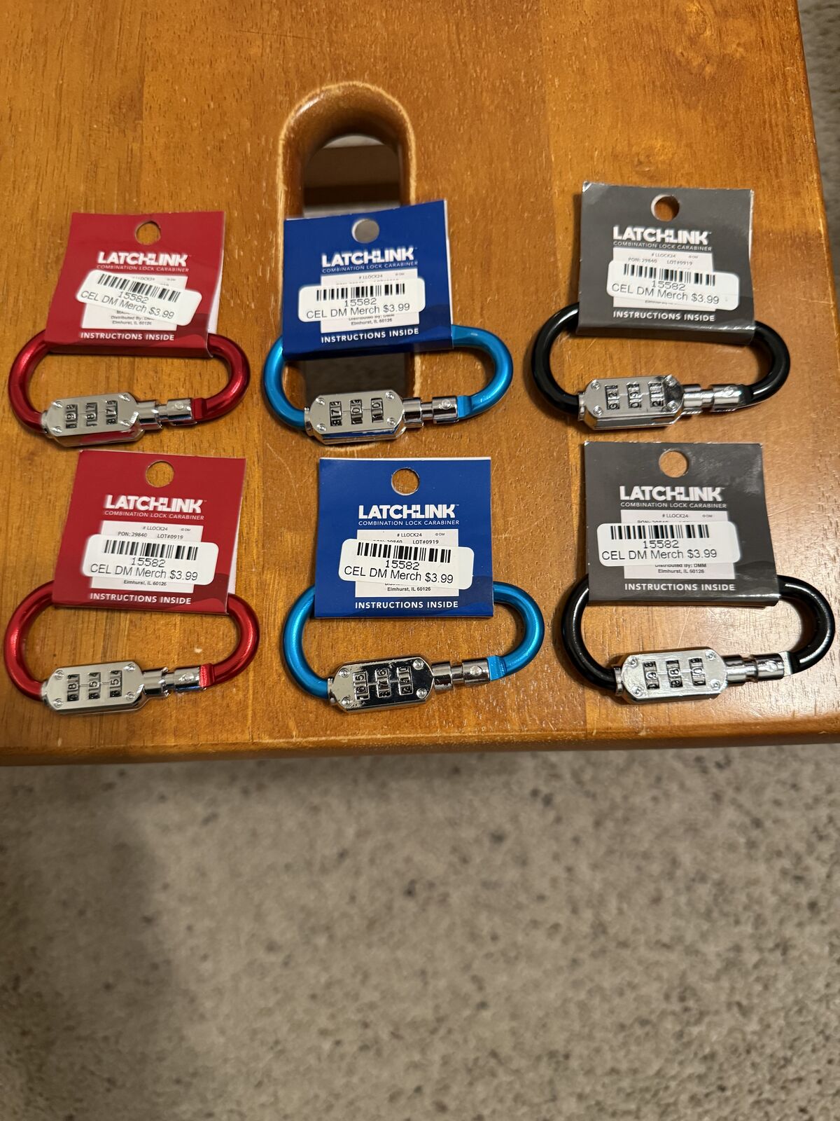 I bought these 5 Brand New LatchLink Combination Lock Carabiners online for $4 each (see 2nd photo), but ended up never using them. Still Brand New in the Unopened Packaging. Selling them for only $2 each. Please call/text if interested. 801-541-7189.