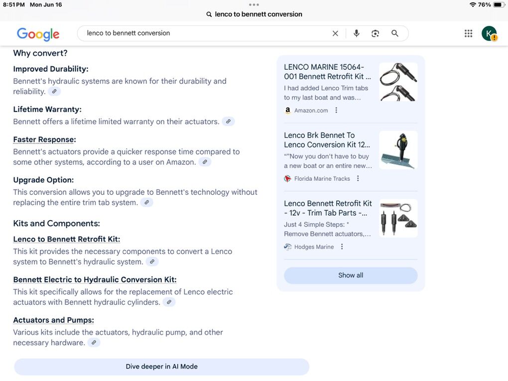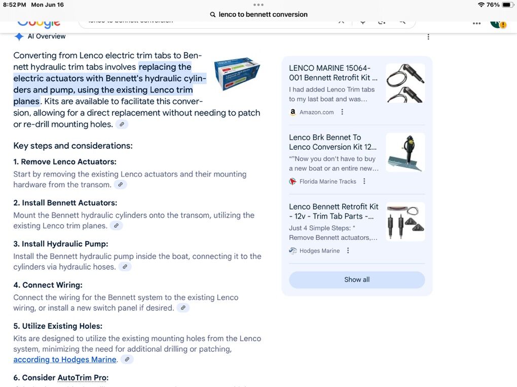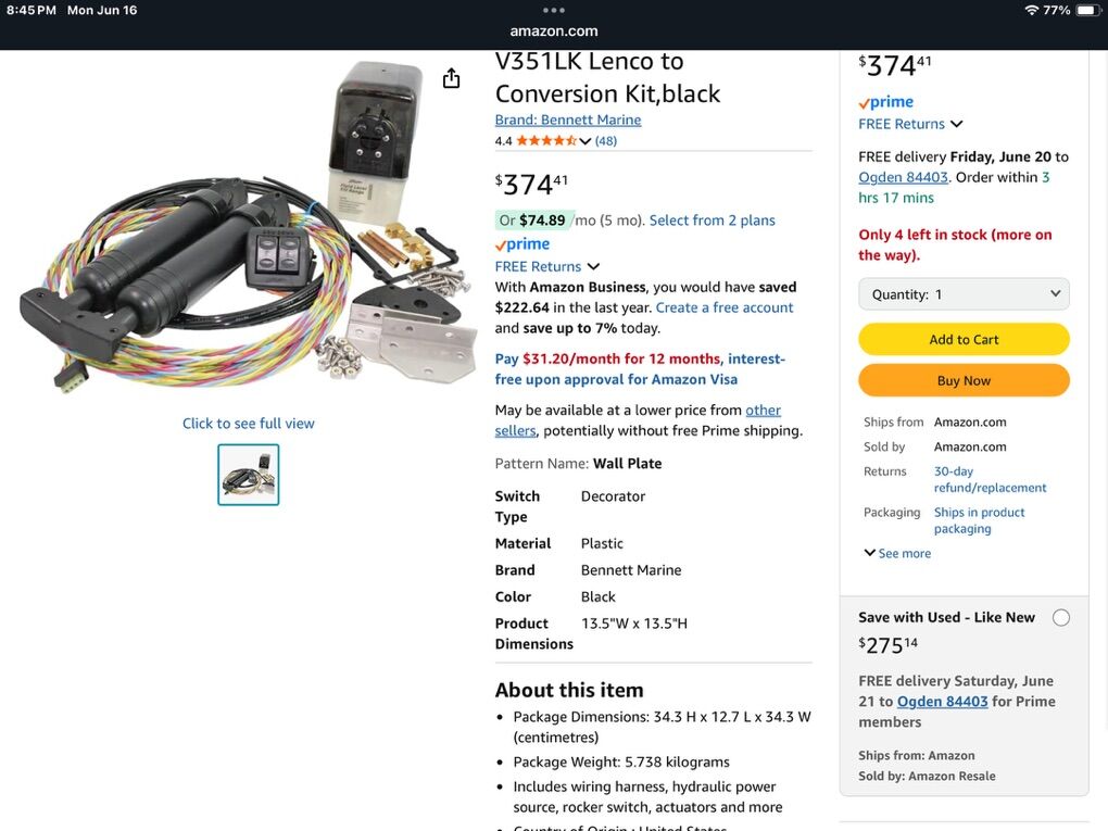 VenmoLenco to Bennett trim tab conversion kit Includes all necessary components and hardware to switch from Lenco to Bennett trim tab system Includes wiring harness, hydraulic power source, rocker switch, acutators and more. $250 or best offer