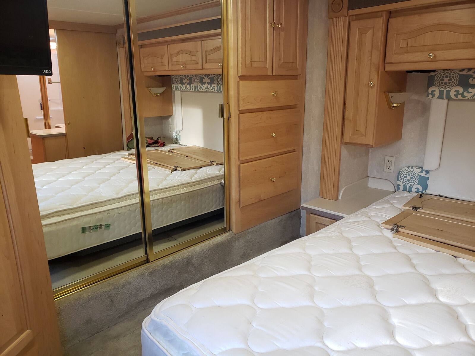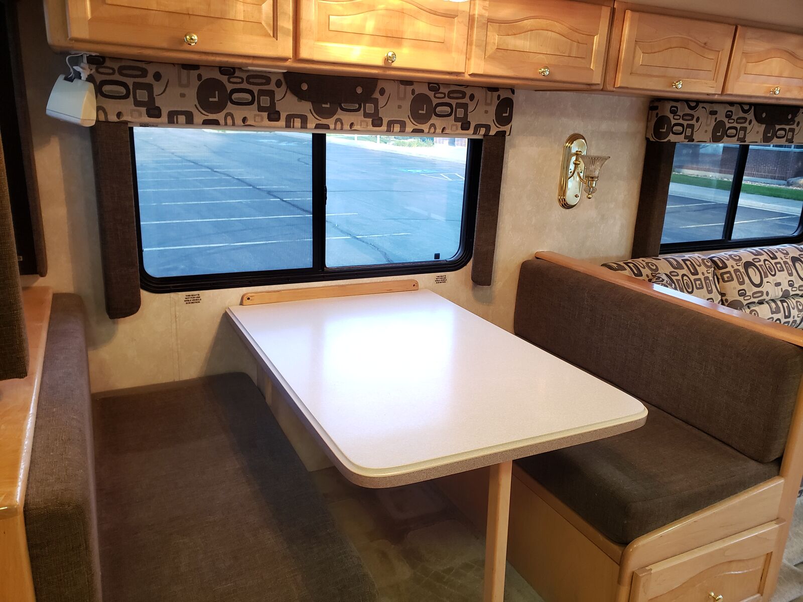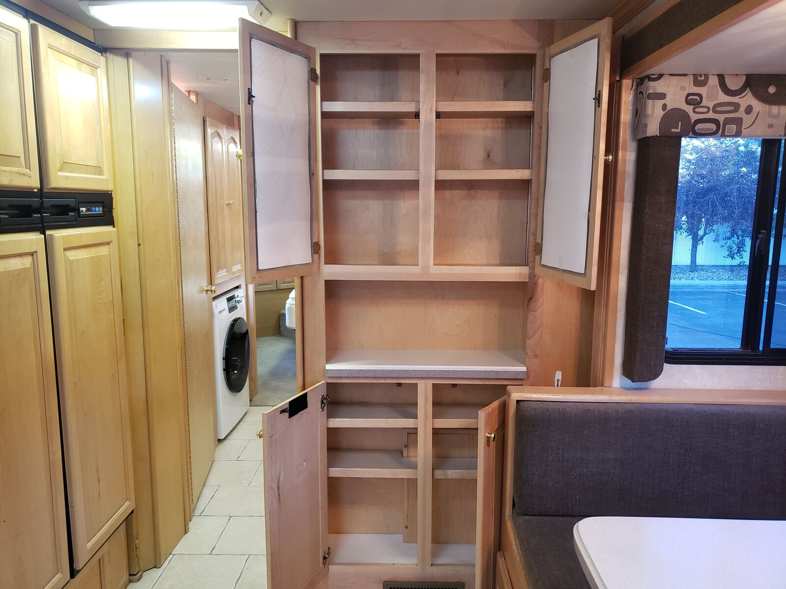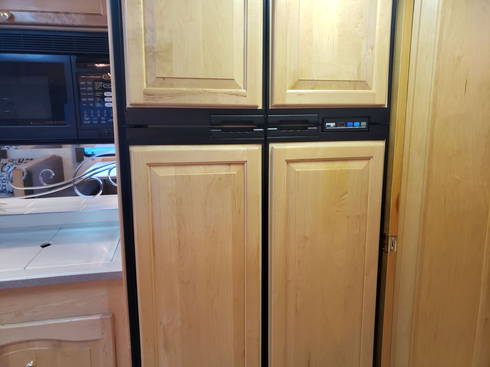 The interior has solid maple cabinets and Corian countertops and upgraded night/day blinds. There are two slide outs. There is beyond ample storage inside. The fridge is a 4 door (that matches the cabinets) Norcold with a replaced cooling unit.