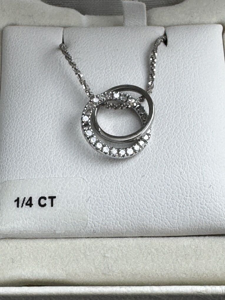 Venmo18” necklace with two connected hoops, one has 1/4 ct diamonds