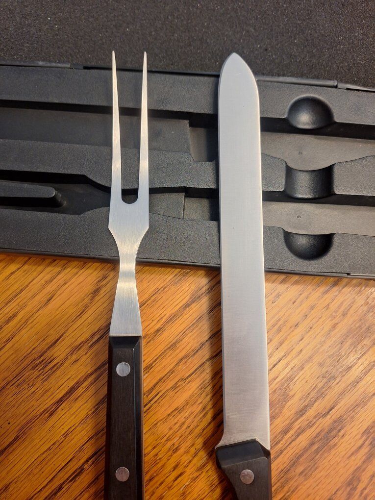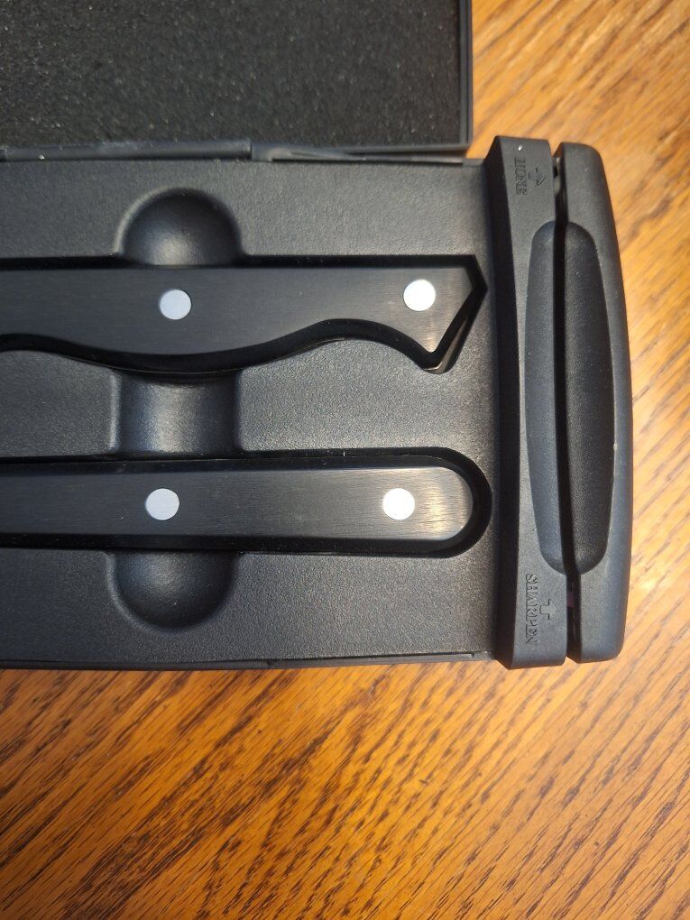 VenmoThis knife and fork comes in a plastic case with a sharpener on the right side.