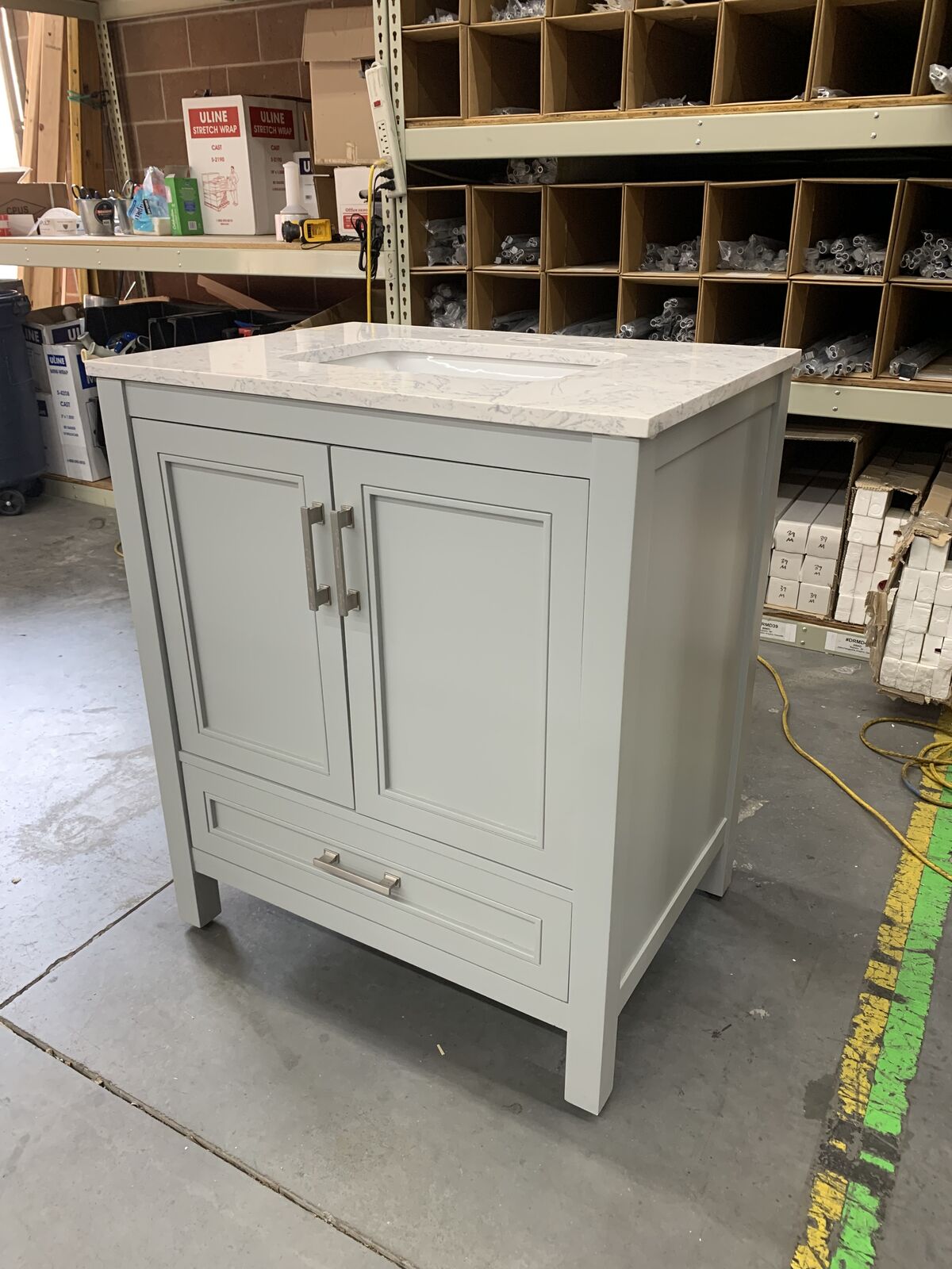 The family of vanities is modern regality at its finest. This 30 in. crisp vanity holds a stately silhouette with paneling inlay design and bullnose edging, which is perfectly paired with our Carrara marble top. Both the brushed nickel and black finished hardware are included as well as matching backsplash and under mounted ceramic basin. Practicality also isn't compromised with storage features like an under basin adjustable shelf and tilt-down drawer.