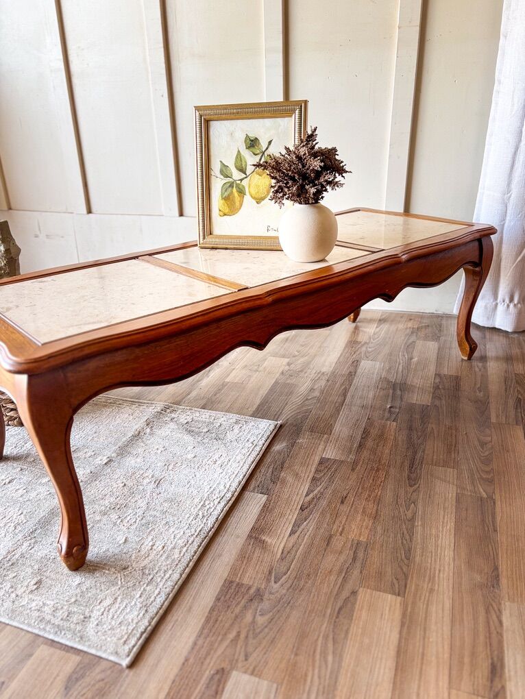 VenmoThis stunning French Provincial coffee table and side table set is a timeless blend of elegance and craftsmanship, likely made in the 1960s or early 1970s, and almost certainly crafted in the USA during the golden age of French-inspired furniture. Each piece features beautifully sculpted cabriole legs, warm honey-toned wood frames, and inlaid creamy marble tops that elevate their charm with a sophisticated yet relaxed Old World flair. The gentle curves and carved edges nod to classic French design, while the neutral marble provides a luxurious, durable surface perfect for modern use. Both pieces are in great vintage condition with only minor wear, adding just the right touch of authenticity to their graceful character. Whether used together or separately, this set makes a striking statement in any living space!