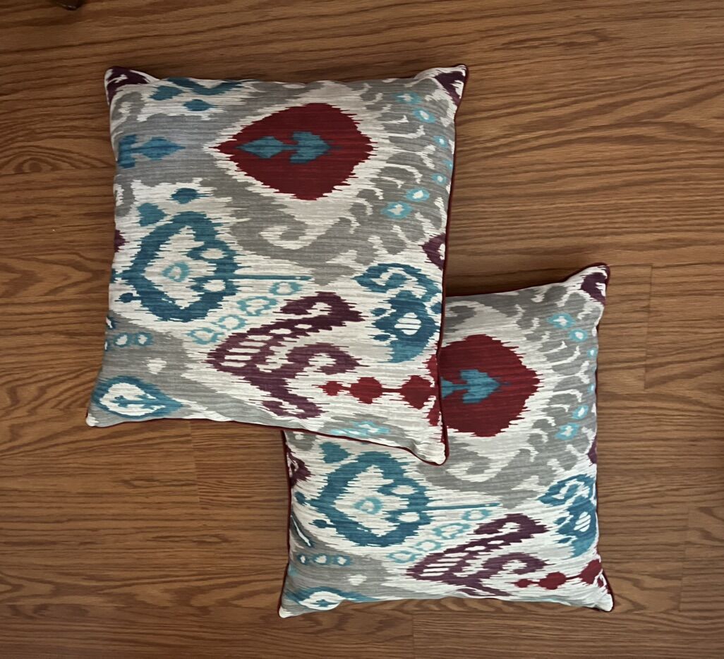 VenmoSet of 4 pillows: orange embroidered and multicolor ikat. Measurements: 18,5” x 18,5”. Sold by pairs or together. Beautiful addition to any room or office. From pet and smoke free home. $15 a pair or $25 for all 4.