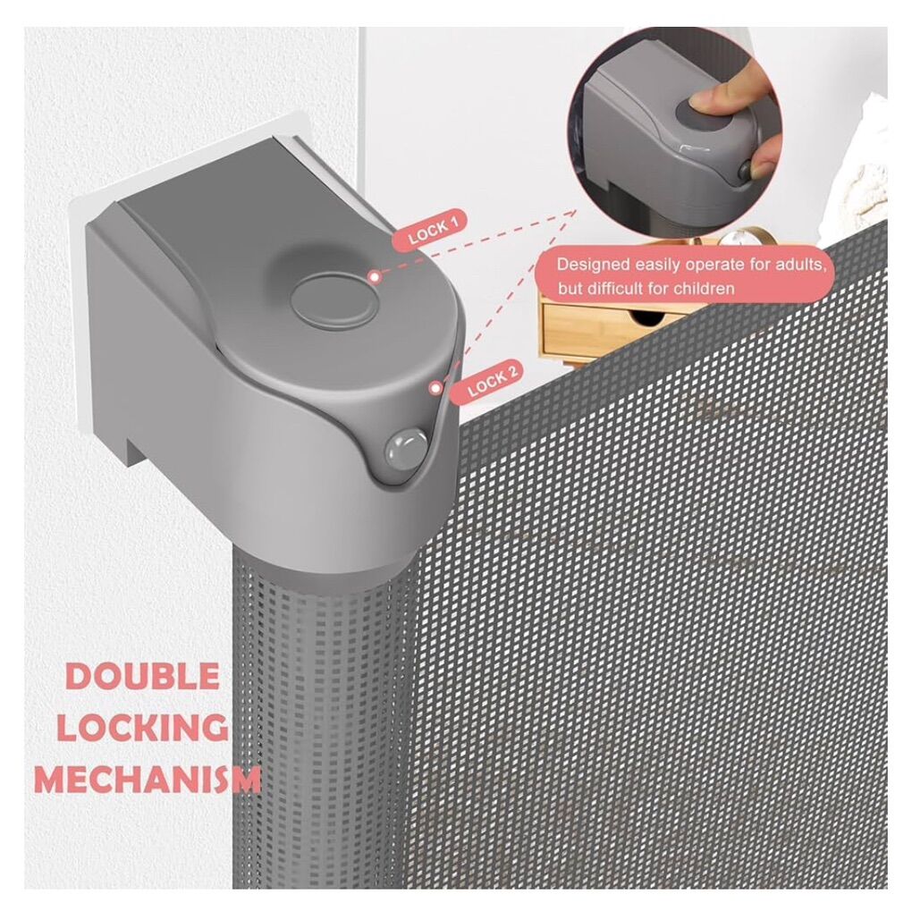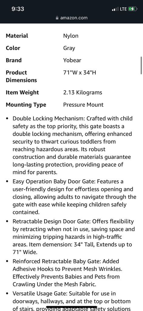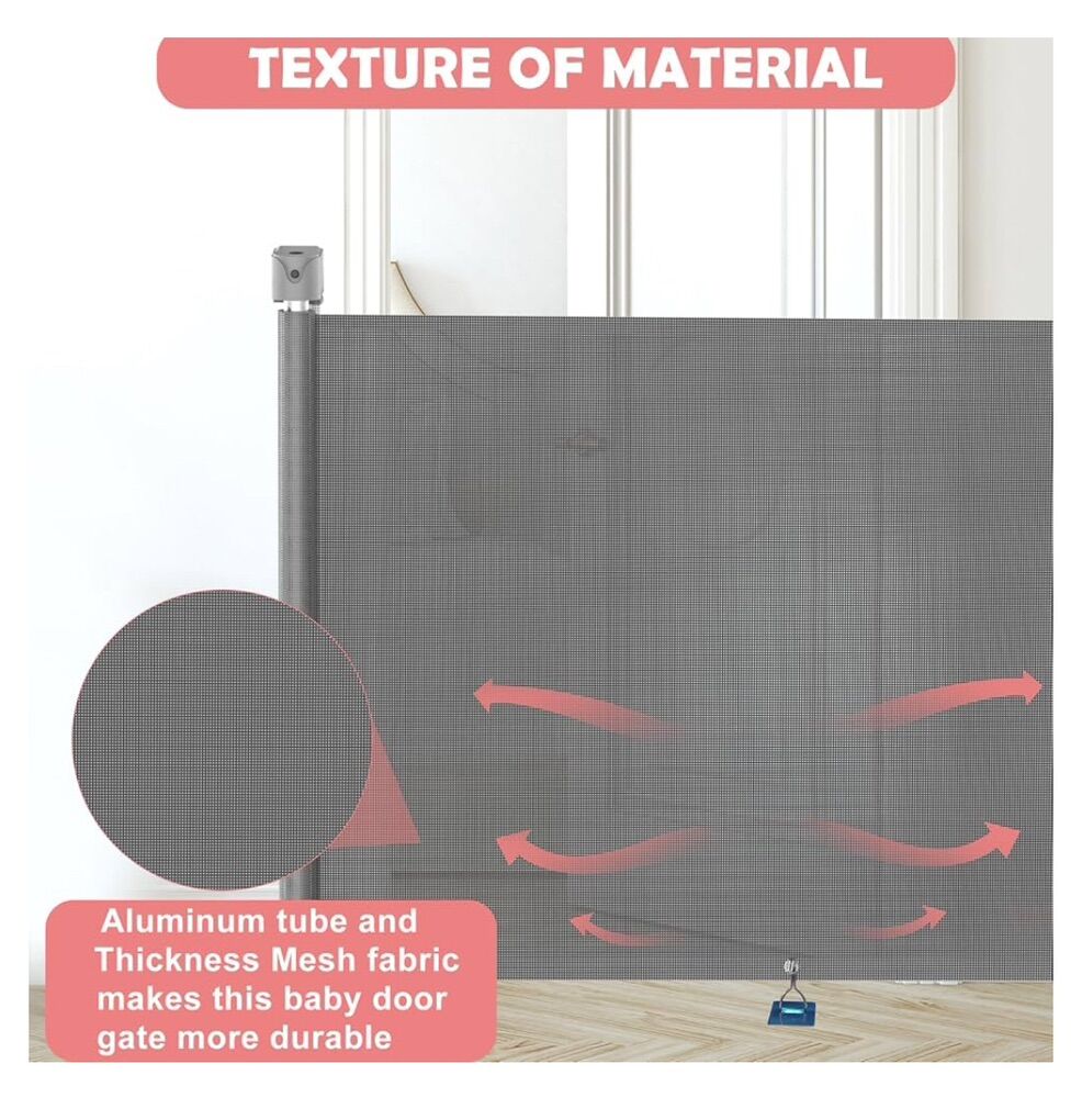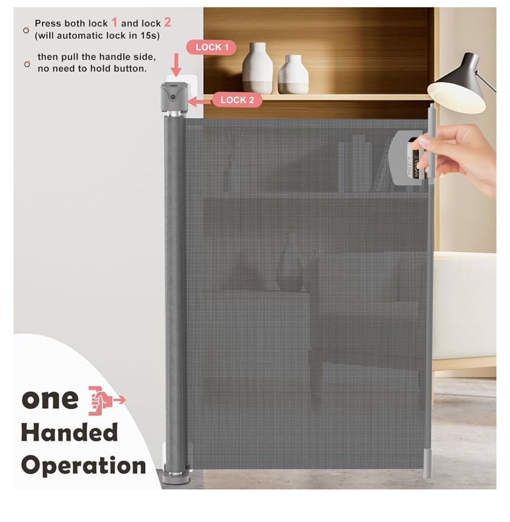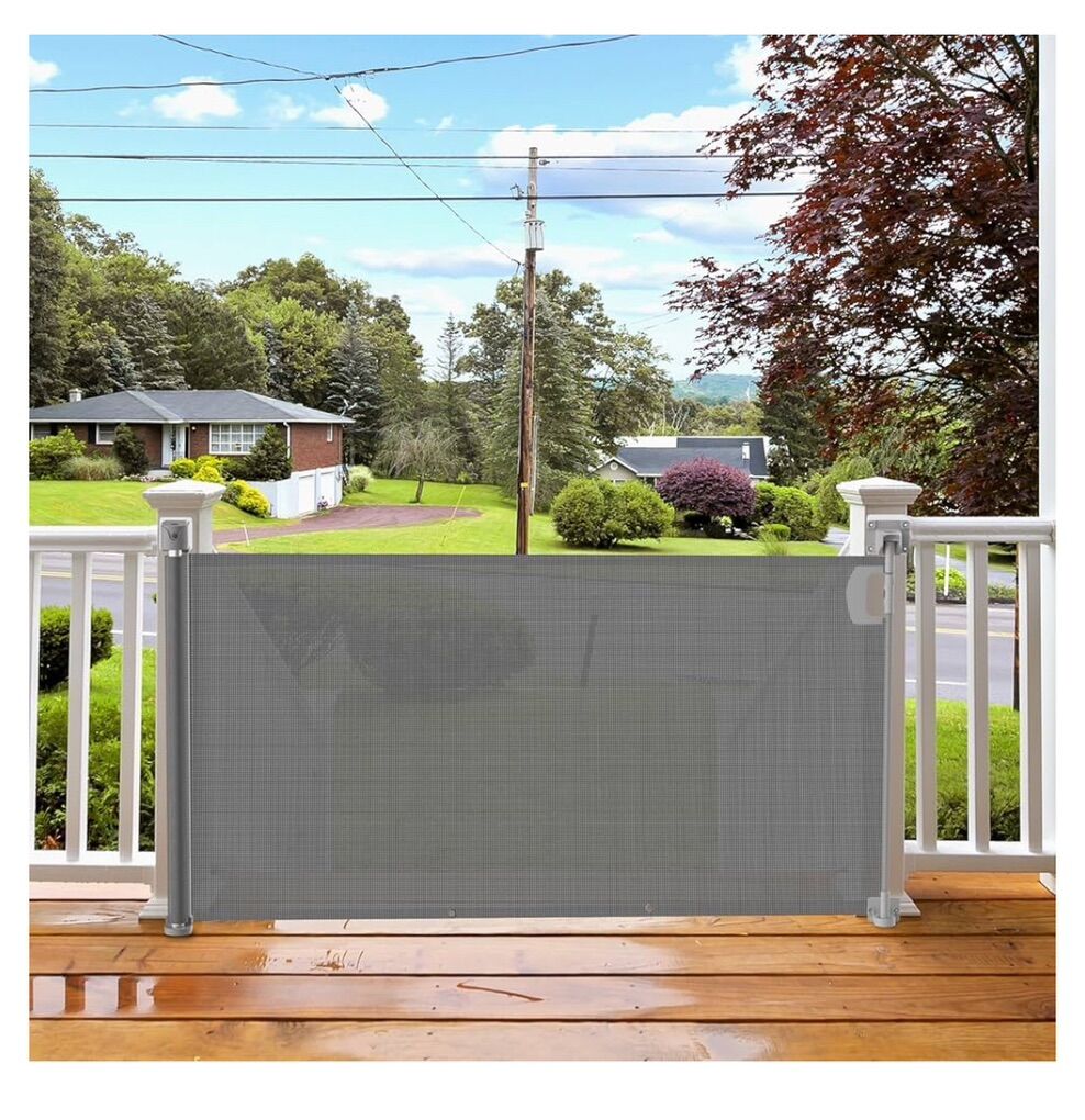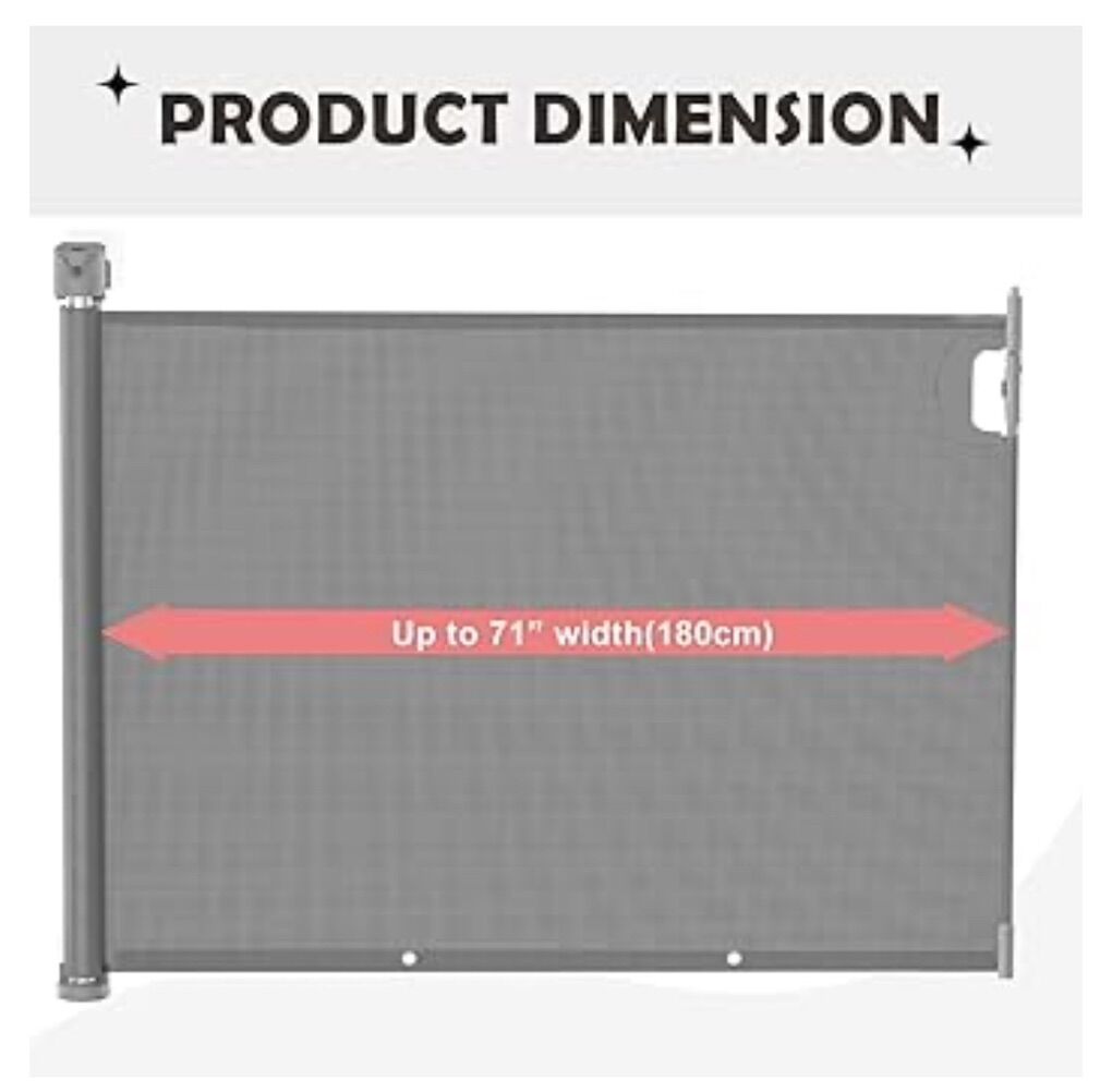 Grey, Pet or Baby Gate, 34in Tall, 71in Wide Retractable Gate, long, brand new