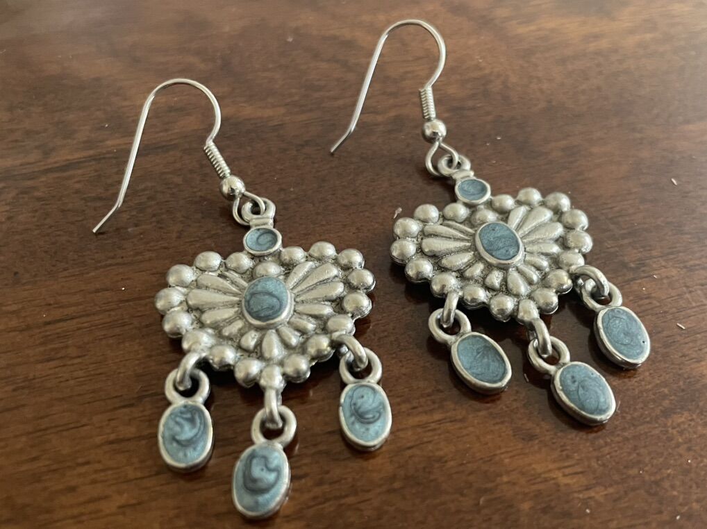 I have a pair of vintage dangly heart earrings with blue swirly stones. They are 2 1/2 inches long. There are markings on the back that are hard to read but look like 6/4. If that’s correct they should be what’s called quadruple plate silver (a high quality silverplate). See my other ads for jewelry, artwork, home decor and more.