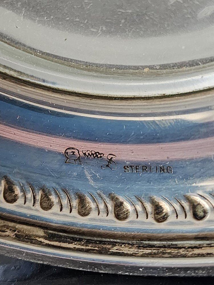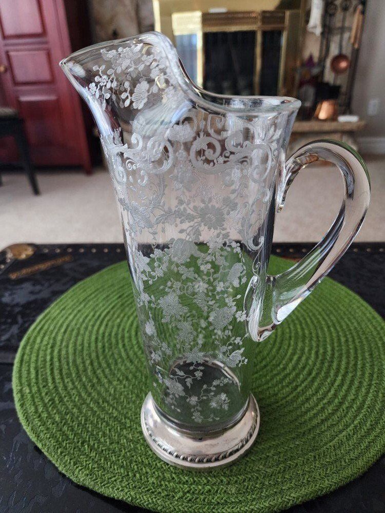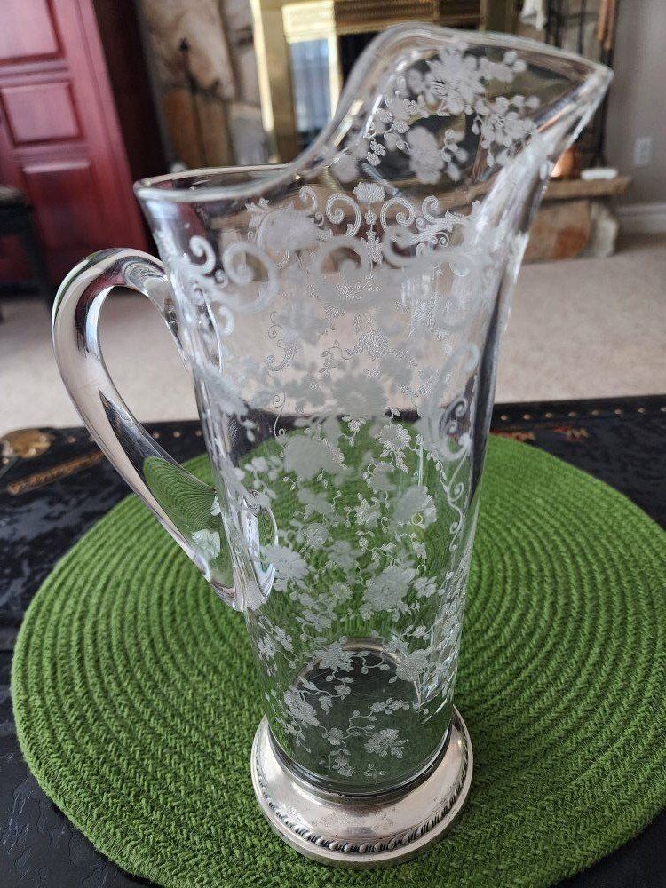 Cambridge glass, Chantilly pattern. Sterling marked and has hallmarks of maker. Appx. 10.5" tall 6.5" wide at widest point and 3.37" wide across sterling base. No chips or cracks but does have some scratches on the inside.