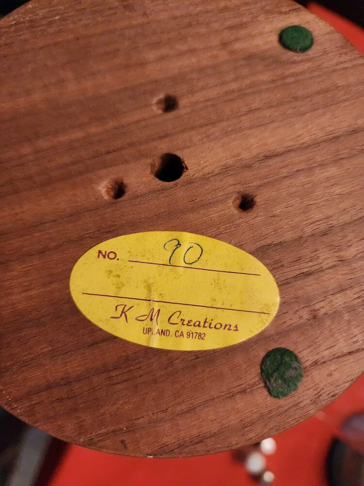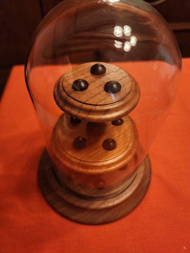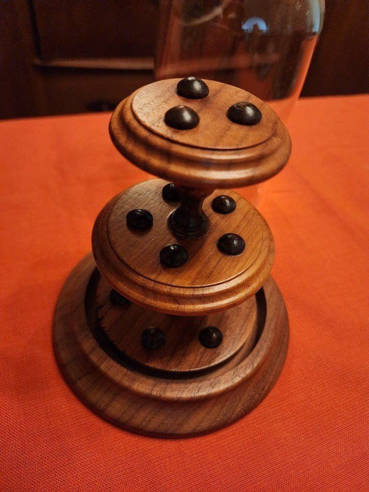 7.25" tall 5.5" wide at base. Has 14 thimble places. Mixed wood. Glass dome.