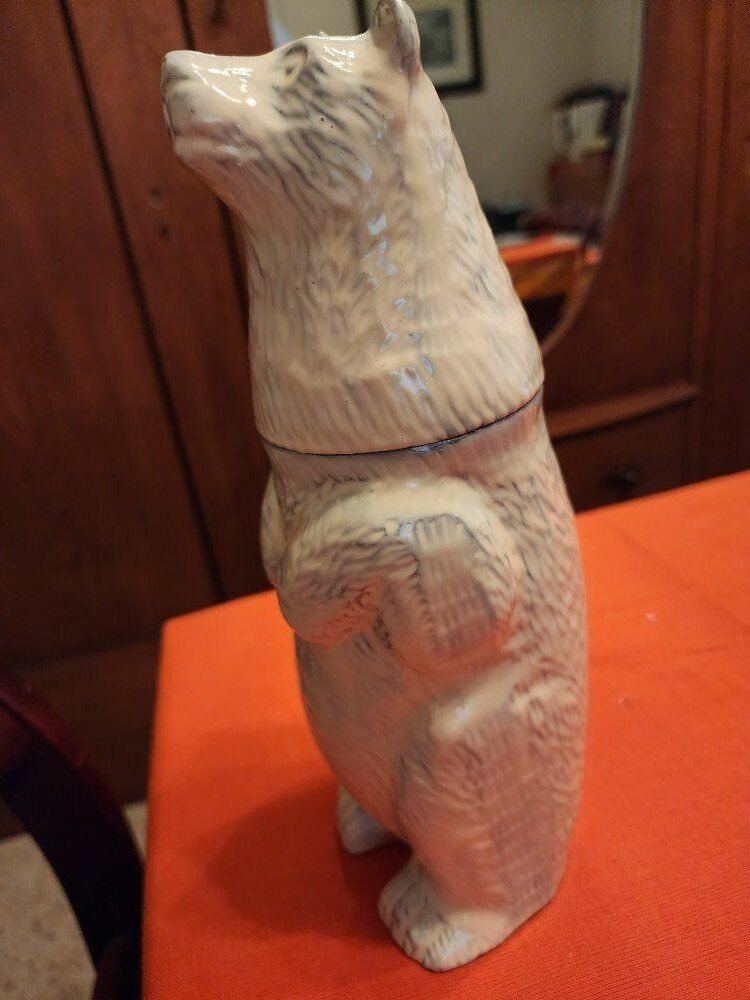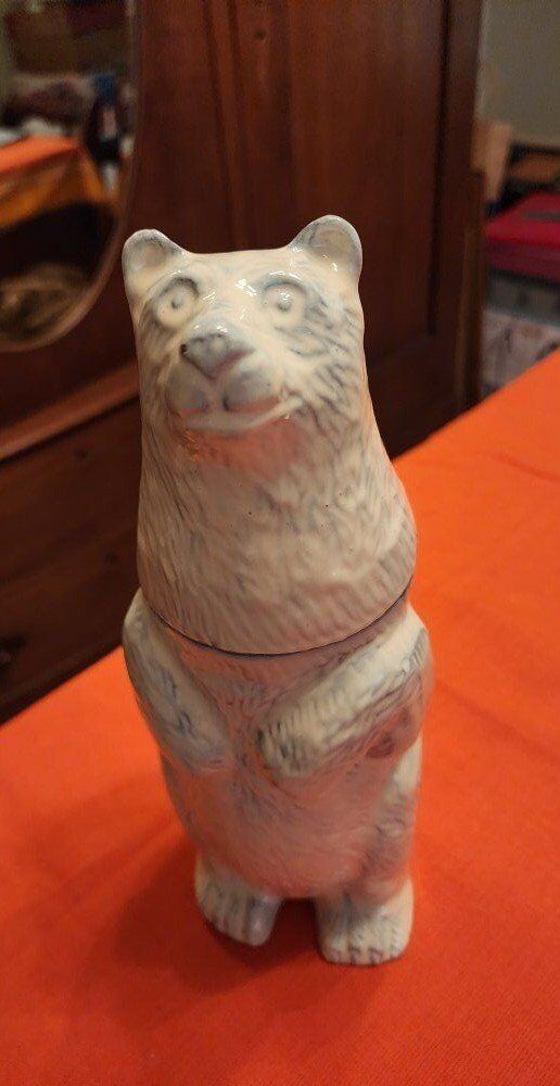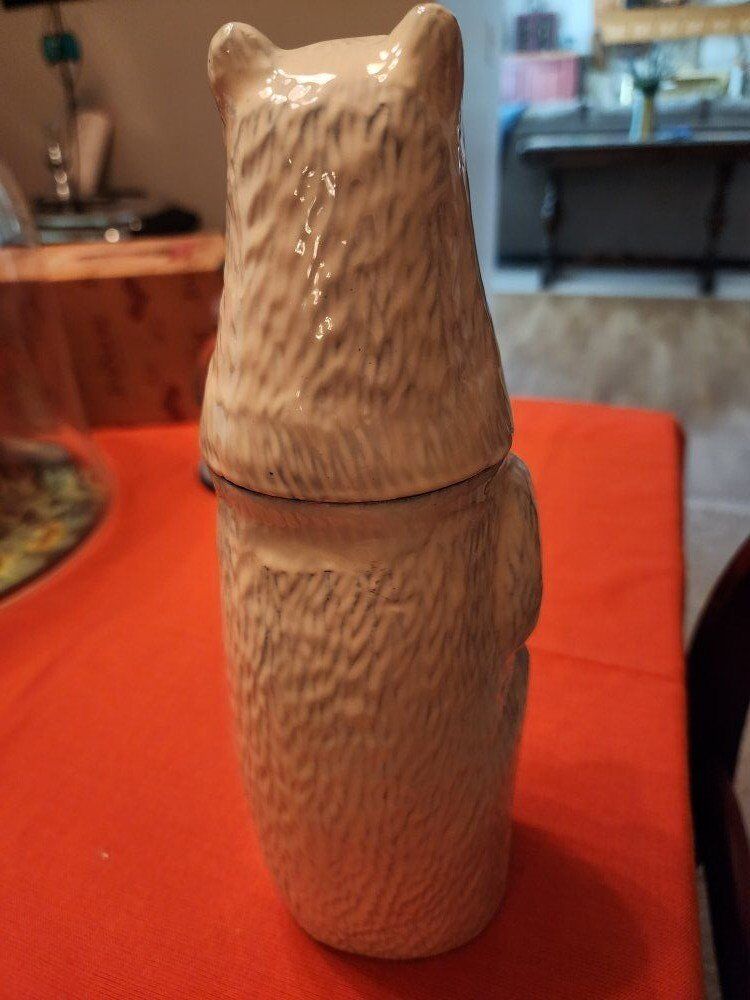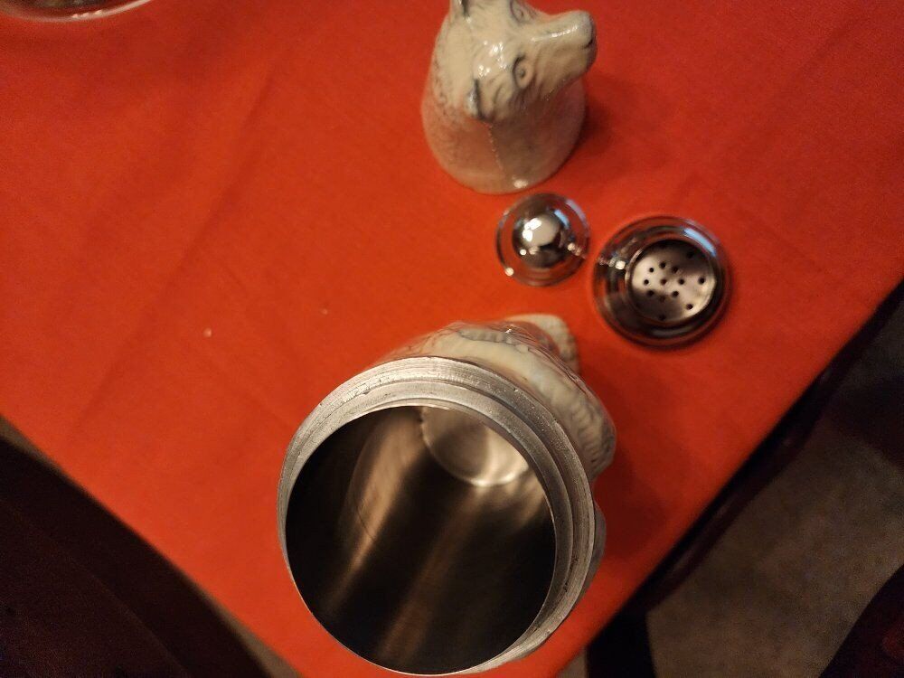 11" tall cast metal. Head comes off to reveal Shaker with cap and strainer.