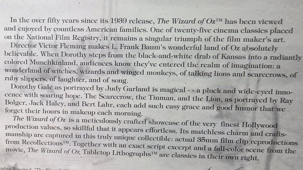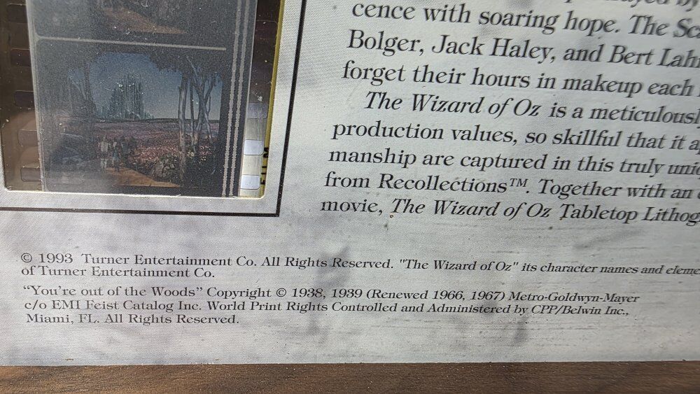 Recollections The Emerald City!1993 Turner Entertainment Co. Wizard Of Oz "The Emerald City" 35mm Movie Film Strip Clip Tabletop Lithograph Recollections by Lightpost. This lithograph is beautifully framed in a plastic covering and sits on a wood base stand for display. Measures 6.75" H x 8-3/16"W. There is a number stamped on the back which reads: Serial # R2 400777. See all photos, text message is better, see my other adds, thank you.