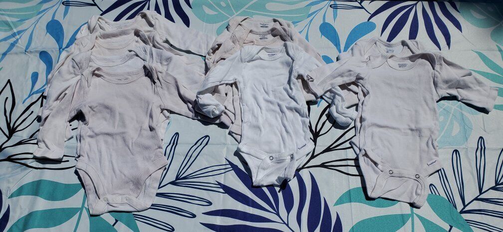 8 long sleeve white onesies Good condition may have stains Brand: Gerber, Place Size 0-3