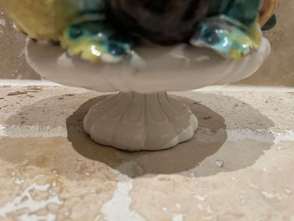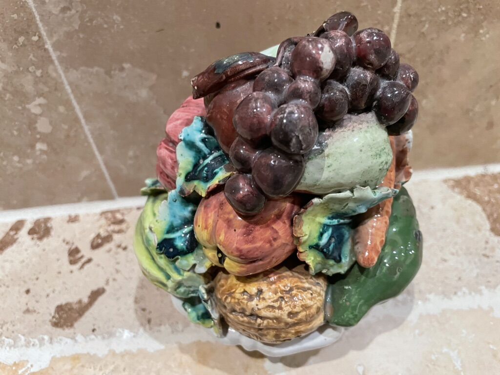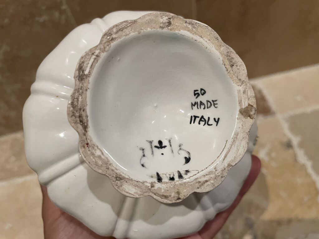 I have a vintage porcelain fruit and vegetable topiary on a pedestal. The bottom is marked 50 Made in Italy with a maker’s mark. It is 6 inches tall. See my other ads for jewelry, artwork, home decor and more.