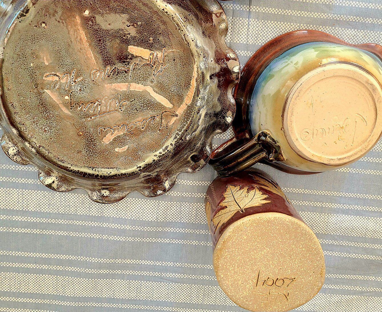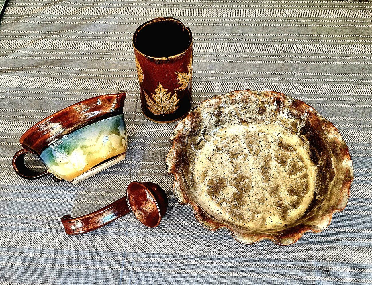 Gravy bowl ladel vase pie pan Different pottery artists - all signed except for the ladel. All 4 are in the price.