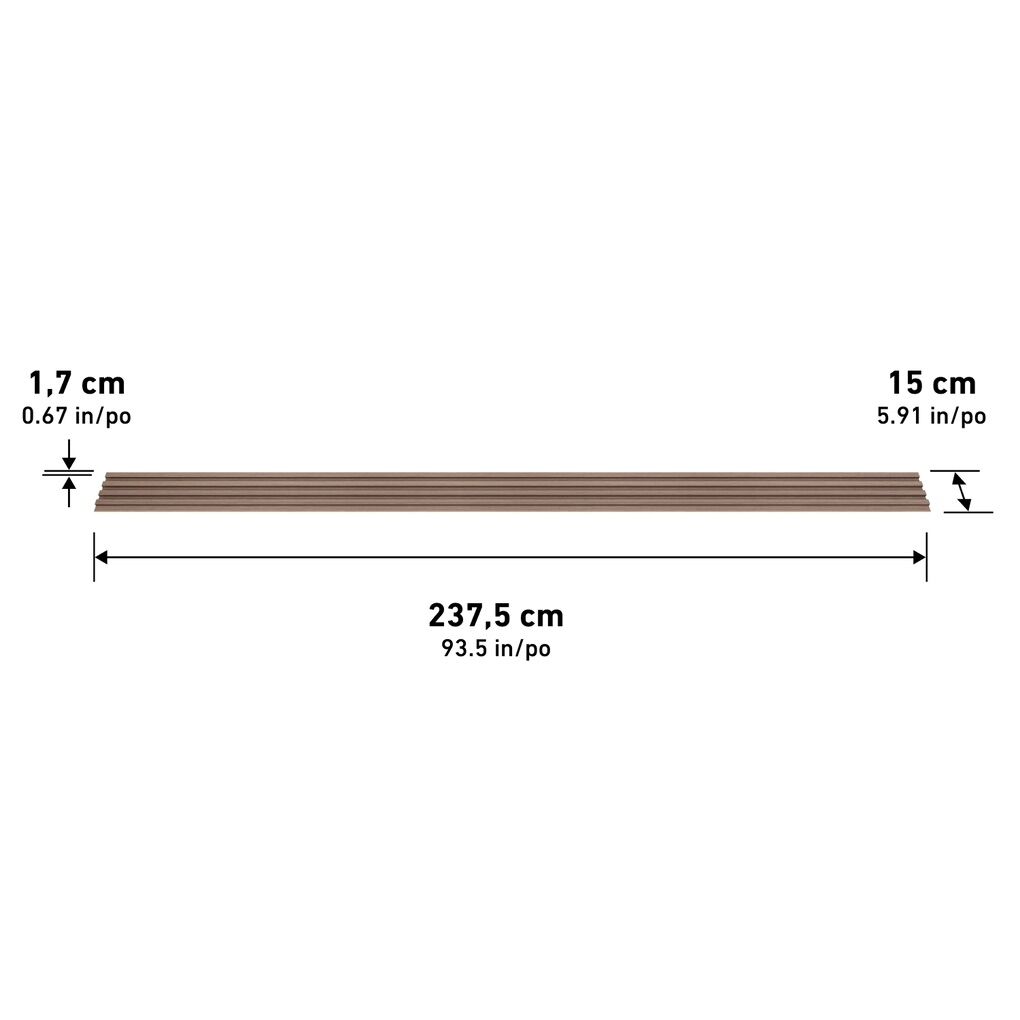 Wattage : 0.0 Total Wall Coverage Box : 30.68 ft² Wood Slat Material Substrate : Plne Wood Wood Slat Material Tolayer : PVC Box Dimensions (Inches, LxWxH) : 95.9X7.1X5.5 Box Gross Weight In Lb : 39.13 Primary Color Finish : Oak Product Dimensions Inches 1 : 93.5X5.9X0.7 Product Weight Lb : 35.27