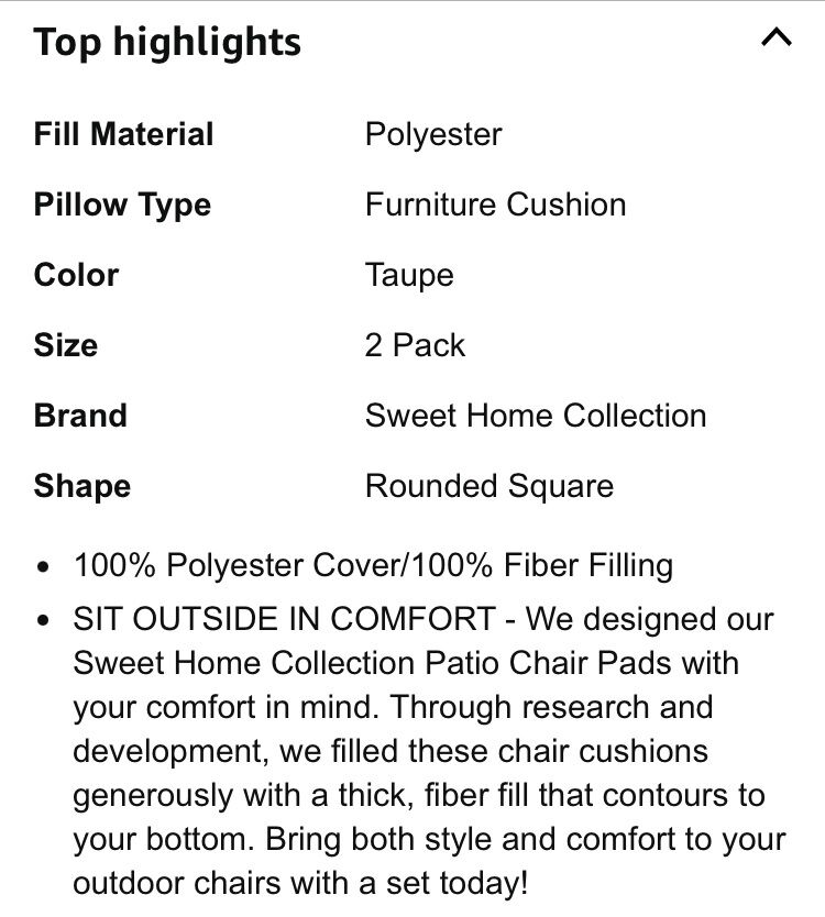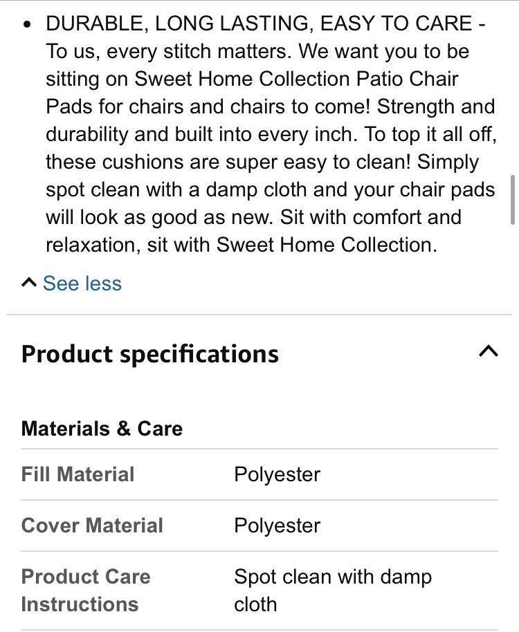 100% Polyester Cover/100% Fiber Filling SIT OUTSIDE IN COMFORT - We designed our Sweet Home Collection Patio Chair Pads with your comfort in mind. Through research and development, we filled these chair cushions generously with a thick, fiber fill that contours to your bottom. Bring both style and comfort to your outdoor chairs with a set today! PICK YOUR PACK - At Sweet Home Collection, your convenience is our priority. We offer our chair pads bundled to fit your needs. Buy a 2 pack, 4 pack, 6 pack, or 12 pack today to put a comfy and cozy chair pad on all of your chairs once and for all. PERFECT FIT FOR ANY CHAIR - Sit in comfort for years to come! Our chair pads are designed to fit all chairs. These cushions are a rounded square shape, or a square with curved corners, and measure 19 x 19. These dimensions are a perfect fit for almost all outdoor chairs. DELIGHTFUL LOOK VERSATILE DESIGN - The cover of these cushions utilize a solid color tufted design that is a perfect fit for any decor. The pattern is a stylish and unique pattern which looks beautiful on any chair. Conveniently available in 4 colors, choose one to match your chair directly, or another color to accent the chair. These chair pads are available in Cream, Red, Silver and Teal. DURABLE, LONG LASTING, EASY TO CARE - To us, every stitch matters. We want you to be sitting on Sweet Home Collection Patio Chair Pads for chairs and chairs to come! Strength and durability and built into every inch. To top it all off, these cushions are super easy to clean! Simply spot clean with a damp cloth and your chair pads will look as good as new. Sit with comfort and relaxation, sit with Sweet Home Collection.