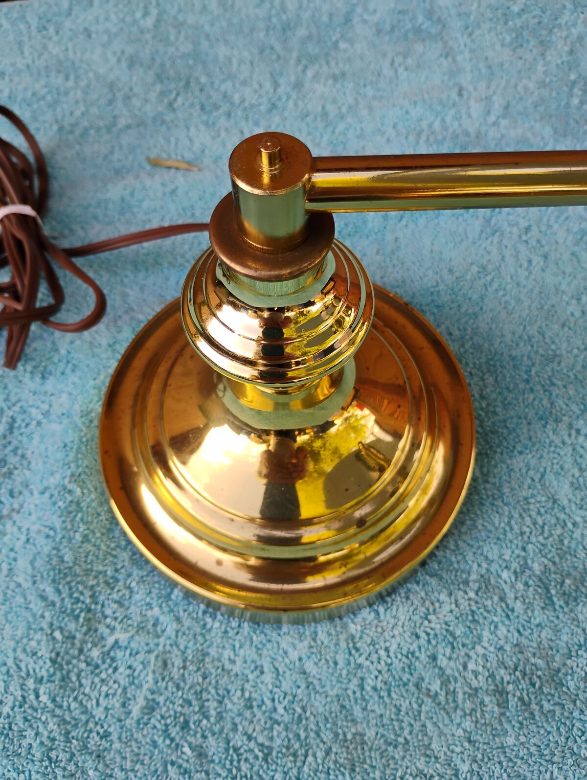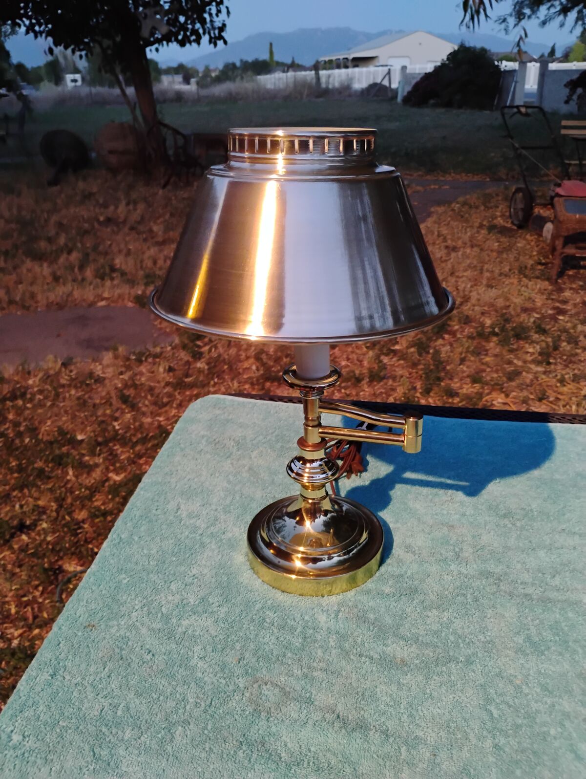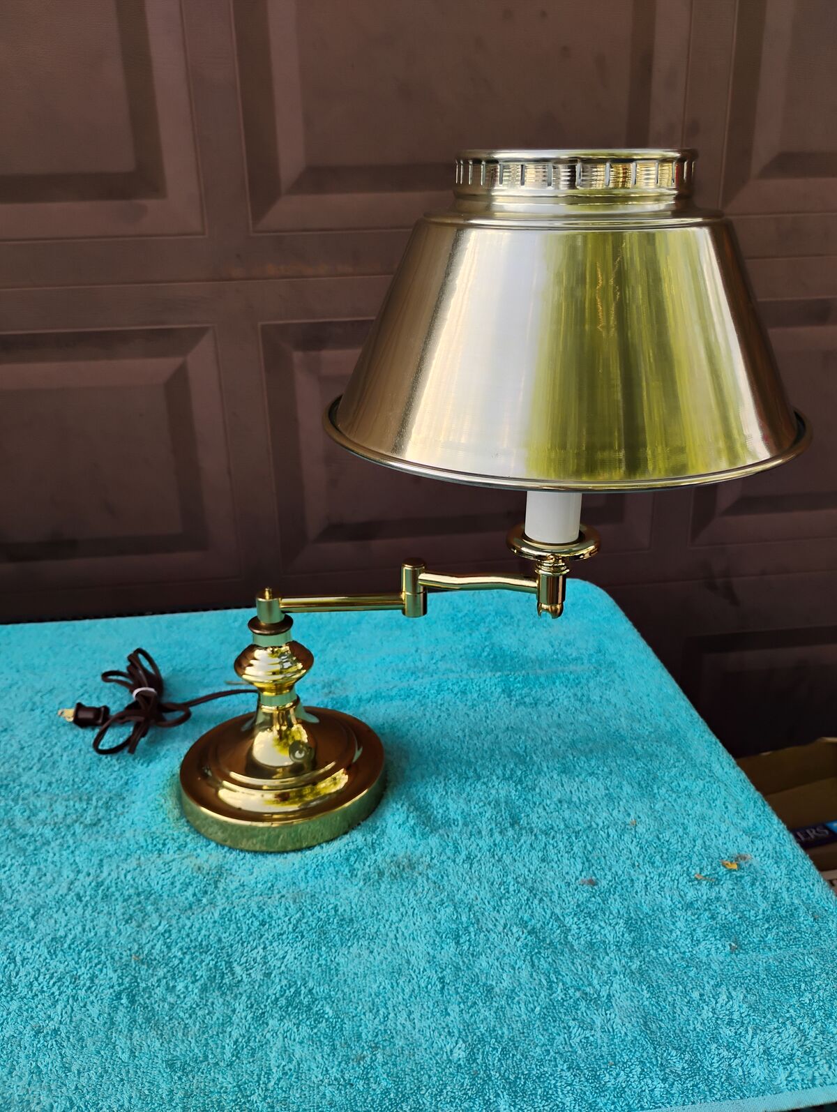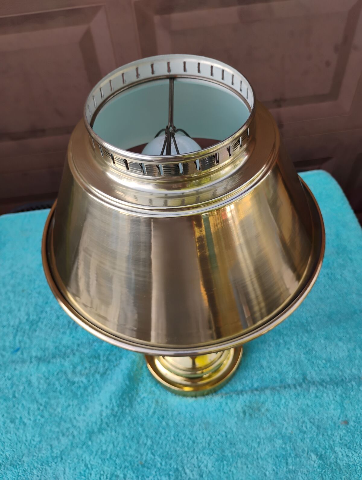VenmoNice little lamp. Brass Tole Style Shade. MCM size 17.25 tall 11 inch shade 6 at the bottom.
