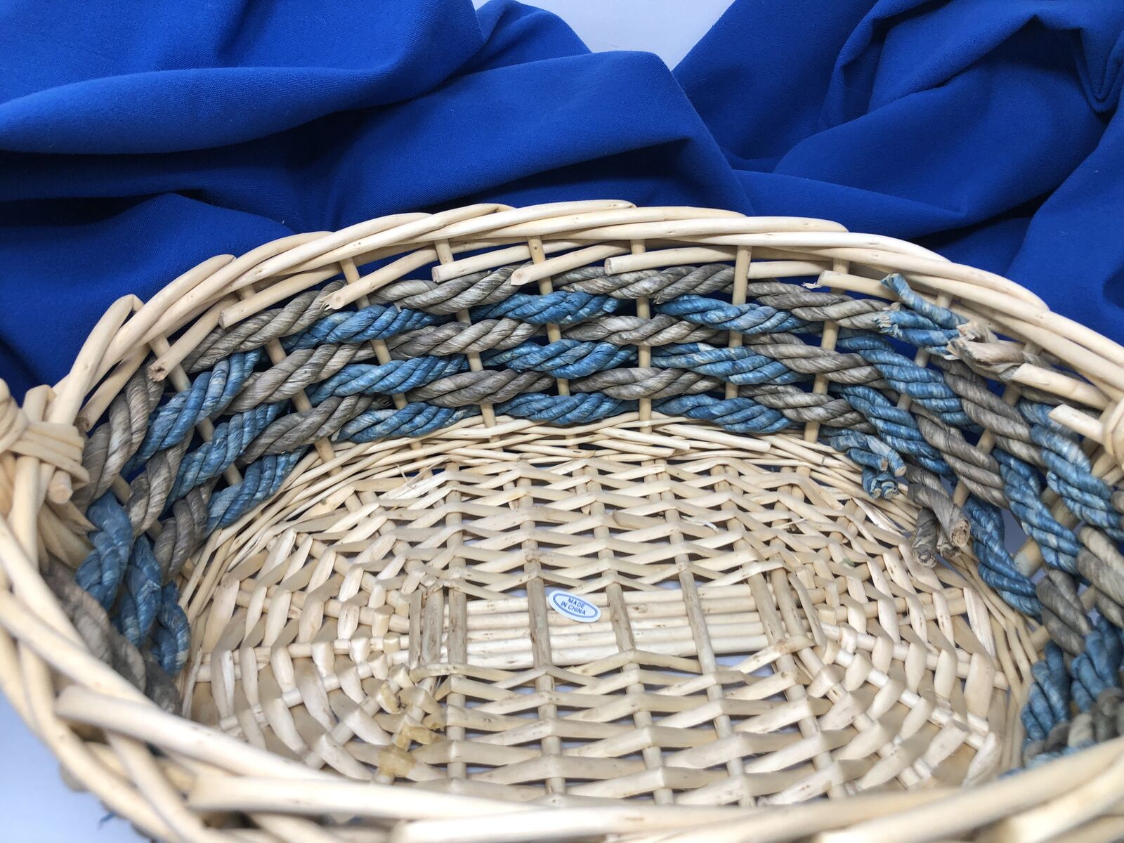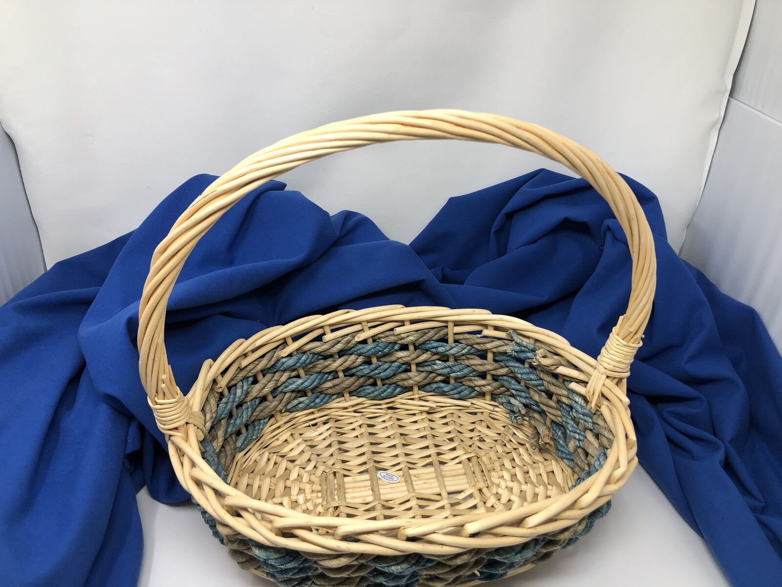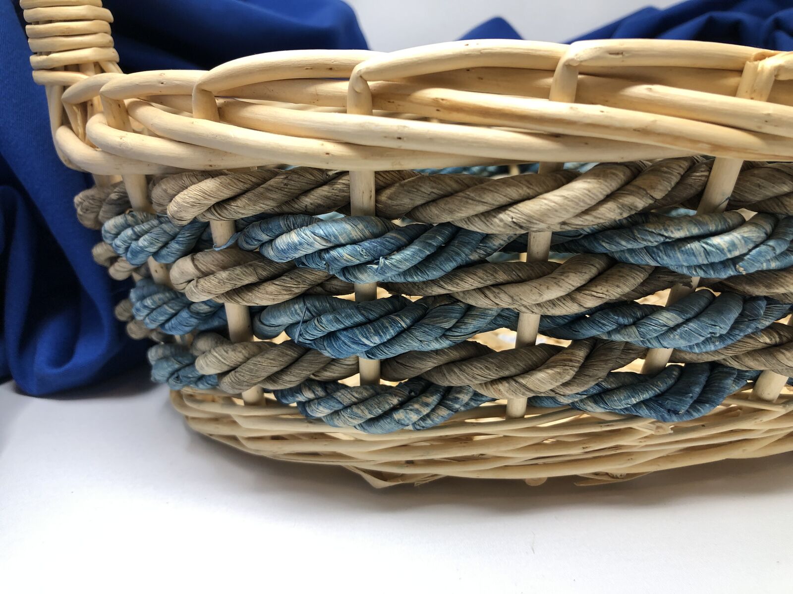 VenmoStylish Storage with a Pop of Color! Upgrade your space with this large oval-shaped wicker basket, crafted with thick, durable wicker and finished with a beautiful blue accent. Perfect for blankets, toys, laundry, or decorative displays. The sturdy handle makes it easy to carry from room to room. Functional. Elegant. Built to Last. 13.5" tall including handle X 14" long x 10" wide x 4.5" deep