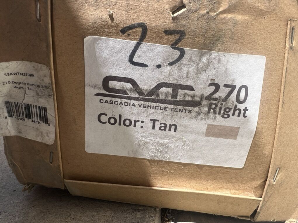 VenmoNew in box. Black case with tan awning. This is their new 2.3m (covers more area) batwing style 270 degree awning made to mount on the right hand side of your rig. Retails for $849 plus freight. No mount brackets as I'd need custom ones anyways. Top of the line quality. Cascadia Vehicle Tents is the manufacturer.
