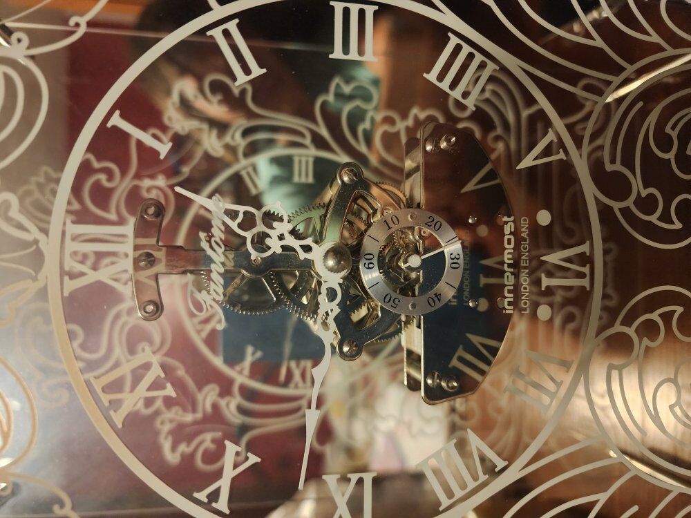 White vine and leaf scroll, mirrored rear glass and workings in inner area. The mirror gives the illusion of depth. Battery operated No chips or cracks Appx 14.5" tall 10" wide 3.5" deep.