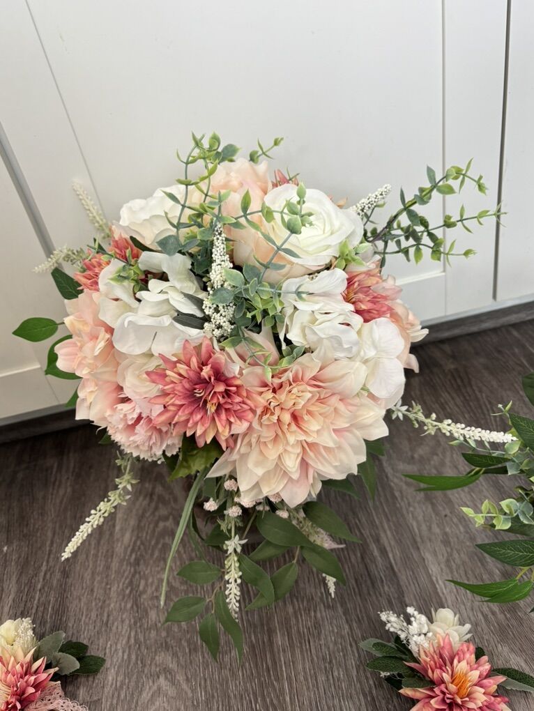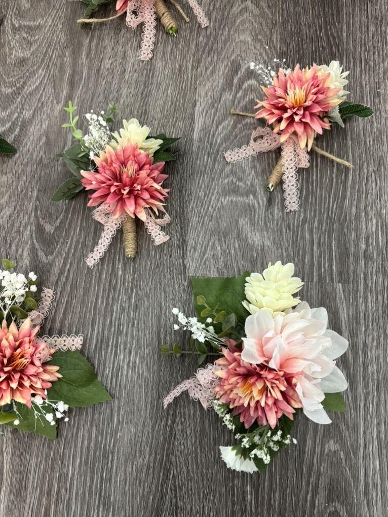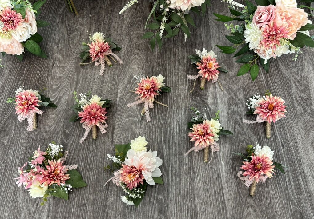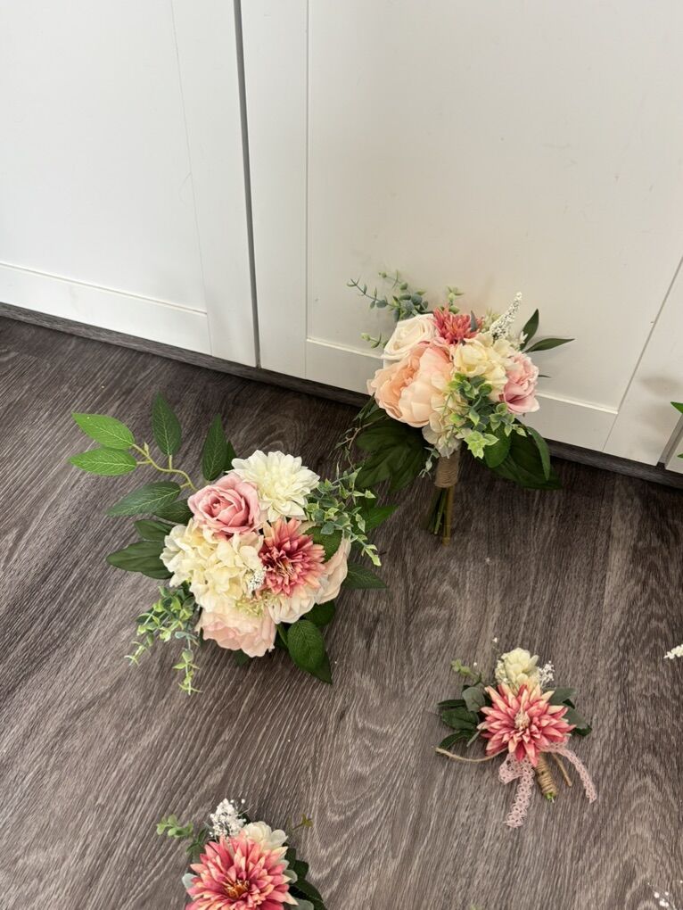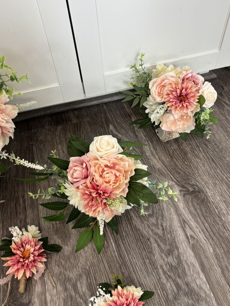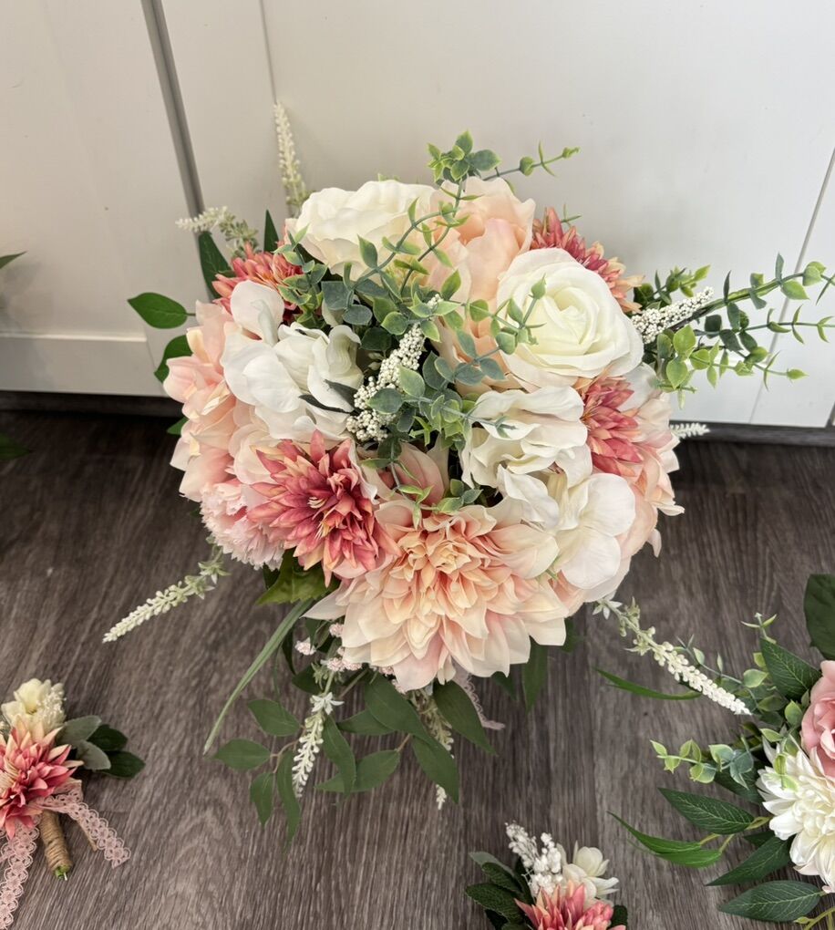 VenmoArtificial flowers and greenery sold as a set. The set includes: 1 bridal bouquet, 4 bridesmaids bouquets, 8 bouts and 2 wrist corsages. Can make 1 more bridesmaids bouquet if needed.