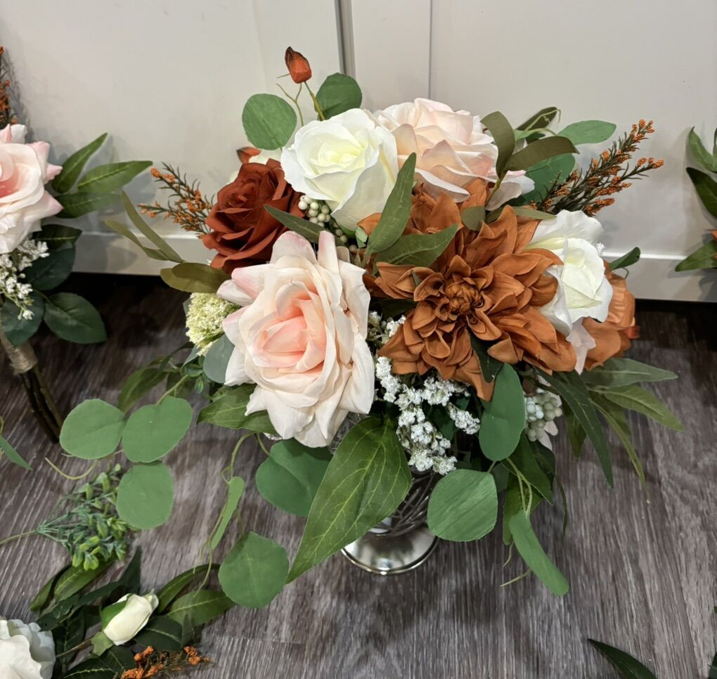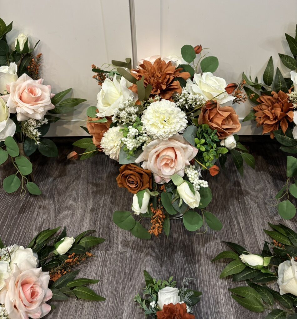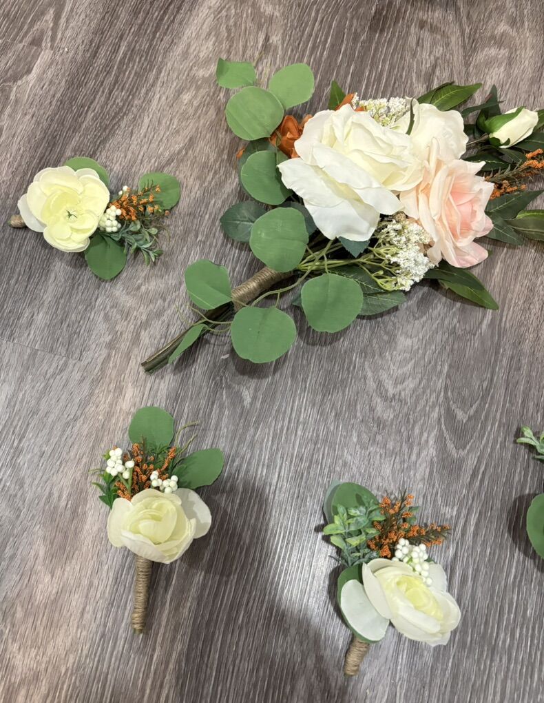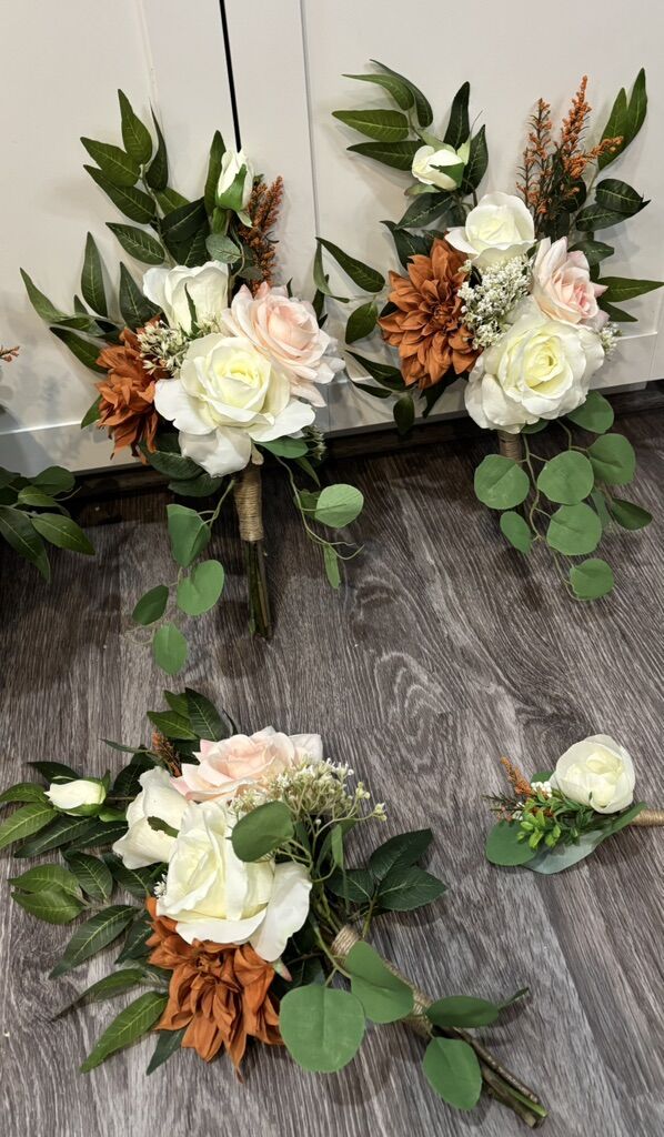 VenmoMade with artificial flowers and greenery. This is sold as a set. Set includes: 1 cascading bridal bouquet, 6 bridesmaids bouquets, 9 bouts, 2 wrists corsages and 1 toss bouquet. Pink orange terra cotta