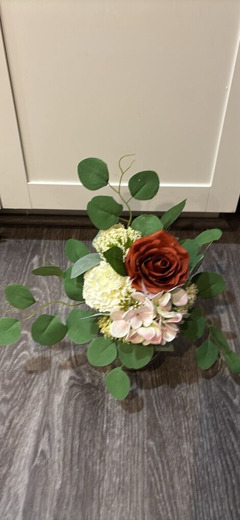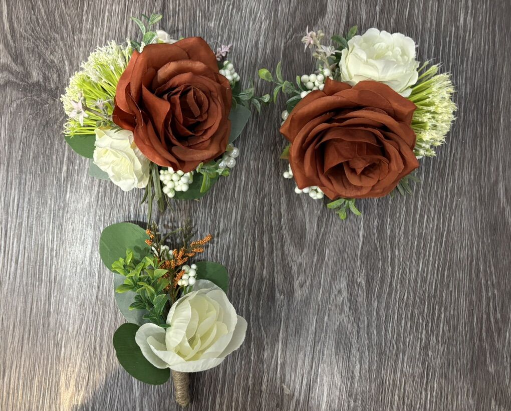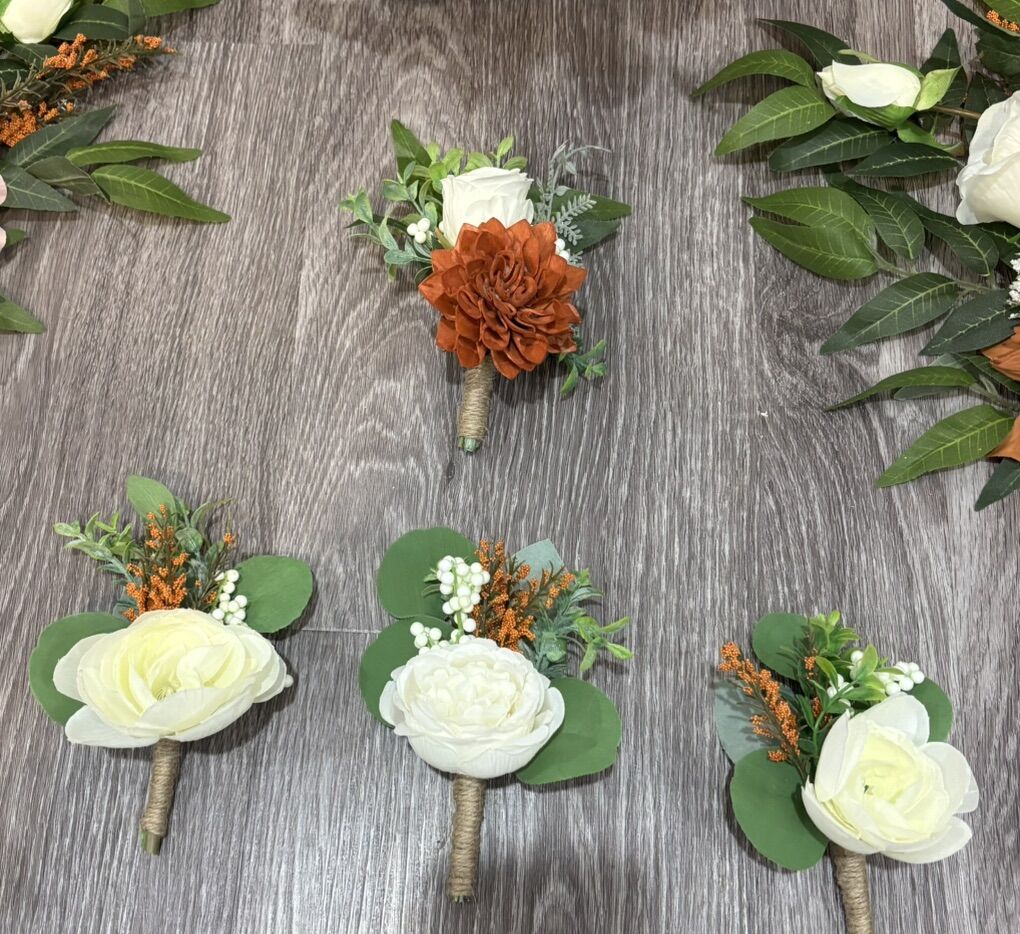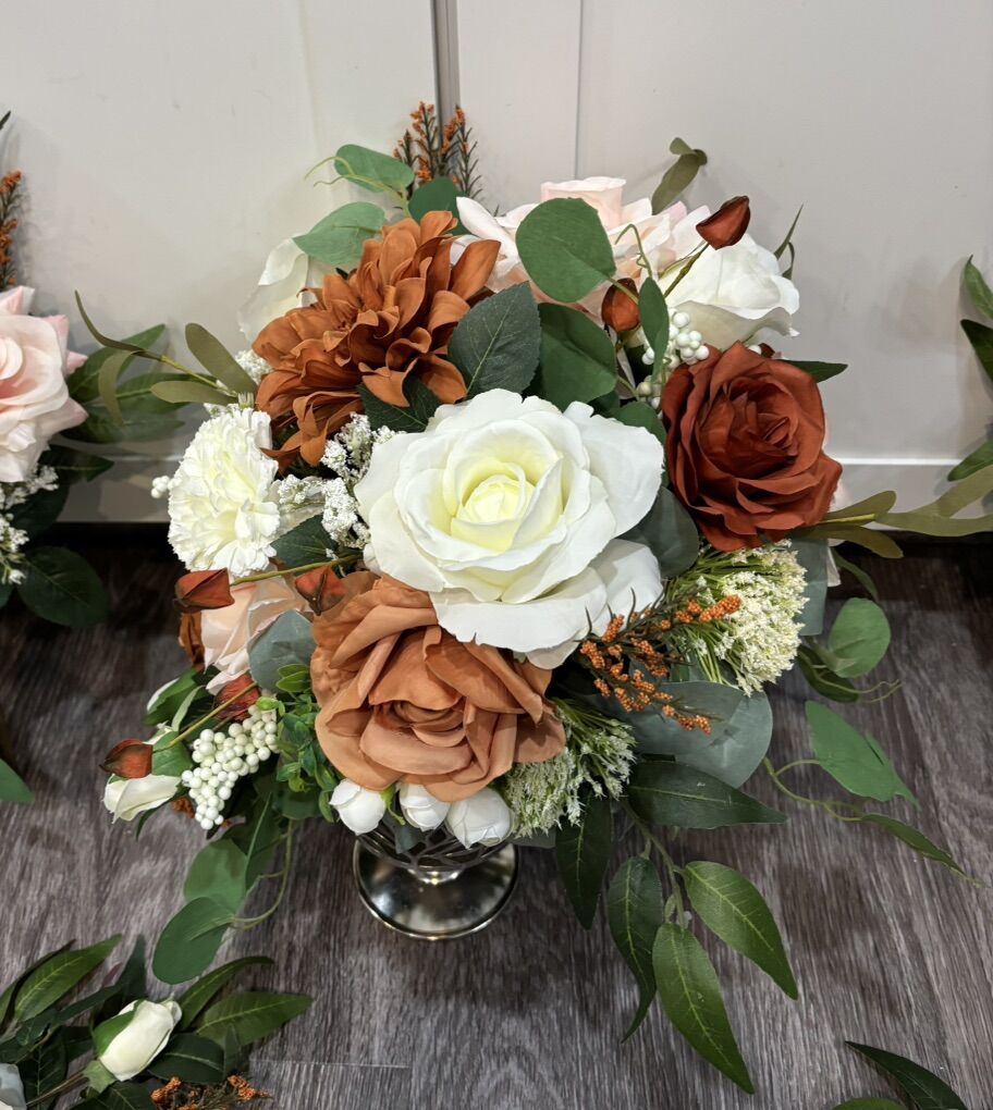 VenmoMade with artificial flowers and greenery. This is sold as a set. Set includes: 1 cascading bridal bouquet, 6 bridesmaids bouquets, 9 bouts, 2 wrists corsages and 1 toss bouquet. Pink orange terra cotta