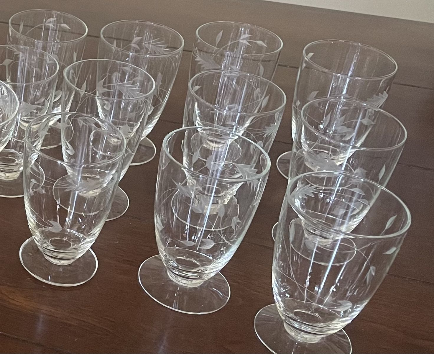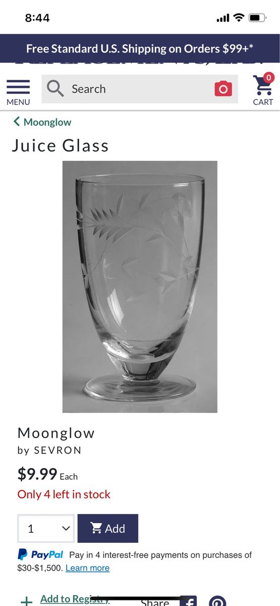 I have a beautiful set of blown glass Moonglow by Sevron glasses from the 1950s. There are 11 juice glasses. They are 4 inches tall and 2 3/8 inches across. The last picture is from replacements.com and shows the juice glasses sell for $9.99 each ($109.89 total). I’m asking $20 for all of them. See my other ads for jewelry, artwork, home decor and more.