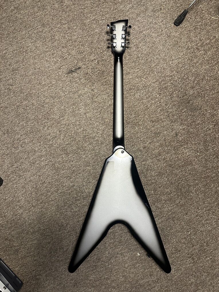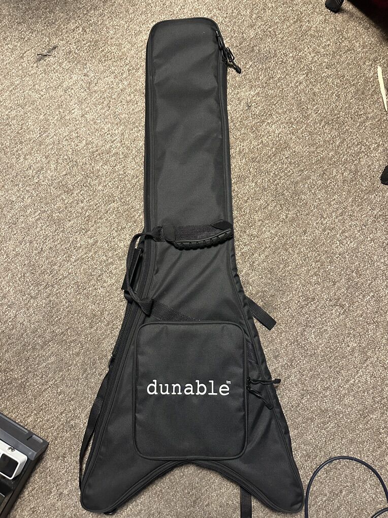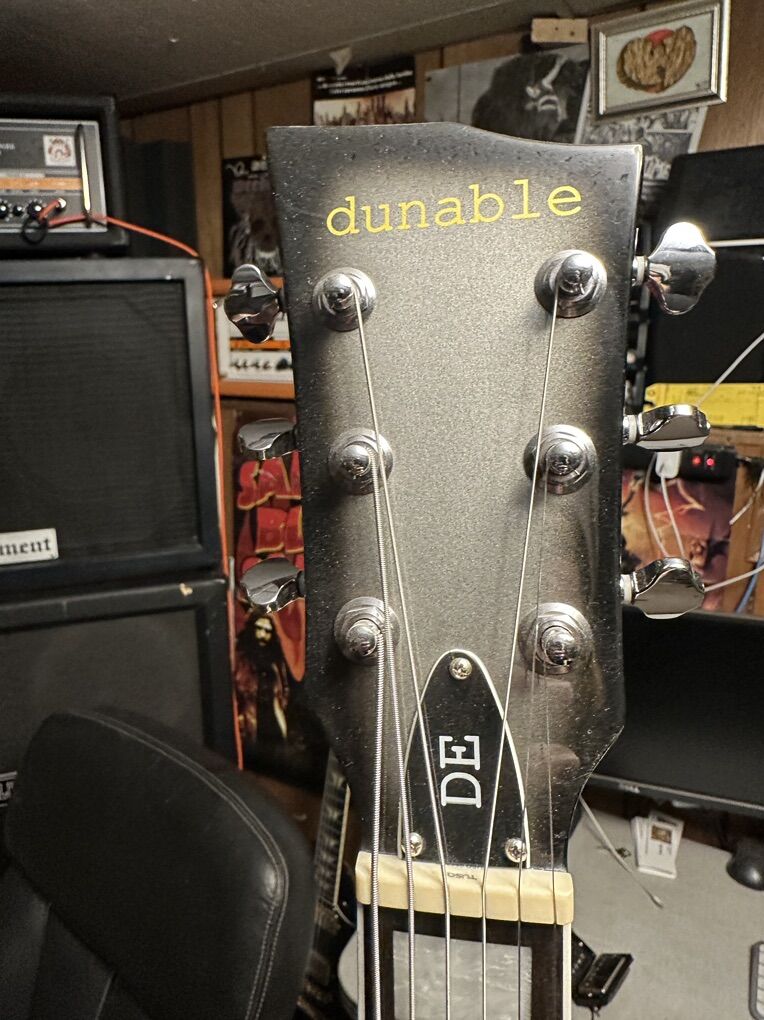 SCALE LENGTH: 25.5 NECK PROFILE: 1.65 nut width, .79 thick at 1st, .85 at 12th, Medium C profile ORIENTATION: right handed NECK: mahogany | ebony | white binding NUT: Graphtech Tusq FRETS: jumbo nickel silver SIDE DOTS: standard VOLUME CONTROLS: one volume TONE CONTROLS: one tone HARDWARE COLOR: Chrome FINGERBOARD INLAY: small dots BODY: mahogany BODY TOP WOOD: none BRIDGE PICKUP: Dunable Cthulhu (12k, A5) NECK PICKUP: Dunable Cthulhu (10k, A5) TUNING KEYS: locking tuners BRIDGE: tune o matic and stop tail FINISH TOP COAT: gloss polyurethane FINISH COLOR: Silverburst Gloss CASE: padded Dunable gig bag