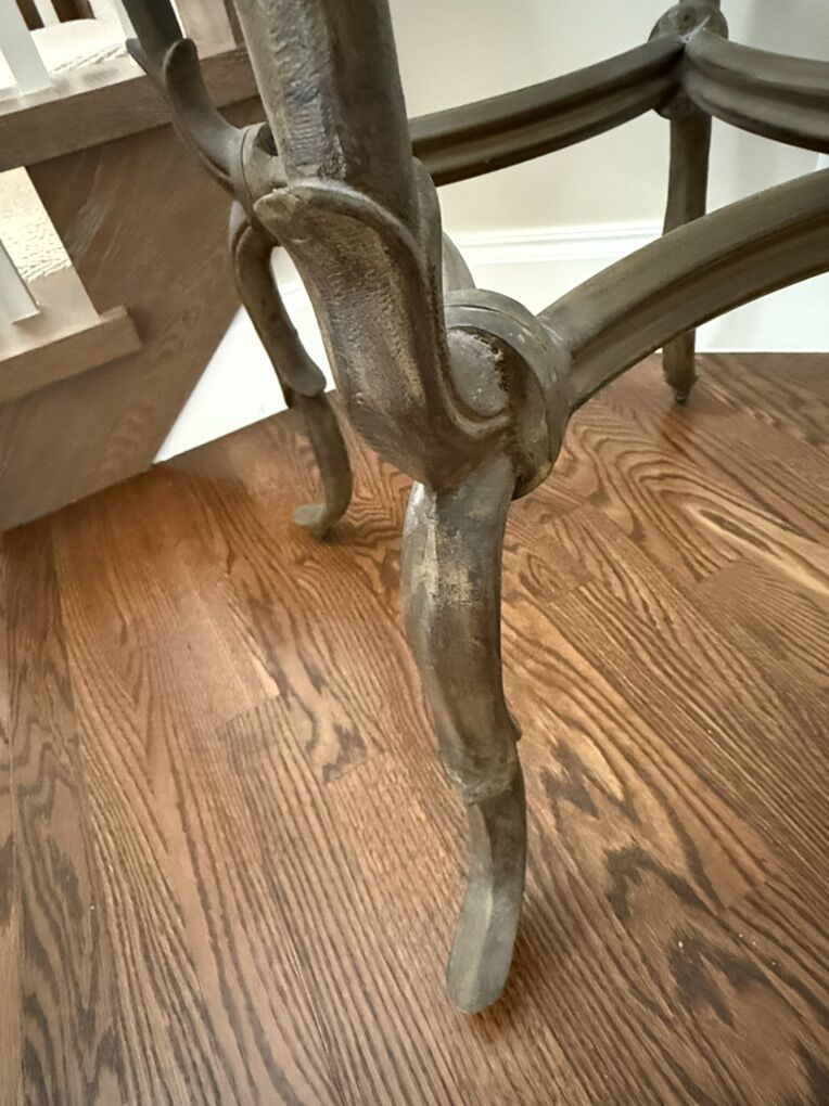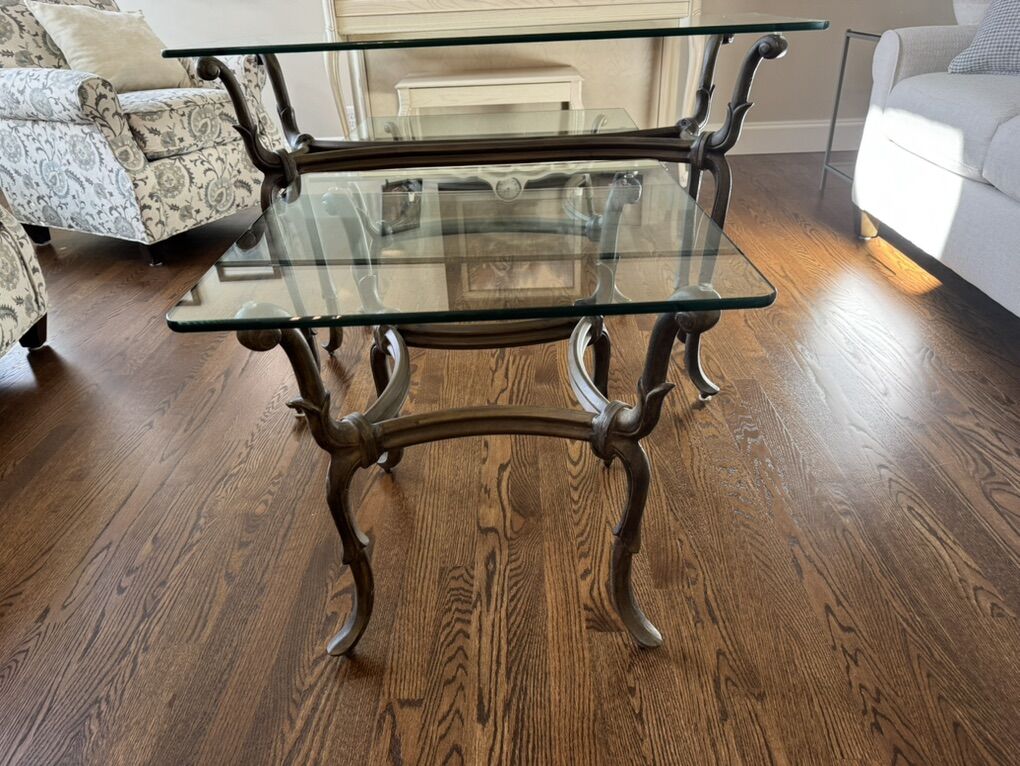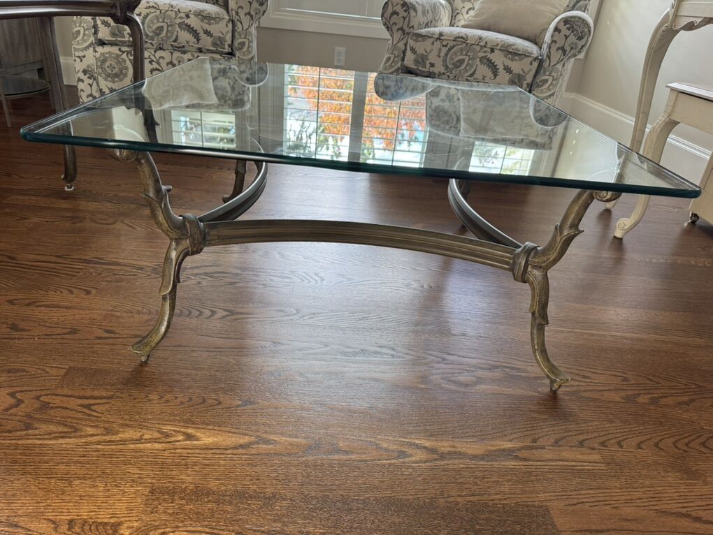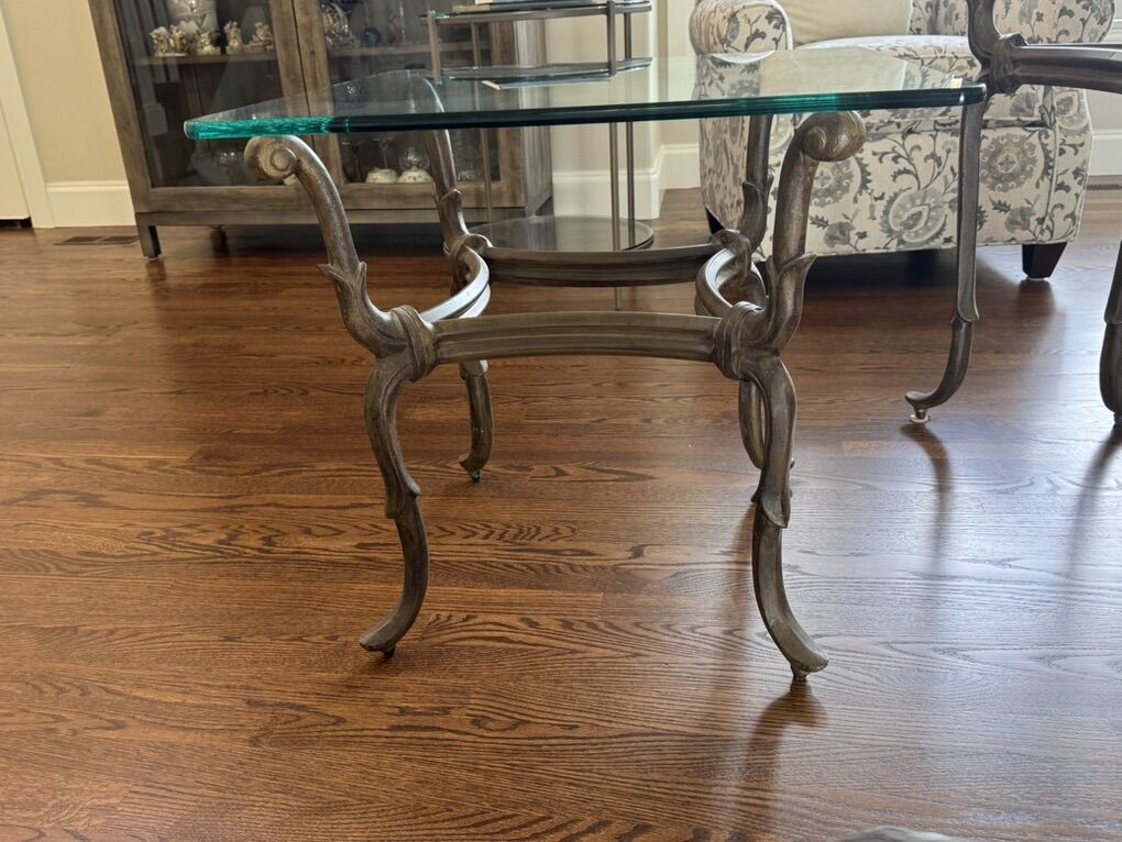 3 pc glass and metal family or living room furniture set. Glass is 1/2” thick. Metal finish is a rustic brown patina finish. Coffee table measures 36” square X 16 1/2” high. Sofa table measures 44” long X 18” wide X 30” high. End table measures 24” square X 22 1/2” high. Sold as set only.