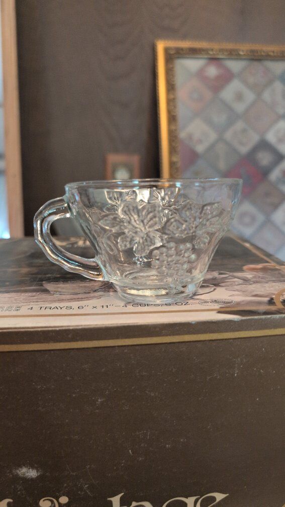 Contents: The set includes 4 glass trays (6" x 11") and 4 glass cups (6 oz.). Design: Features a clear glass with a grape and vine pattern, and the trays have an indentation to hold the matching cups.
