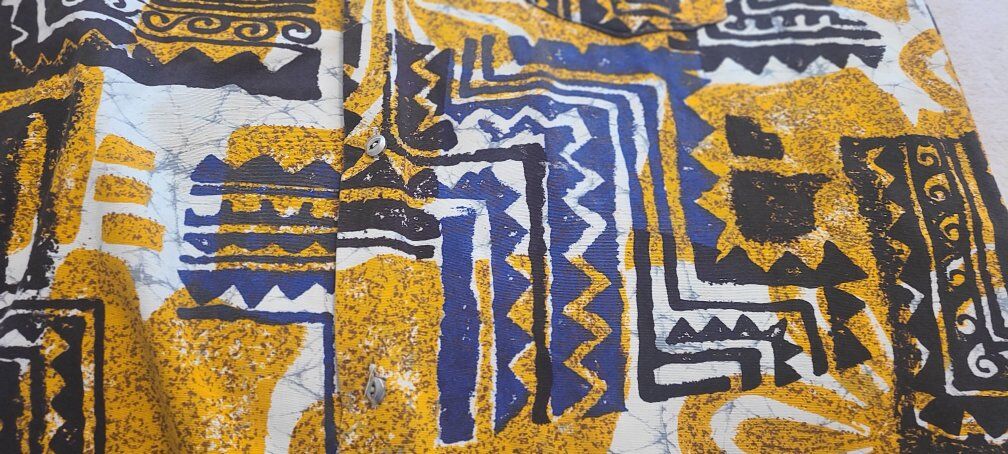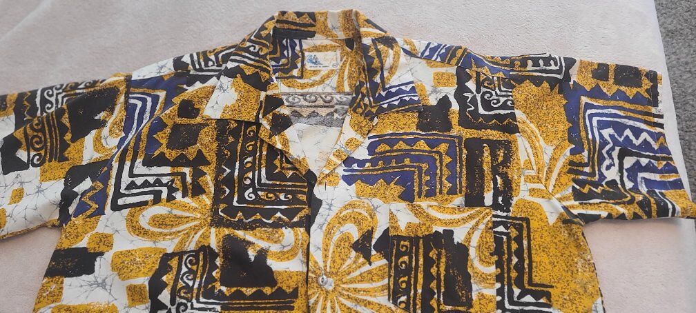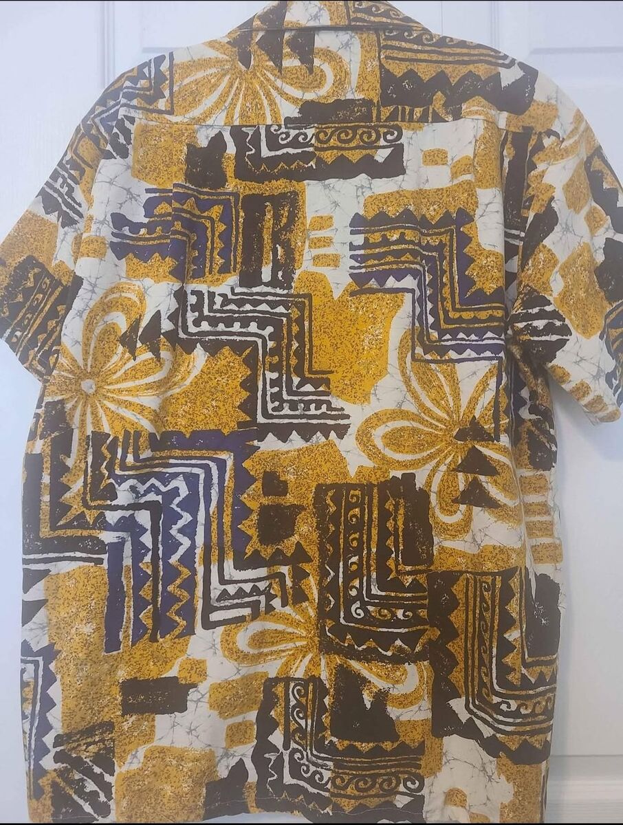 ZelleRare 1960's vintage Hawaiian shirt ..rare "Surfer " label shirt . Size XL . In mint condition . 29" in length 23" pit to pit . Features vivid colors of golden mustard..purple and black .