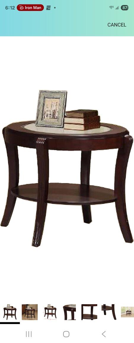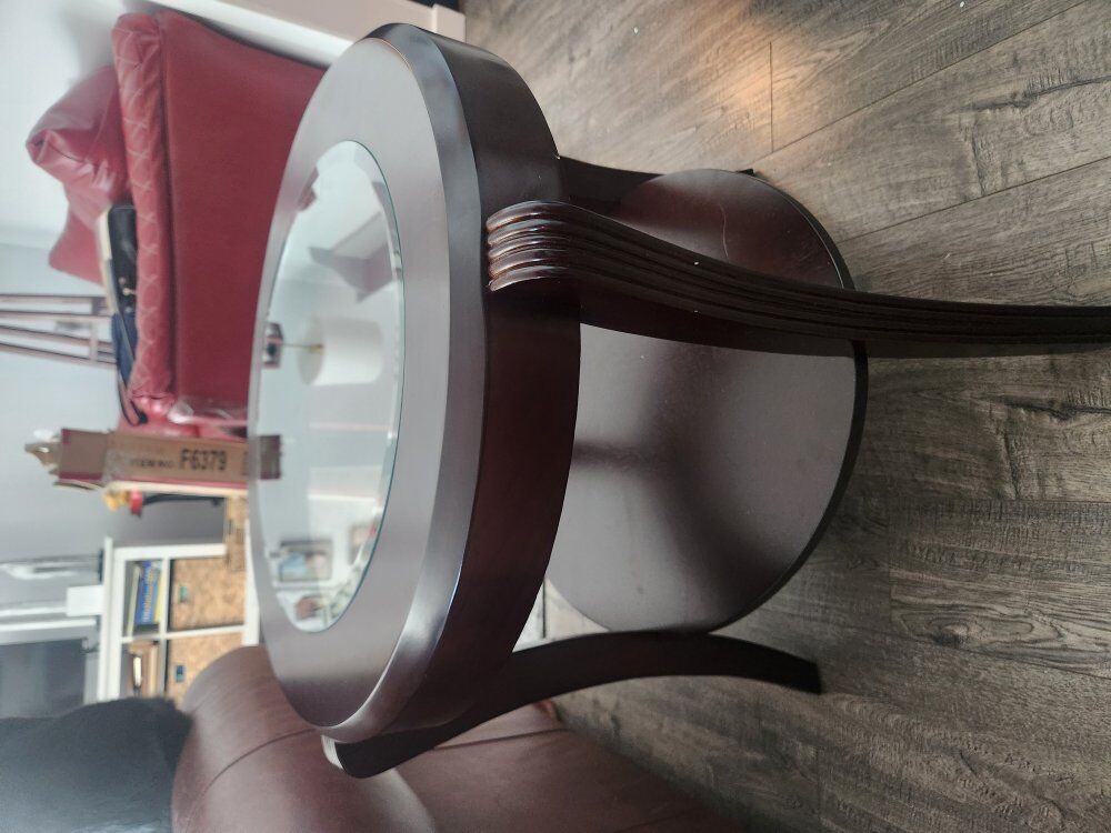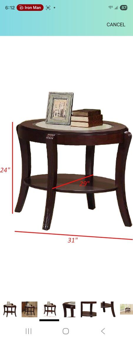 Additional lower wood shelf platform to showcase decorative items Dark cherry brown finish that is Constructed with anti warp and water resistant solid wood , MDF and veneer for longevity and style are supported on solid curved and flared wood legs 5mm thick clear tempered glass tabeletop in an oval shape with broad apron construction for ultimate strength Dimensions:29L x 31W x 24H and in inches