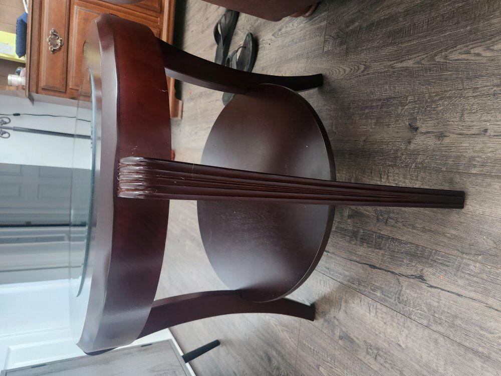 Brand: Benzara Product Dimensions: 29"D x 31"W x 24"H Frame Material: Wood Color: Brown and Clear Top Material Type: Tempered Glass Shape: Round