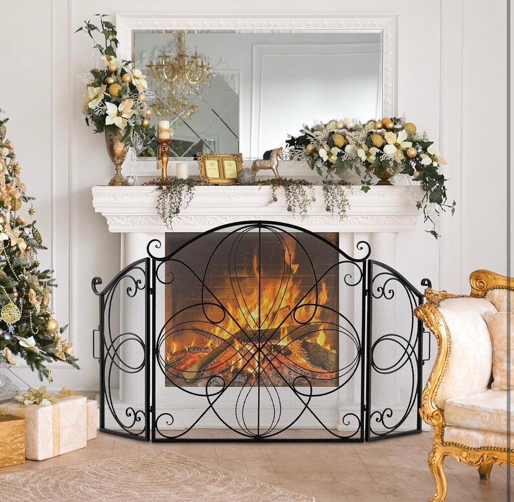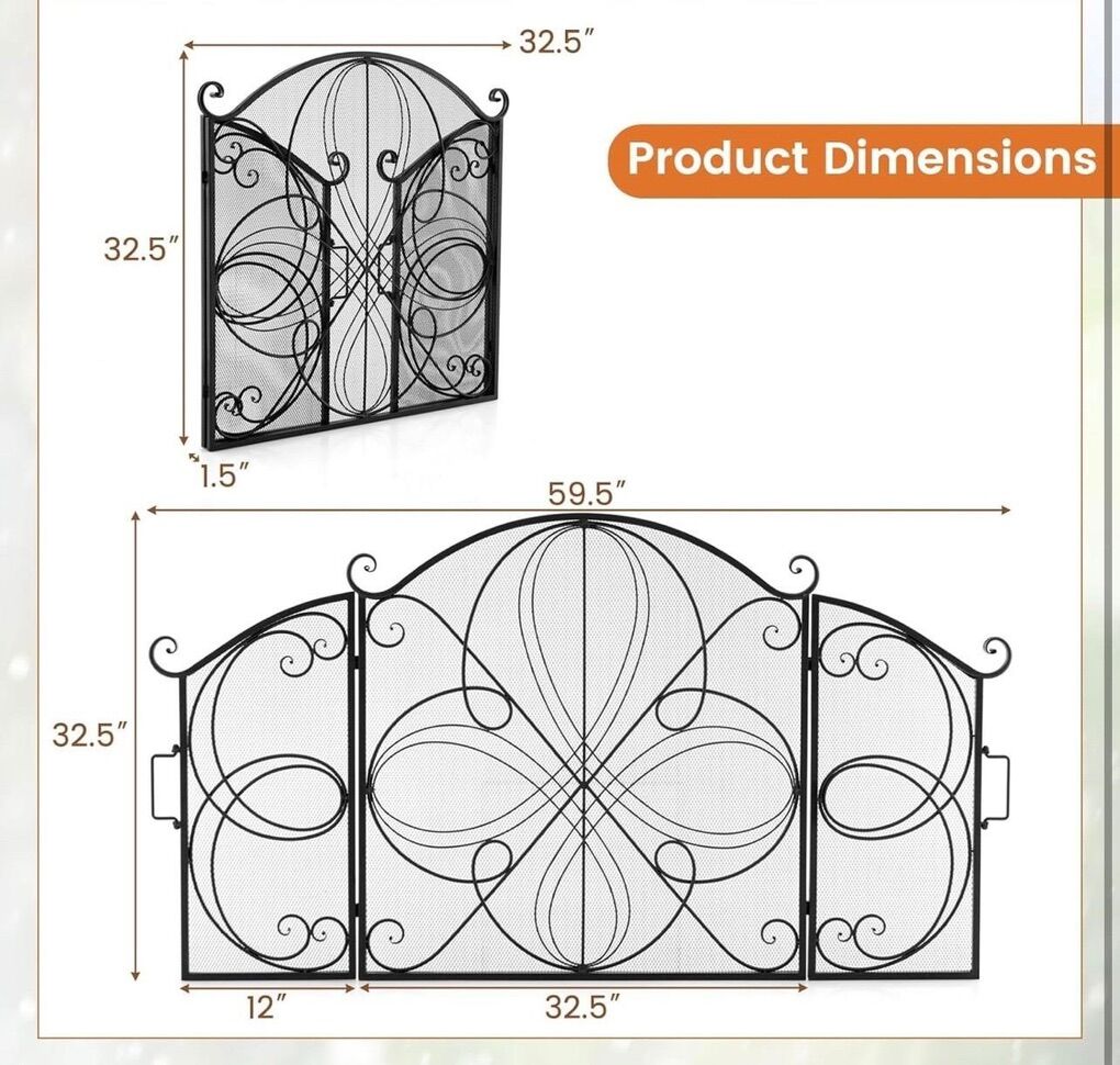 Tangkula 59.5 x 32.5 Inch Fireplace Screen, 3-Panel Folding Spark Guard w/Floral Pattern, Decorative Mesh Fireplace Barrier, Heavy-Duty Metal Fireplace Fence Guard for Living Room
