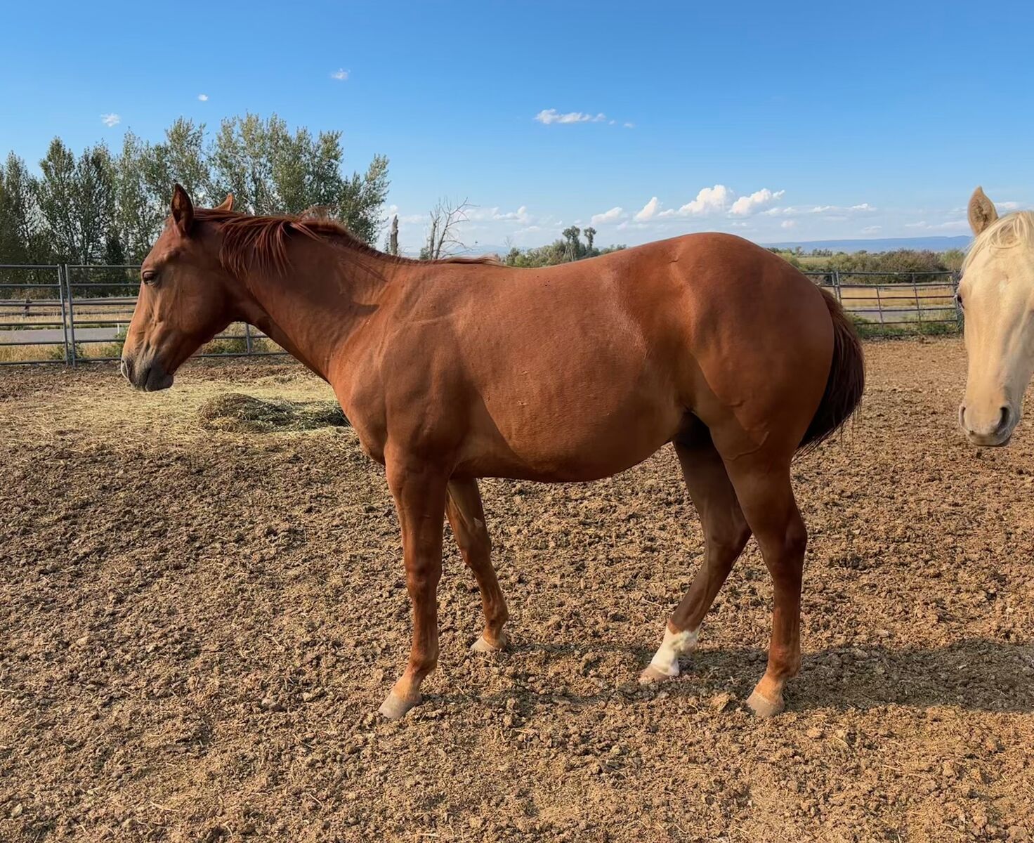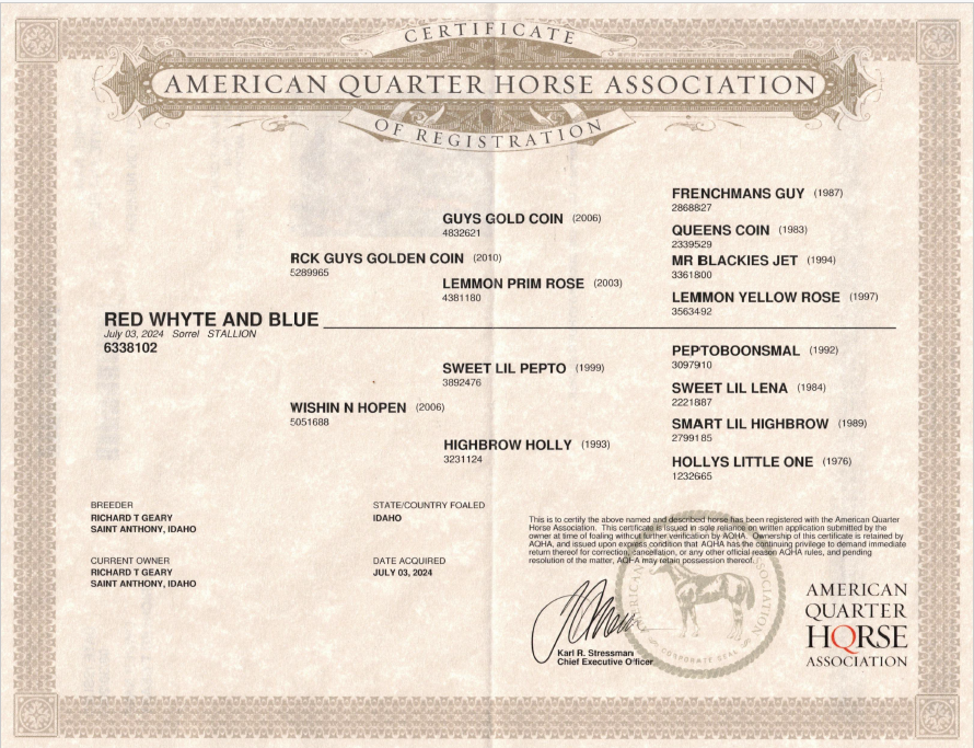 Patriot is a sorrel colt born on July 3, 2024 out of Wishen N Hopen by Guys Golden Coin. He is AQHA registered under the name "Red Whyte and Blue". He comes from performance lines on his sires side with Frenchman’s Guy and his Dam’s with Peptoboonsmal. As he matures he will be a stocky and athletic build with a little bit of height (15hh-15.3hh). Both his sire and dam are extremely friendly and he has picked this up as well. He loves attention and very curious. He's had some nose warts burned off a couple of weeks ago, but they are healing up super well and will not cause any problems!