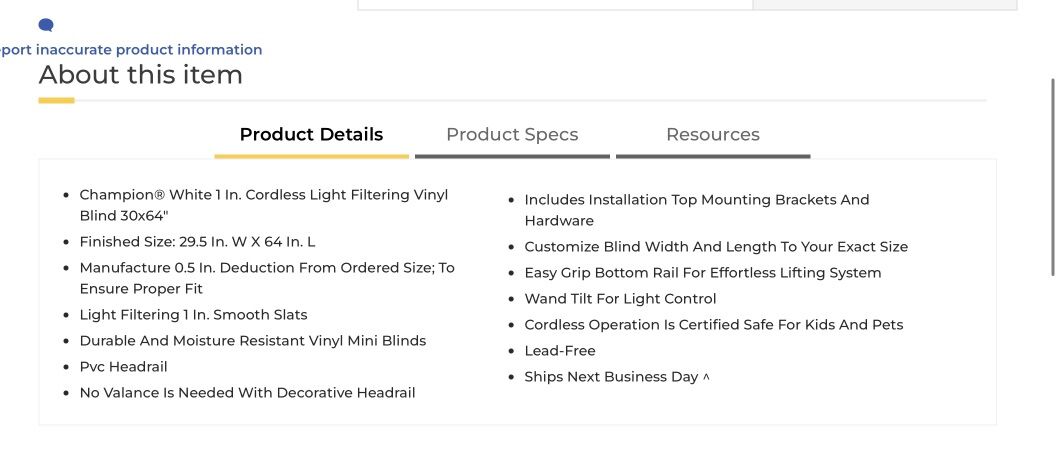 Champion® Alibaster1 In. Cordless Light Filtering Vinyl Blind 30x64 • Finished Size: 29.5 In. W X 64 In. L • Manufacture 0.5 In. Deduction From Ordered Size; To Ensure Proper Fit • Light Filtering 1 In. Smooth Slats • Durable And Moisture Resistant Vinyl Mini Blinds • Pvc Headrail • No Valance Is Needed With Decorative Headrail • Includes Installation Top Mounting Brackets And Hardware • Customize Blind Width And Length To Your Exact Size • Easy Grip Bottom Rail For Effortless Lifting System • Wand Tilt For Light Control • Cordless Operation Is Certified Safe For Kids And Pets • Lead-Free