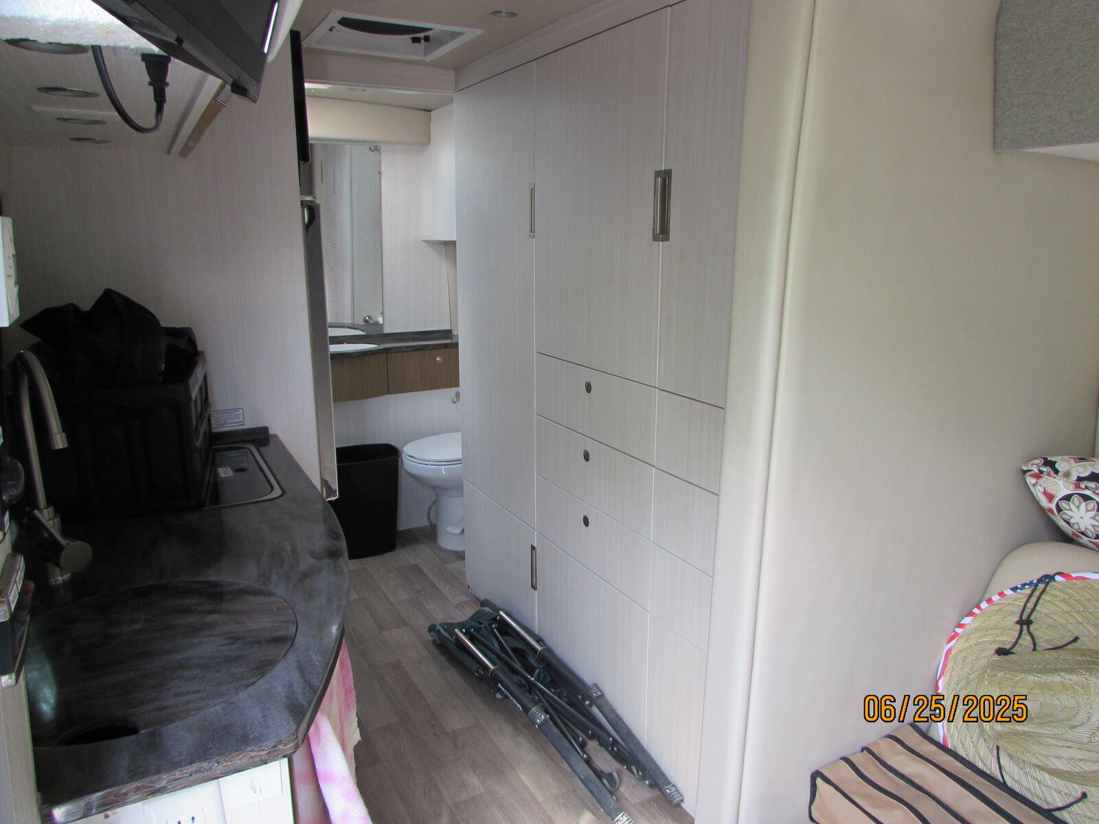 Has 69848 miles, toilet, shower, sinks, refridgerator, cooktop, microwave, slide, solar, new batteries, electric awning, Diesel engine , generator ( propane )Runs and drives great. Custom cover.