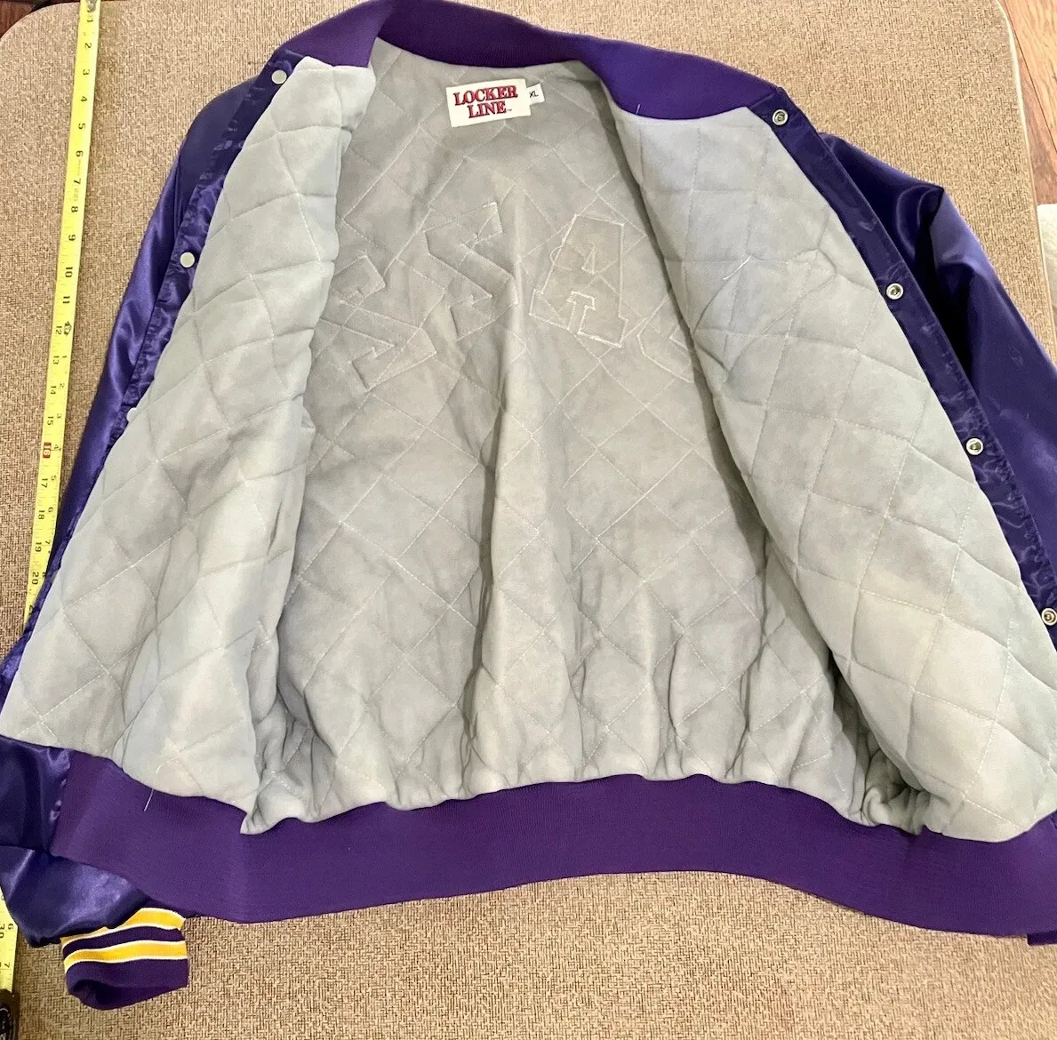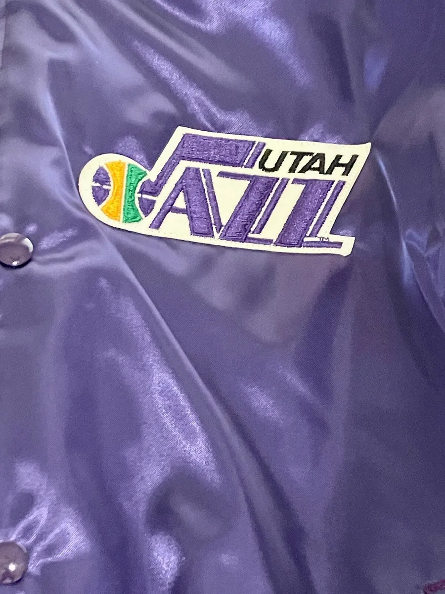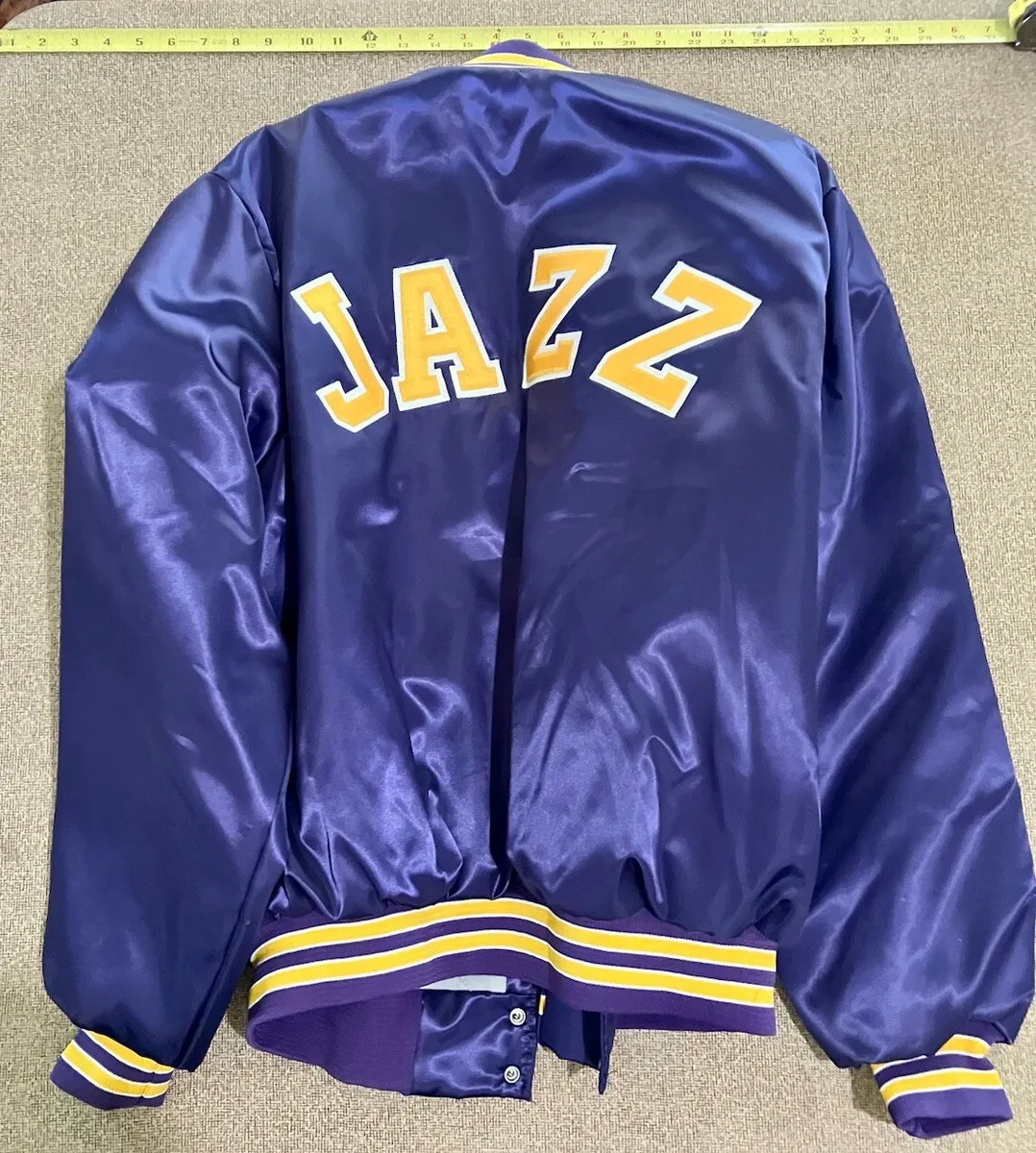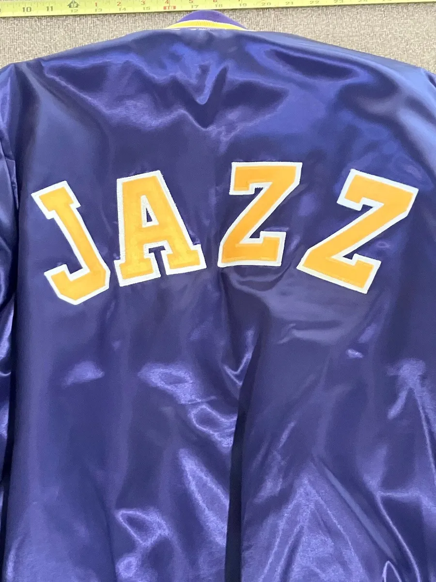 PayPalThe Utah Jazz Purple Satin Bomber Style Jacket in size XL is a vintage 80's Locker Line NBA collectible. Made of cotton with a satin fabric type, this jacket features a regular fit and is designed in a bomber jacket style. It includes elastic waist, limited edition design, and pockets, making it a unique and stylish addition to any retro sports enthusiast's wardrobe. The purple color and sports theme add to the overall appeal of this one-of-a-kind jacket.