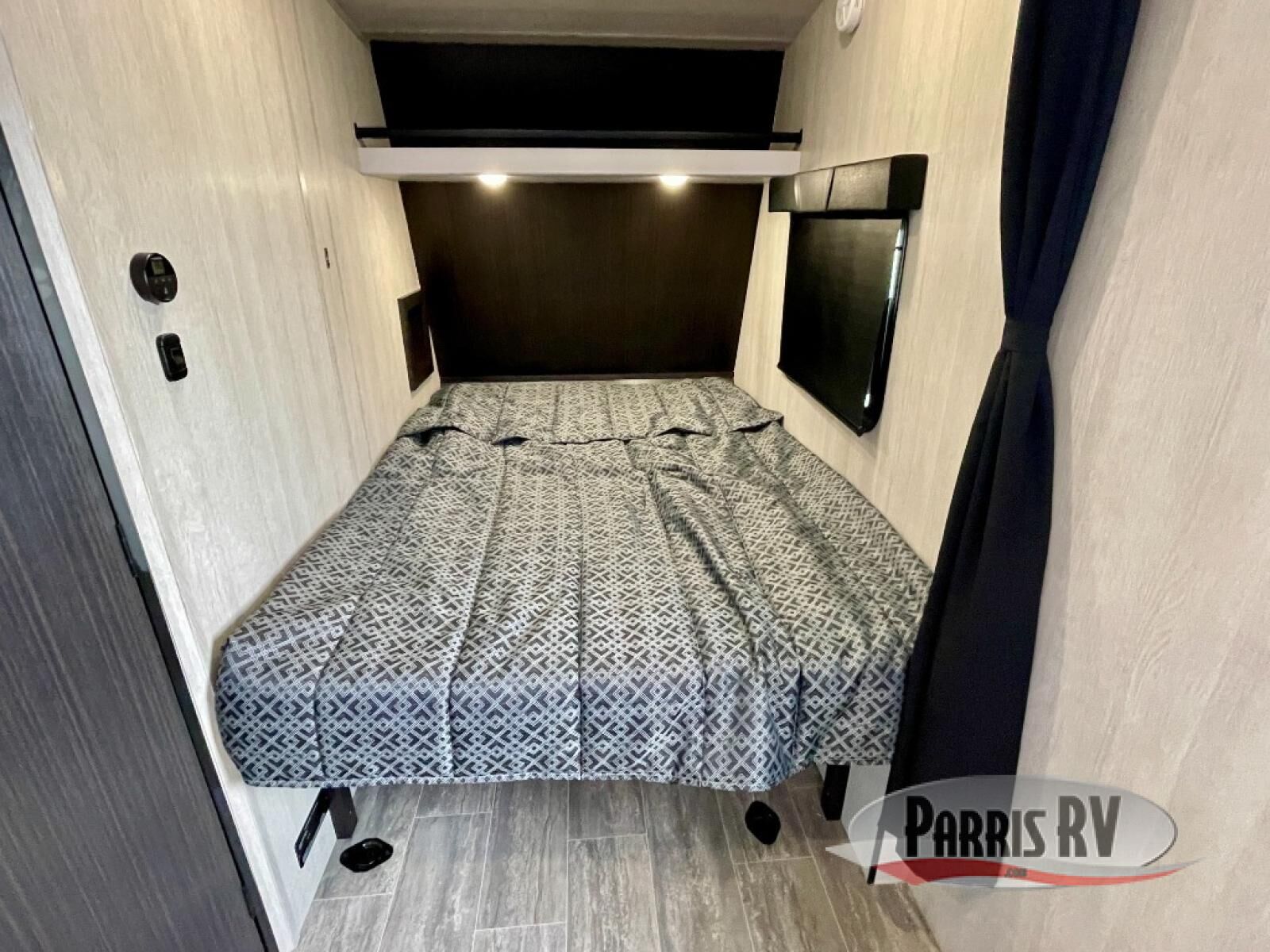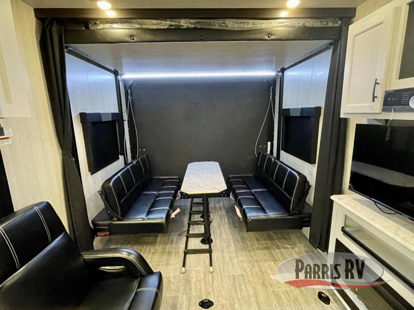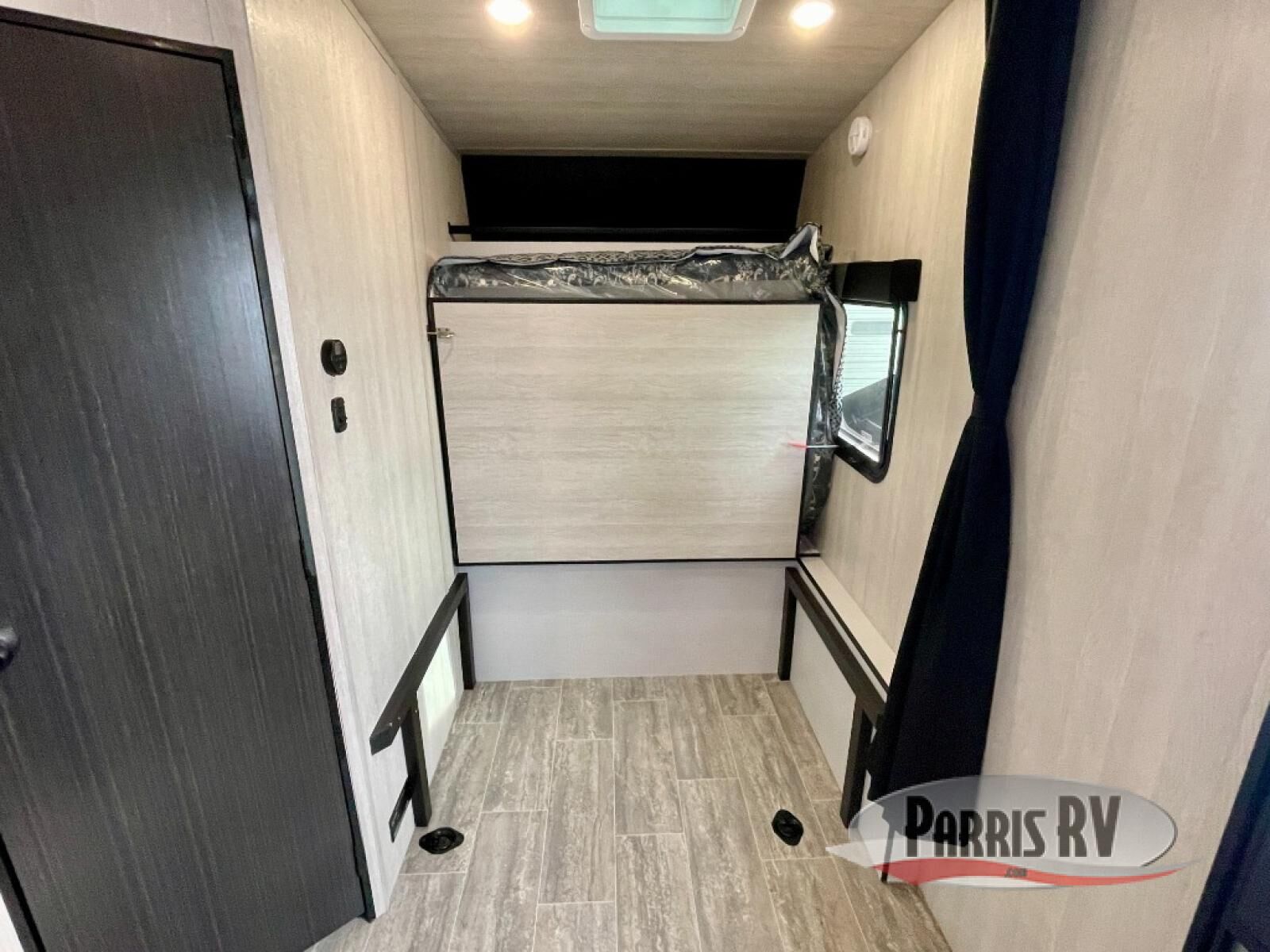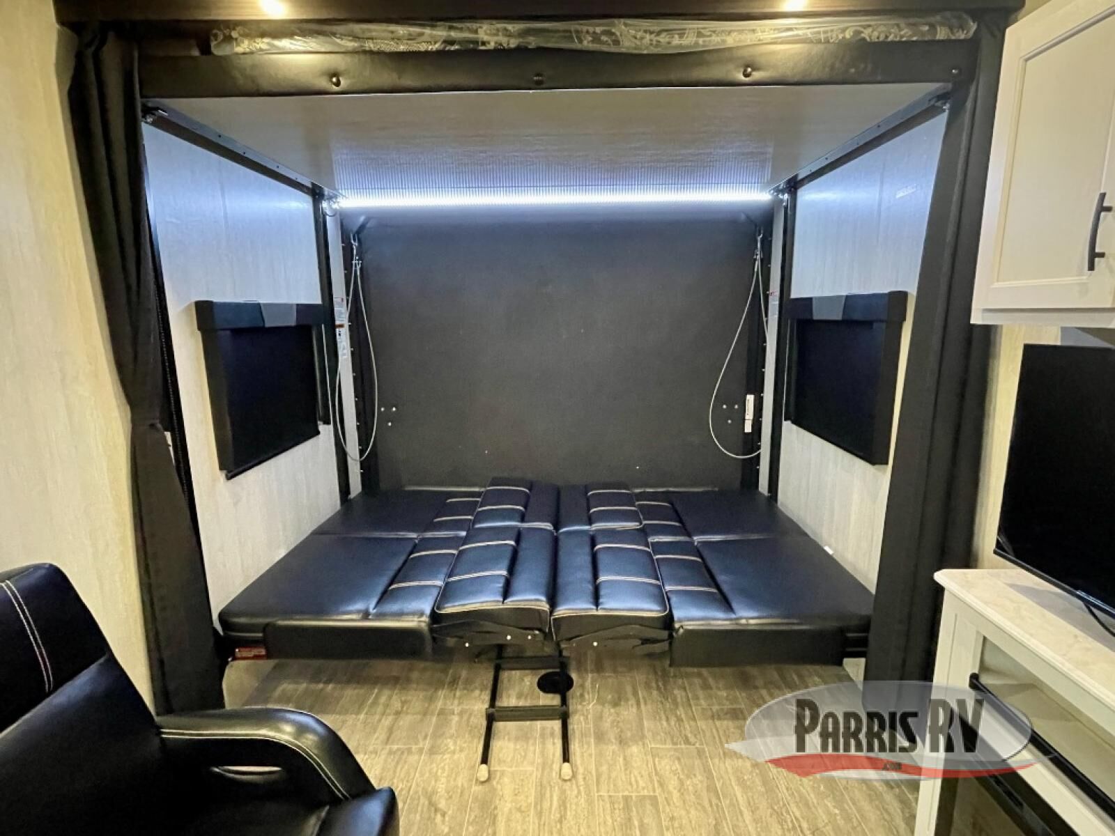 This simple, but convenient toy hauler is perfect for your riding weekends at the lake. It resembles model R2015XL, except the bath and bedroom flipped places in the layout. There is a spacious garage and a 7' ramp door to easily unload your toys. You can relax on the opposing rear power dinette with a single bed above for your guests. The front corner flip-up bed is sure to bring comfort, and the full bath lets you clean up each day. This model includes a three burner cooktop, an 10 cu. ft. 12V refrigerator, and a microwave oven to cook meals each day. Head outdoors to find a 200W solar panel, a patio awning, four stabilizer jacks, and exterior speakers to name a few conveniences!