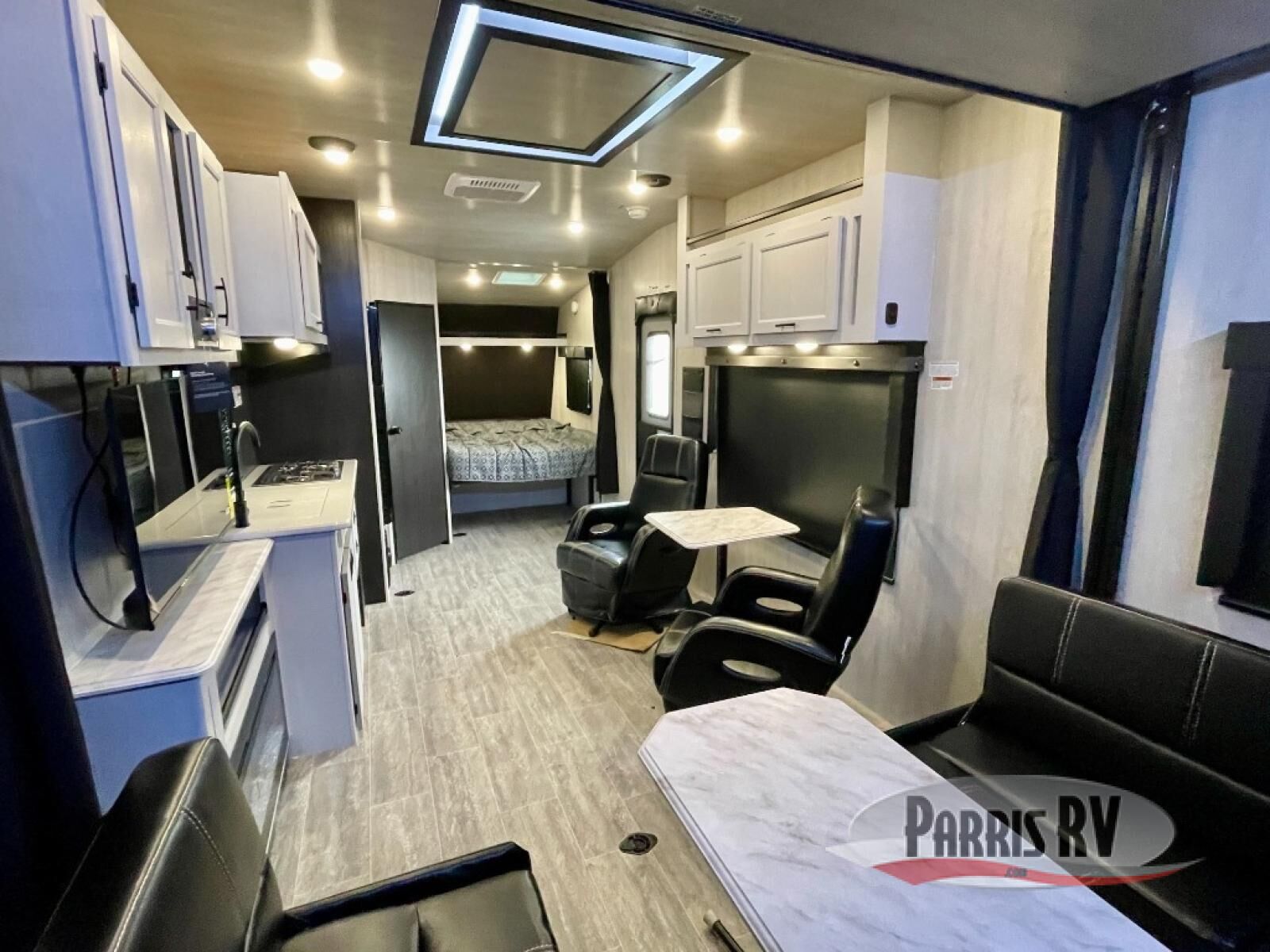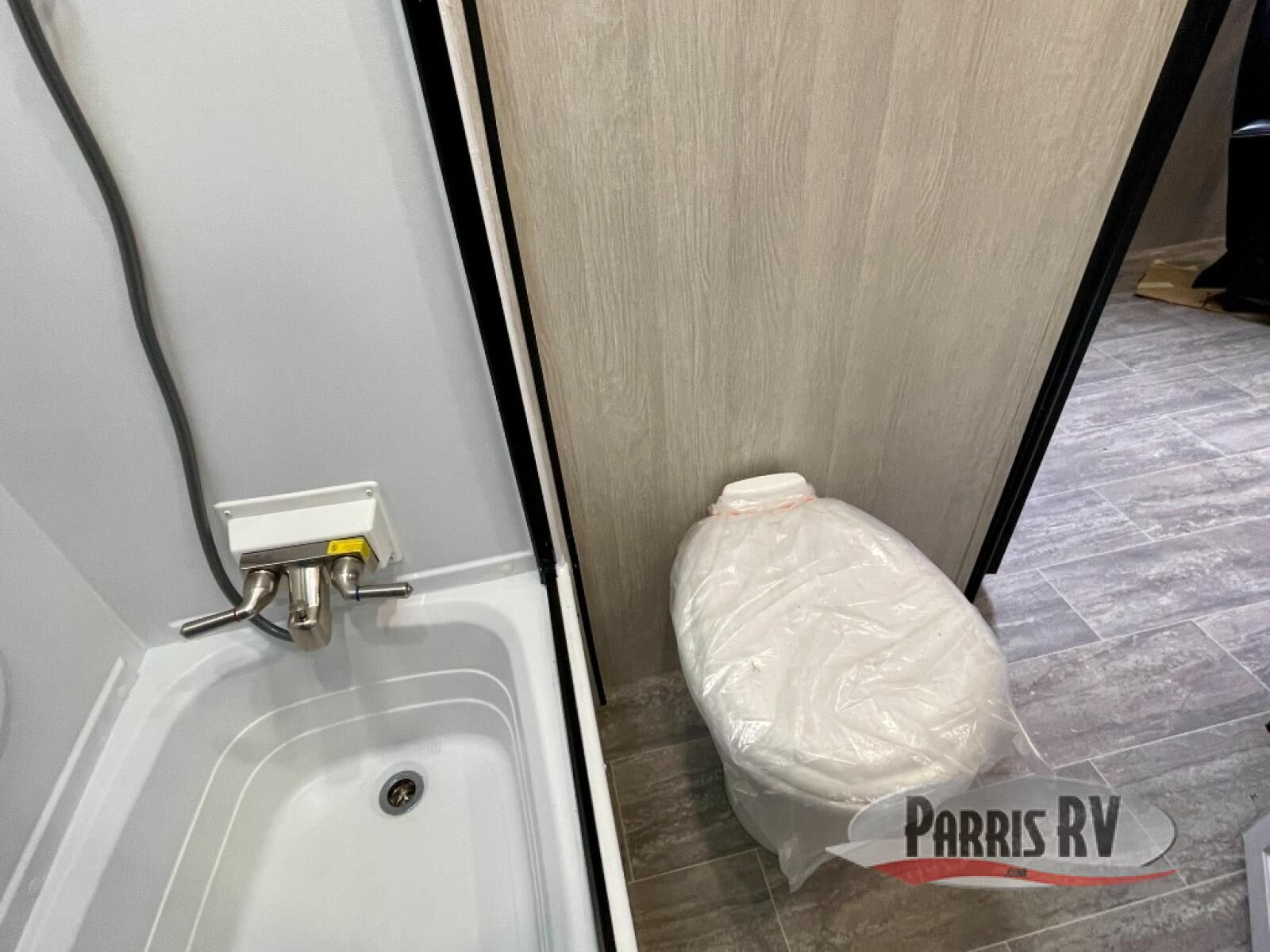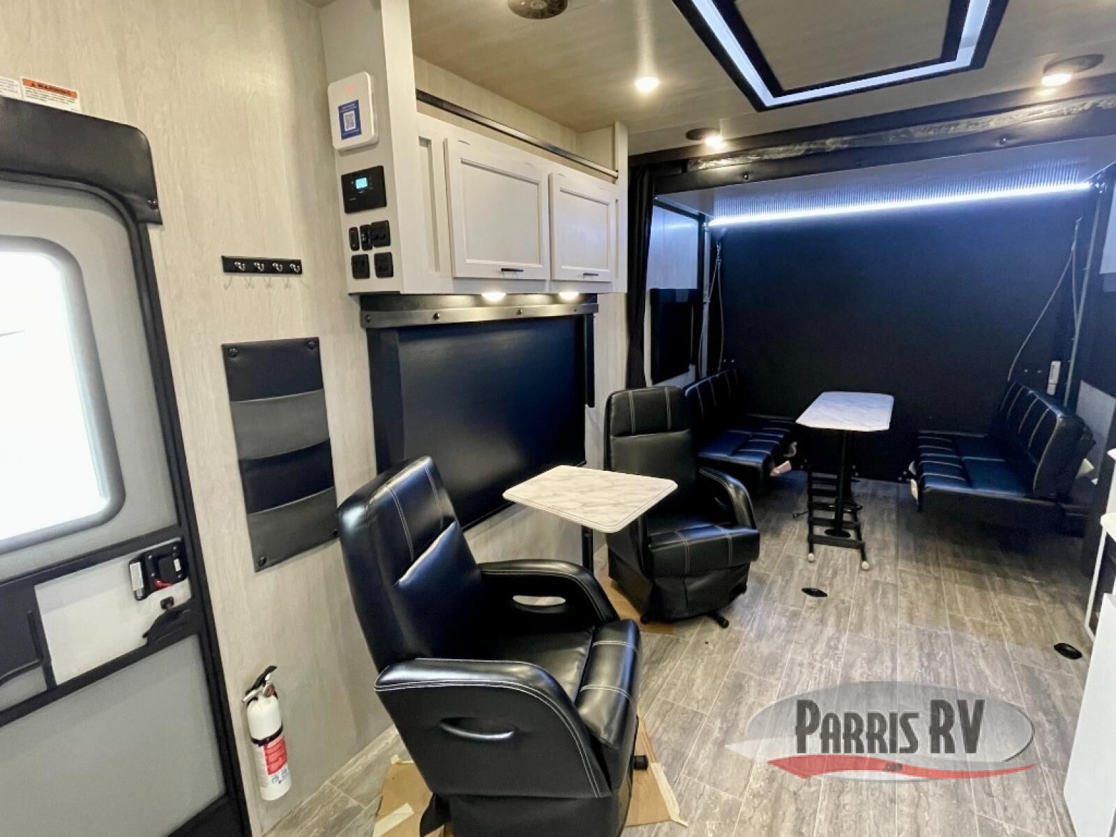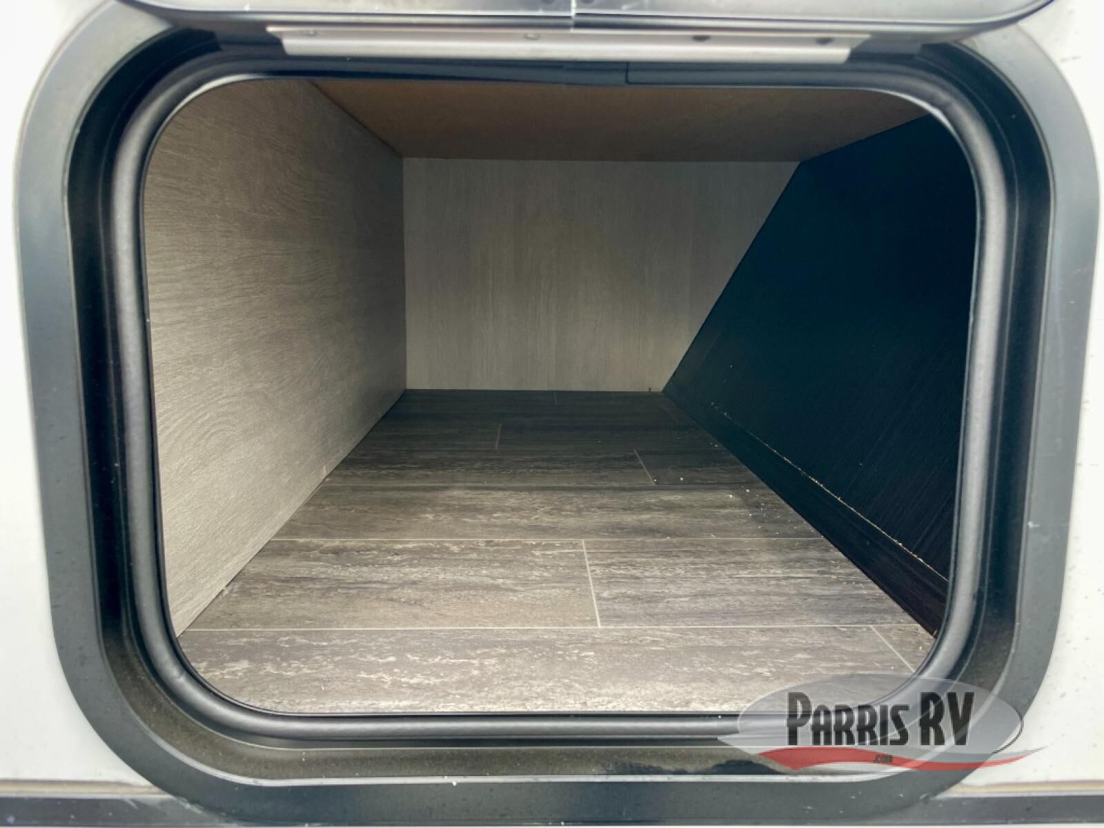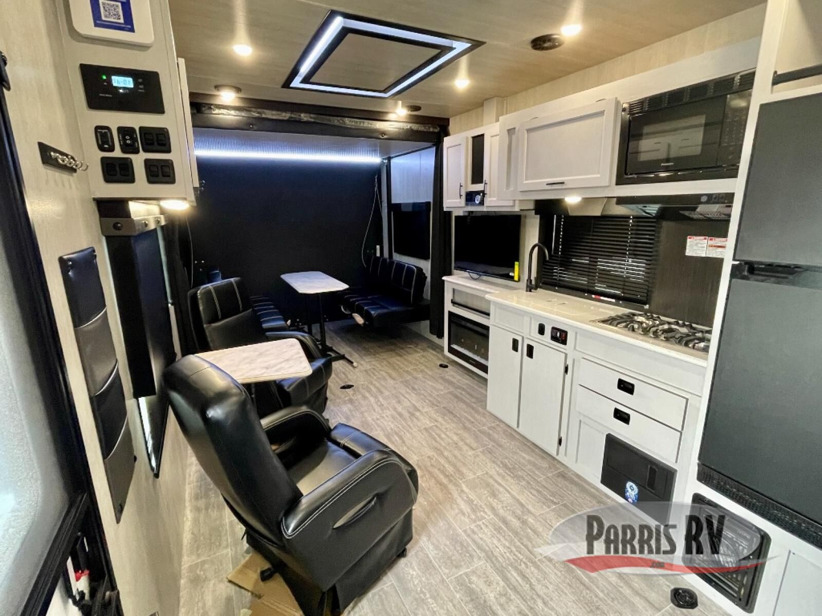 This simple, but convenient toy hauler is perfect for your riding weekends at the lake. It resembles model R2015XL, except the bath and bedroom flipped places in the layout. There is a spacious garage and a 7' ramp door to easily unload your toys. You can relax on the opposing rear power dinette with a single bed above for your guests. The front corner flip-up bed is sure to bring comfort, and the full bath lets you clean up each day. This model includes a three burner cooktop, an 10 cu. ft. 12V refrigerator, and a microwave oven to cook meals each day. Head outdoors to find a 200W solar panel, a patio awning, four stabilizer jacks, and exterior speakers to name a few conveniences!
