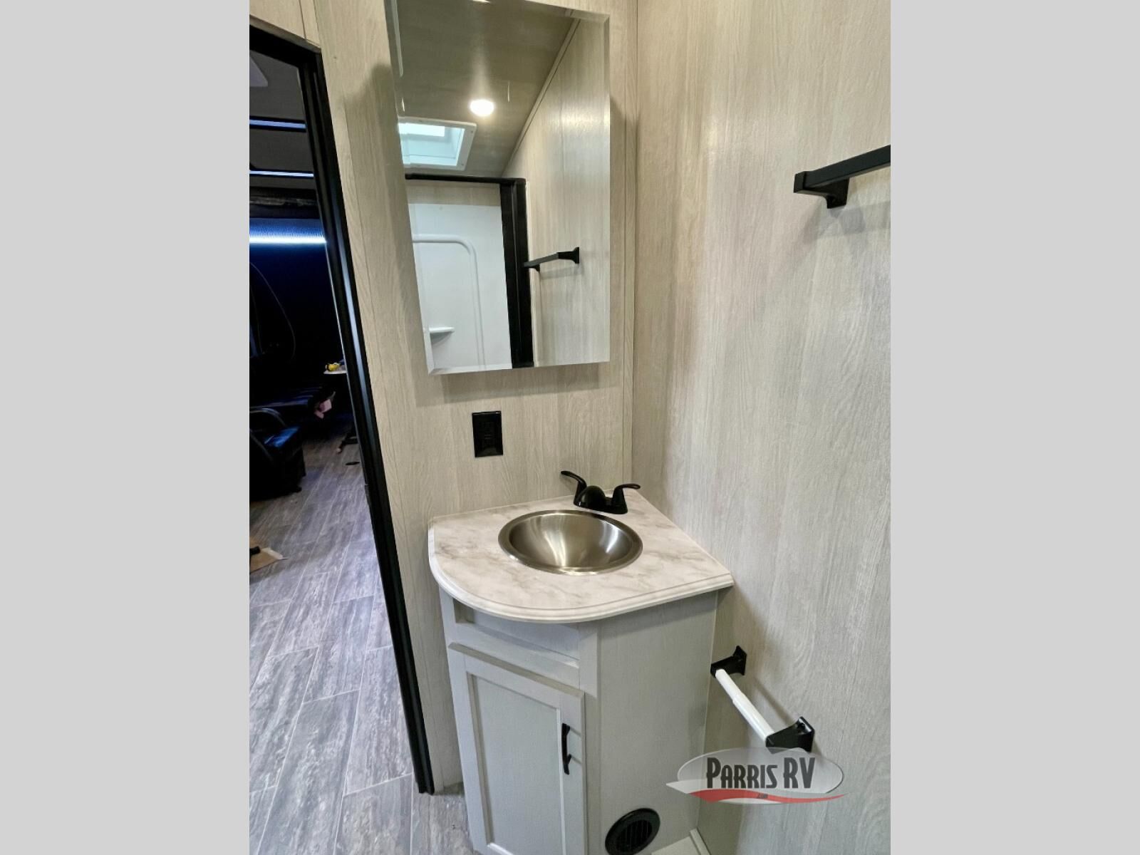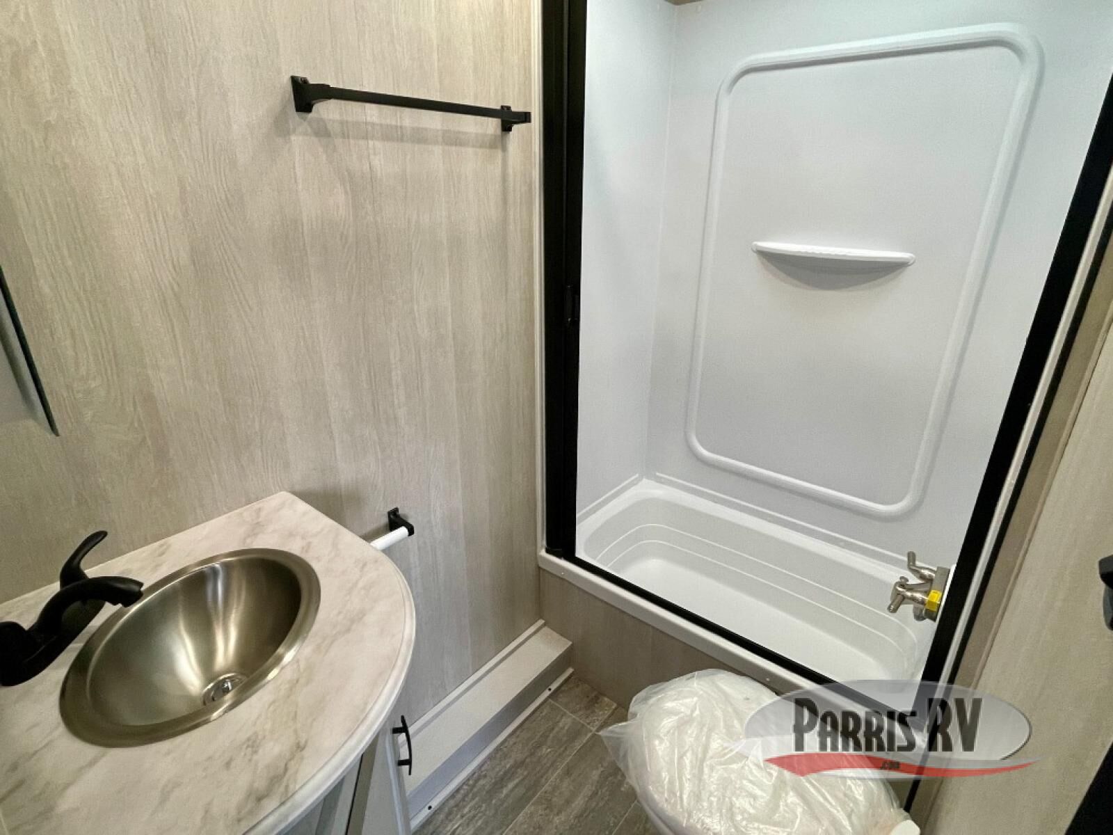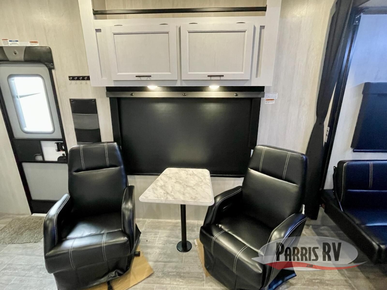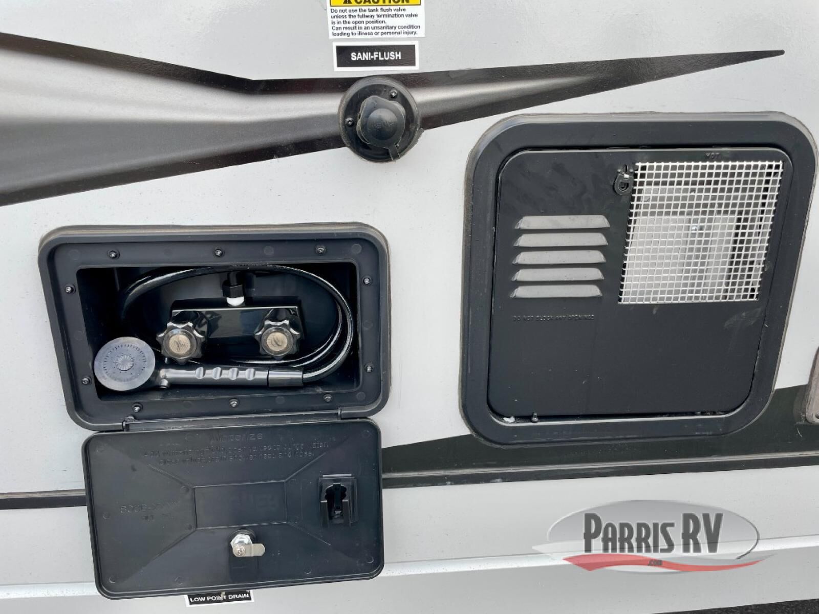 This simple, but convenient toy hauler is perfect for your riding weekends at the lake. It resembles model R2015XL, except the bath and bedroom flipped places in the layout. There is a spacious garage and a 7' ramp door to easily unload your toys. You can relax on the opposing rear power dinette with a single bed above for your guests. The front corner flip-up bed is sure to bring comfort, and the full bath lets you clean up each day. This model includes a three burner cooktop, an 10 cu. ft. 12V refrigerator, and a microwave oven to cook meals each day. Head outdoors to find a 200W solar panel, a patio awning, four stabilizer jacks, and exterior speakers to name a few conveniences!