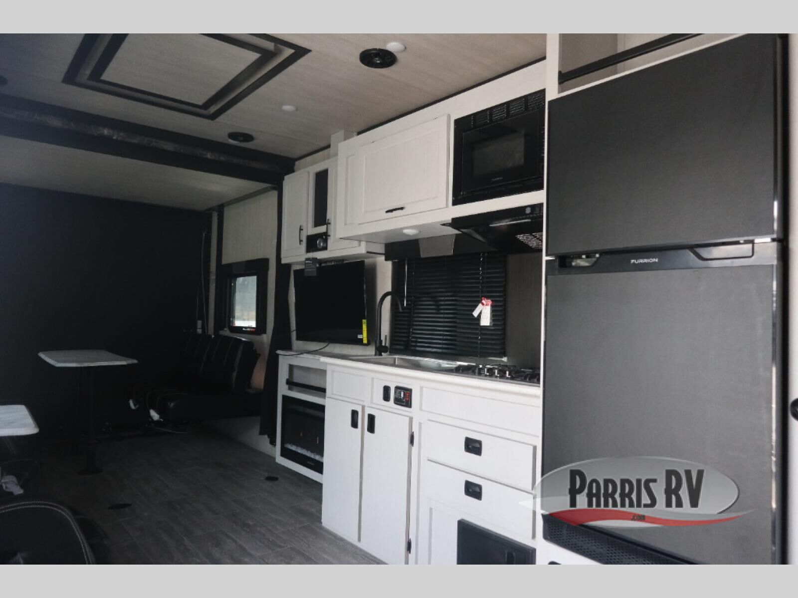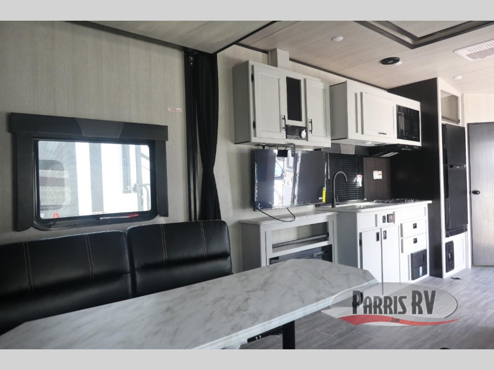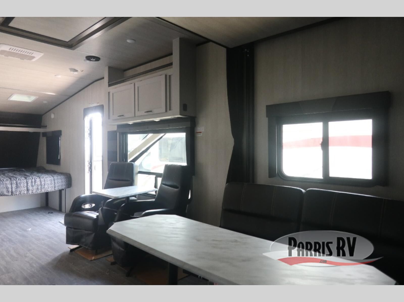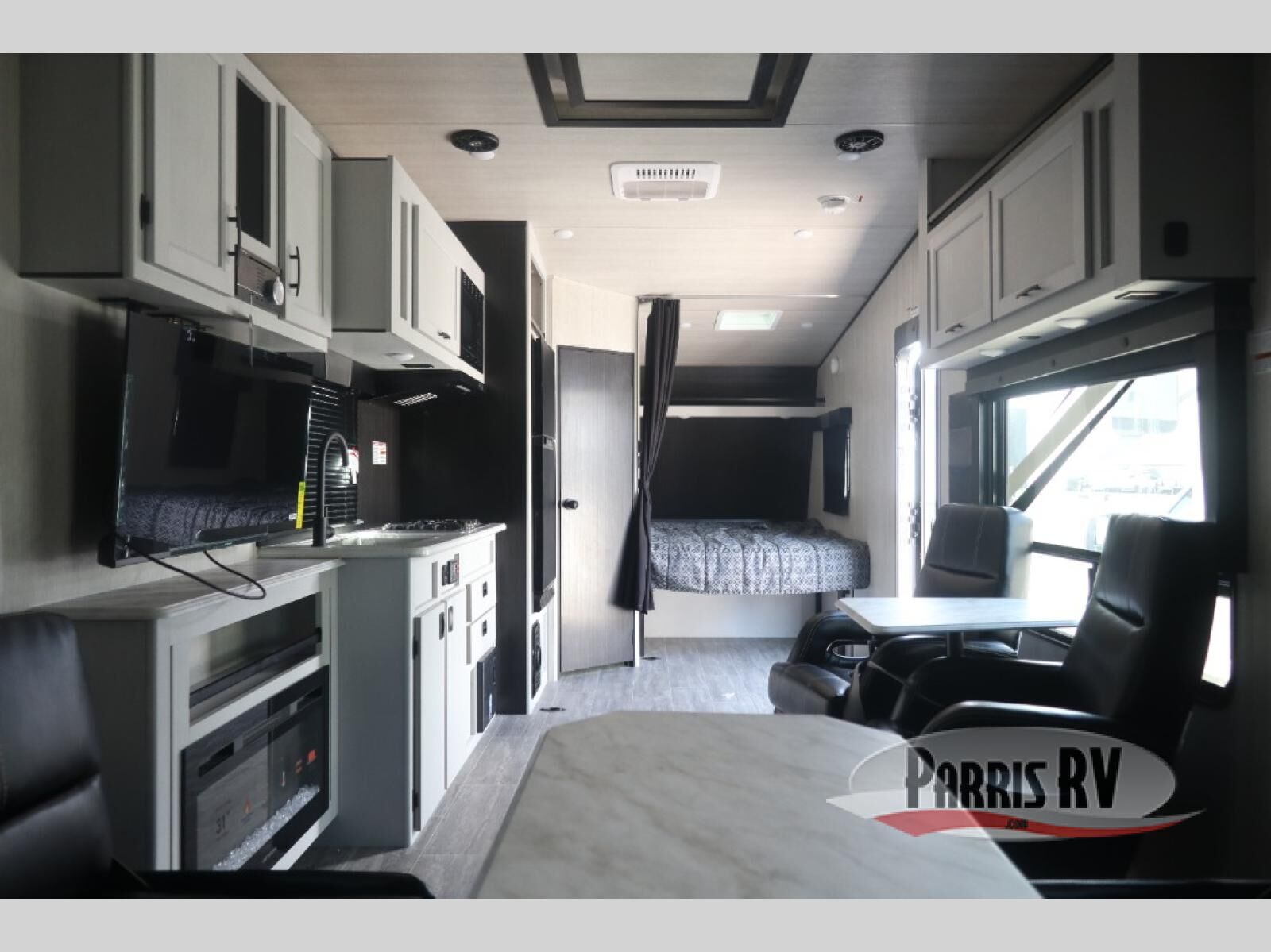 Pack your bags and load up your toys into the cargo space with the 7' ramp door of this toy hauler! The LED lights throughout help you to see clearly day or night, and the stereo with speakers allow you to play your favorite tunes while you cook dinner on the three burner cooktop. Sleep good each night on the front flip-up bed with overhead cabinets for your items, and you will appreciate how close the front corner bathroom is during those nighttime bathroom breaks. The Interior and exterior Deluxe package are forced options and come with handy features like two swivel rockers, a 13.5 BTU A/C, and exterior speakers!