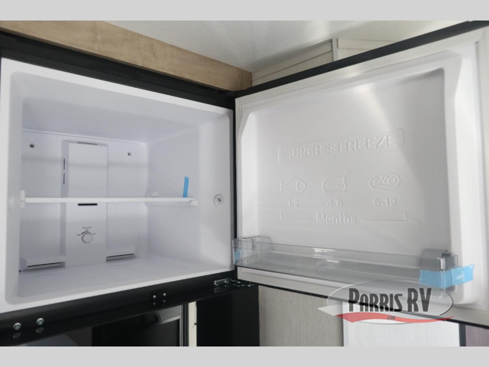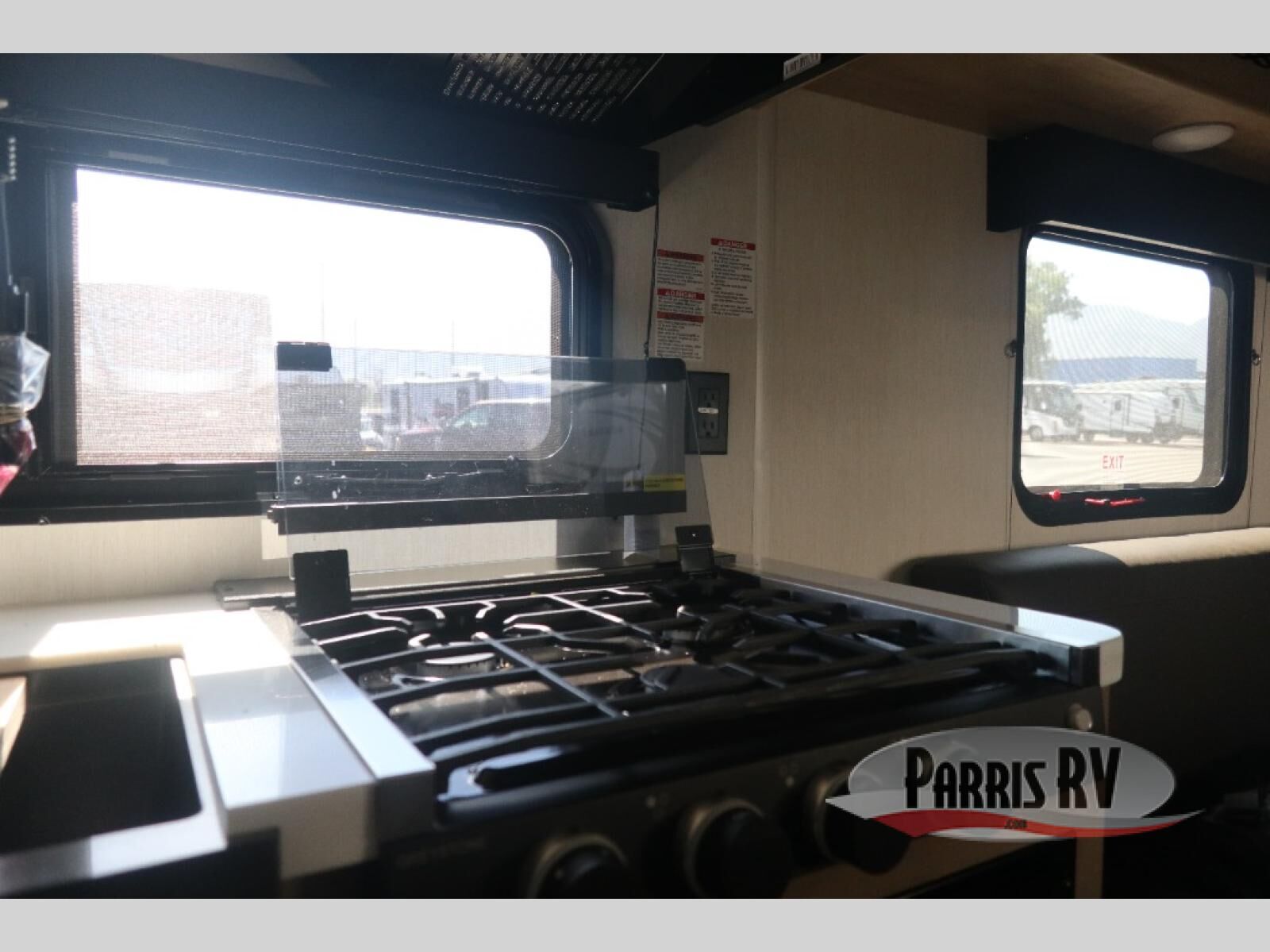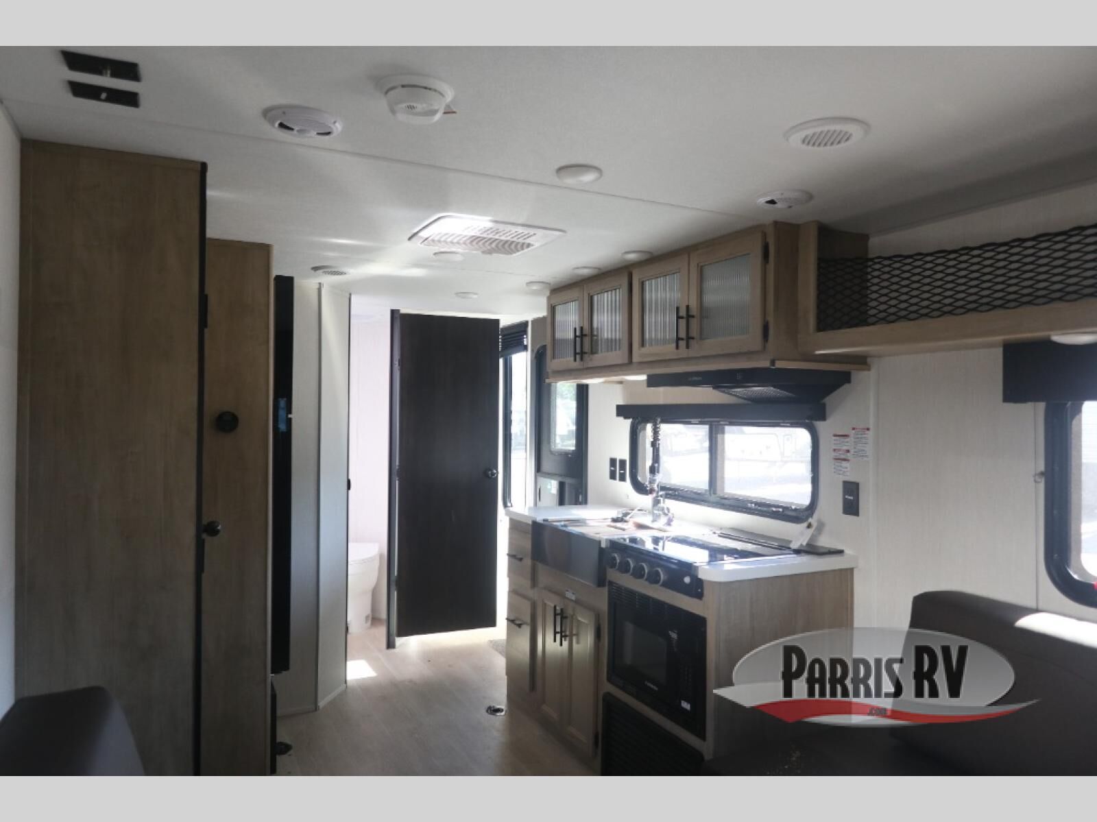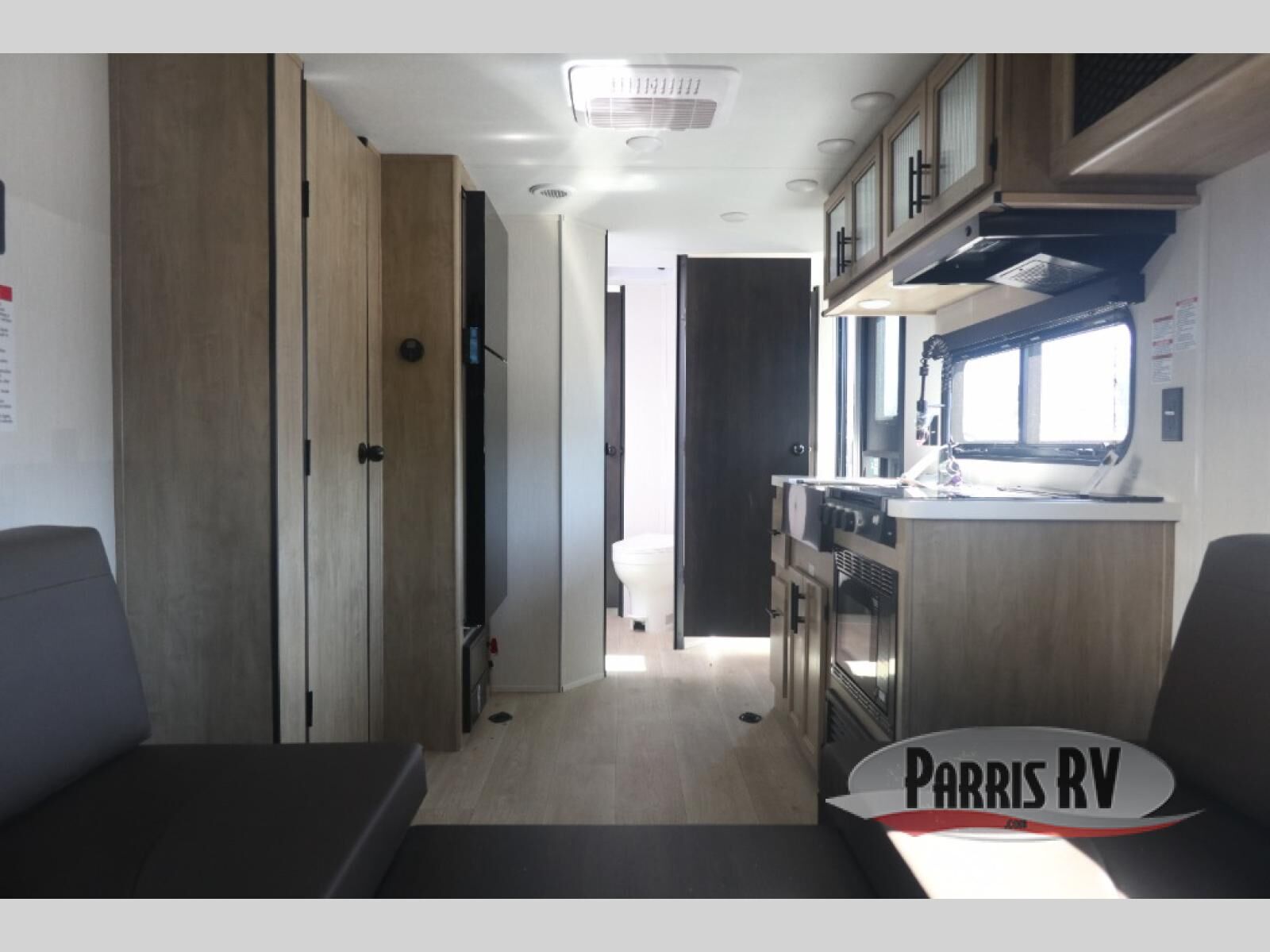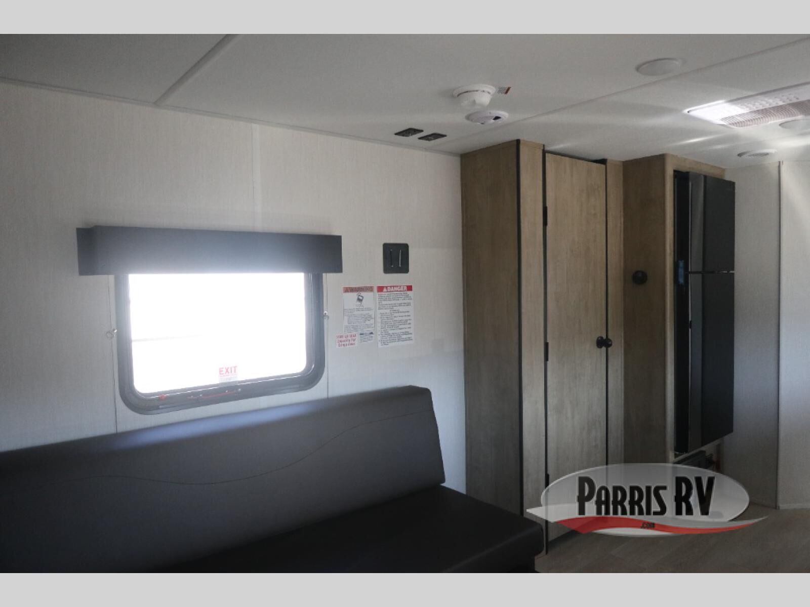 You will love this Cherokee Grey Wolf Black Label toy hauler with a rear ramp door for loading and unloading your toys and gear. If you position the fold-down sofas up against the wall, you will have even more room for extra gear when you are moving down the road. Set up camp and easily create a great dining area with the table between each fold-down sofa. You can also create your best meals in a breeze with the air fryer, and a large pantry allows you to pack all of the snacks and canned goods you need for your adventure. You will appreciate the master suite up front for a great night's rest on the RV king bed along with easy access into the dual-entry bath.
