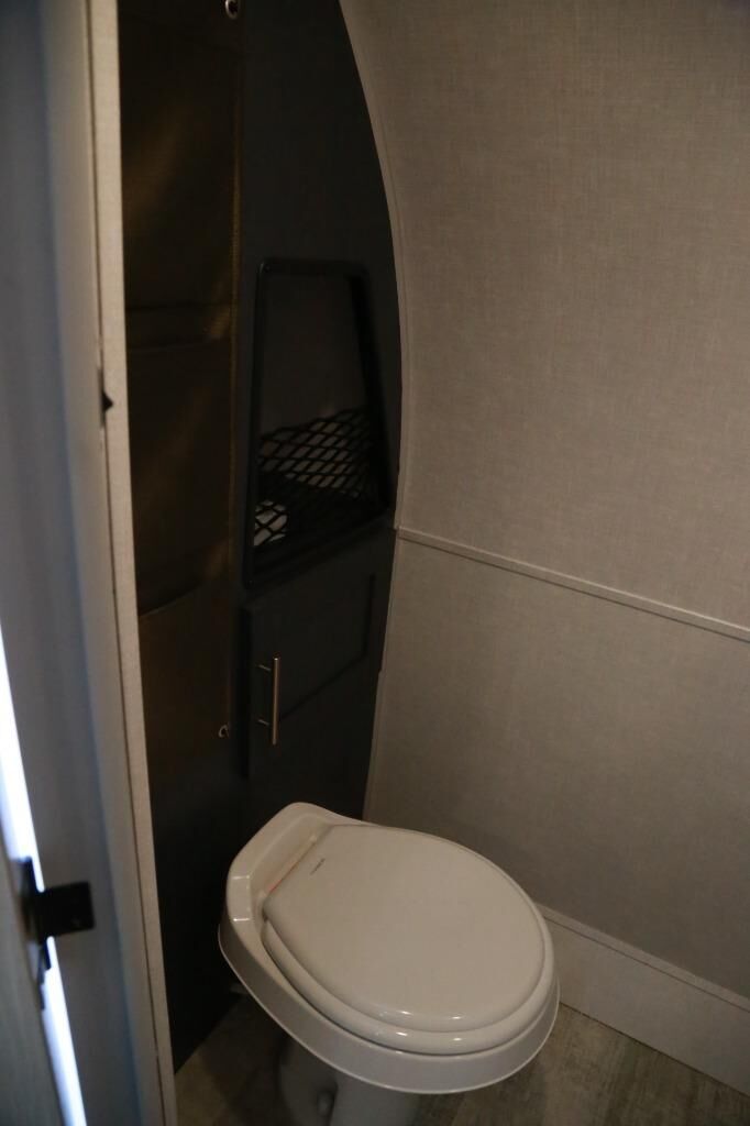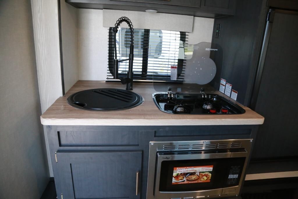 The full rear bathroom includes a separate shower, vanity, and toilet—rare in trailers this size. A functional kitchen with a two-burner cooktop, convection microwave, refrigerator, and pantry ensures you have everything you need for meals on the go.