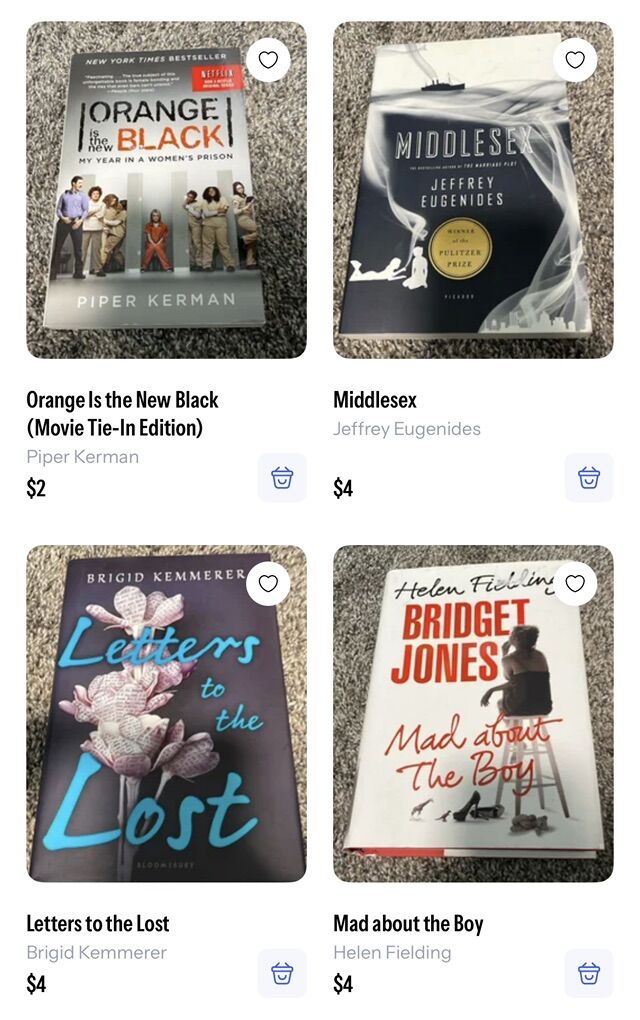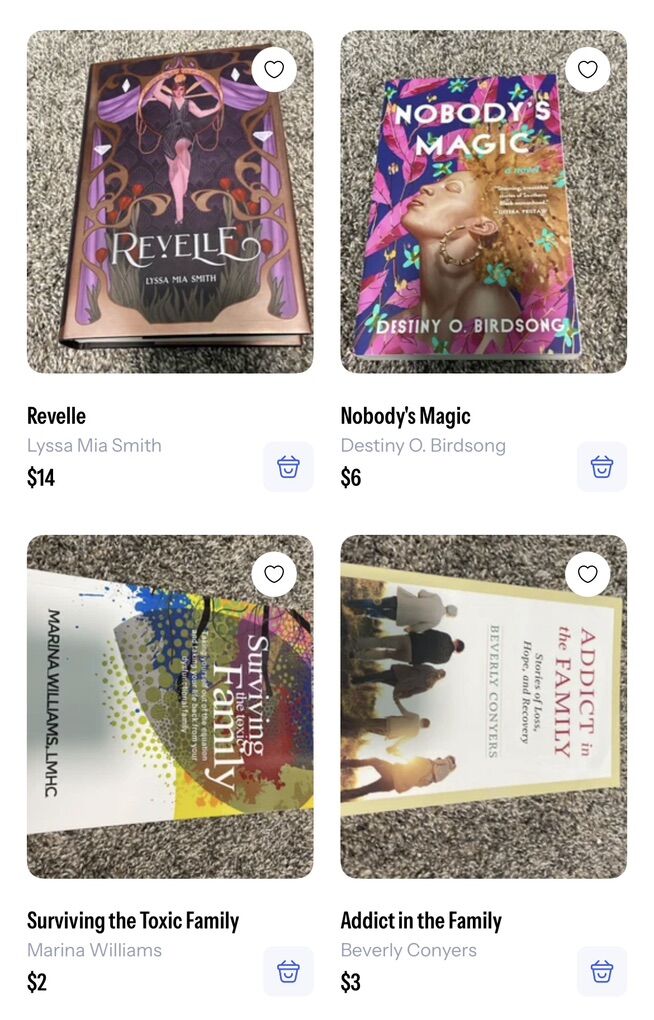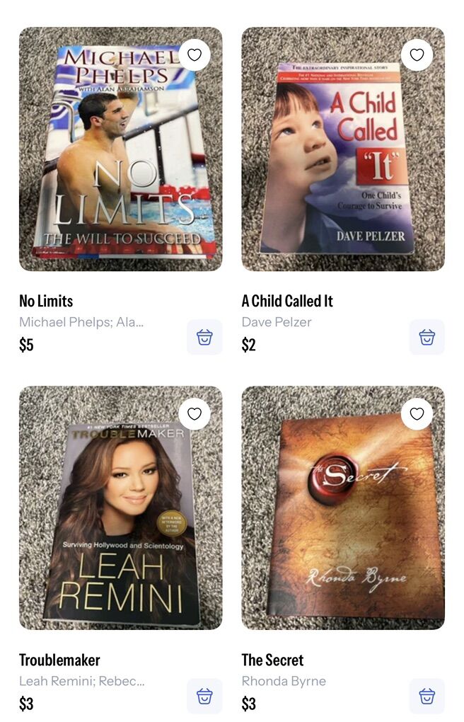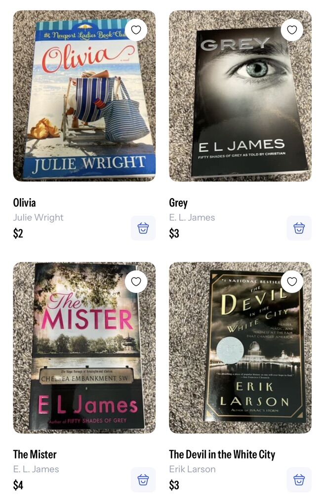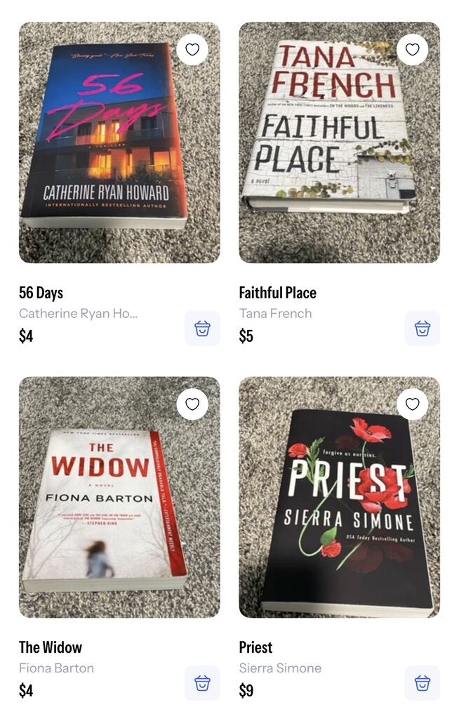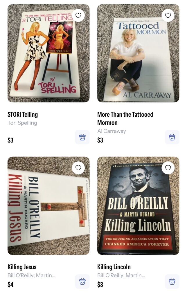 The Marriage Portrait - $6 Hidden figures - $2 Cockroaches - $4 The leopard - $3 Police - $4 Sharp objects — $3 Dark places -$3 Burden -$3 56 Days - $4 Faithful place (hardback) - $5 The widow - $4 Priest -$9 Hollow city - $3 Miss Peregrine’s home for peculiar children - $4 Brownies and broomsticks - $6 The fine print -$10 Revelle (hardback) -$14 Nobody’s Magic -$6 Surviving the toxic family -$2 Addict in the family -$3 Stiff -$3 What we saw -$3 I’ll be gone in the dark - $4 The Christmas Train -$2 Orange is the new black -$2 Middlesex -$4 Letters to the lost (hardback) -$4 Mad about the boy (hardback) -$4 Yellowstone ghost stories - $2 50 real American ghost stories -$2 Bulletproof (hardback) -$2 In real life -$3 Stori telling -$3 More than the tattooed Mormon -$3 Killing Jesus (hardback) -$4 Killing Lincoln (hardback) -$3 No limits (hardback) - $5 A child called it -$2 Troublemaker -$3 The secret (hardback) -$3 Brooklyn -$3 Death in Yellowstone -$5 Ranger confidential -$5 All my rage (hardback) -$7 Hell bent (hardback) -$11 The golden couple (hardback) -$6 In the afterlight -$5 The darkest minds -$5 Olivia -$2 Grey -$3 The mister -$4 The devil in the white city -$3 Atonement -$2