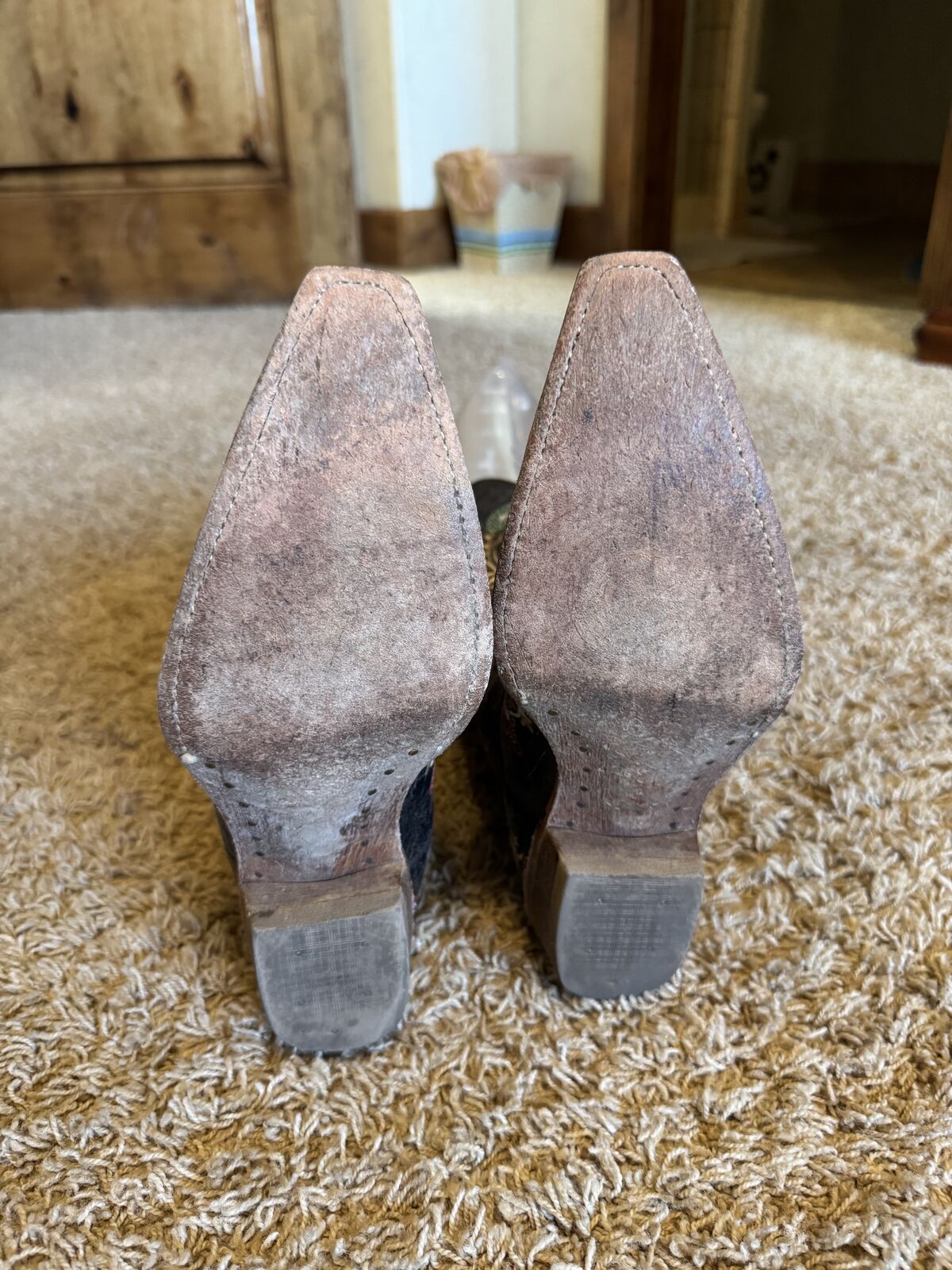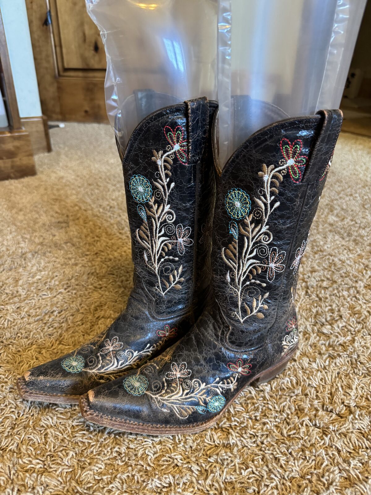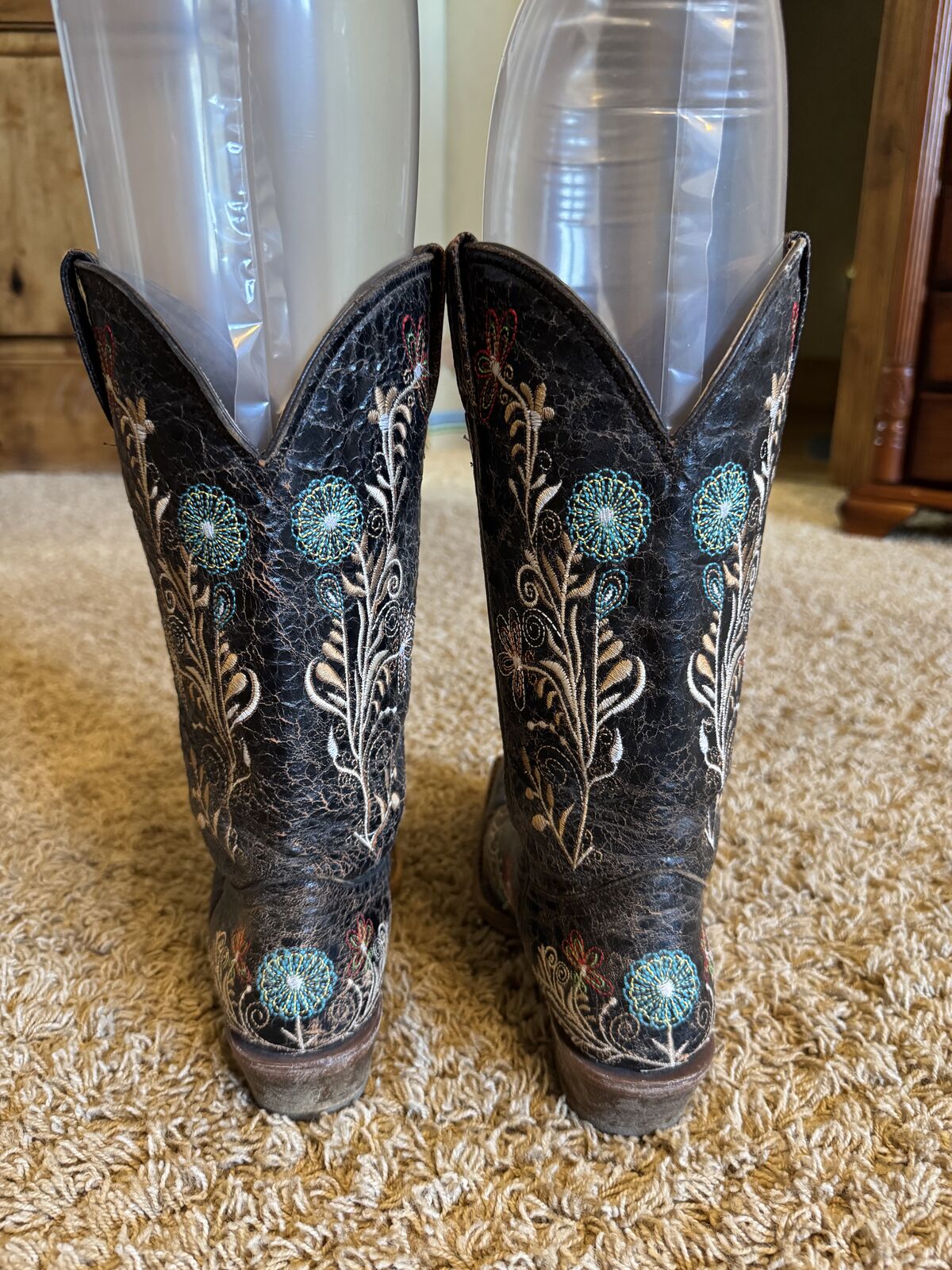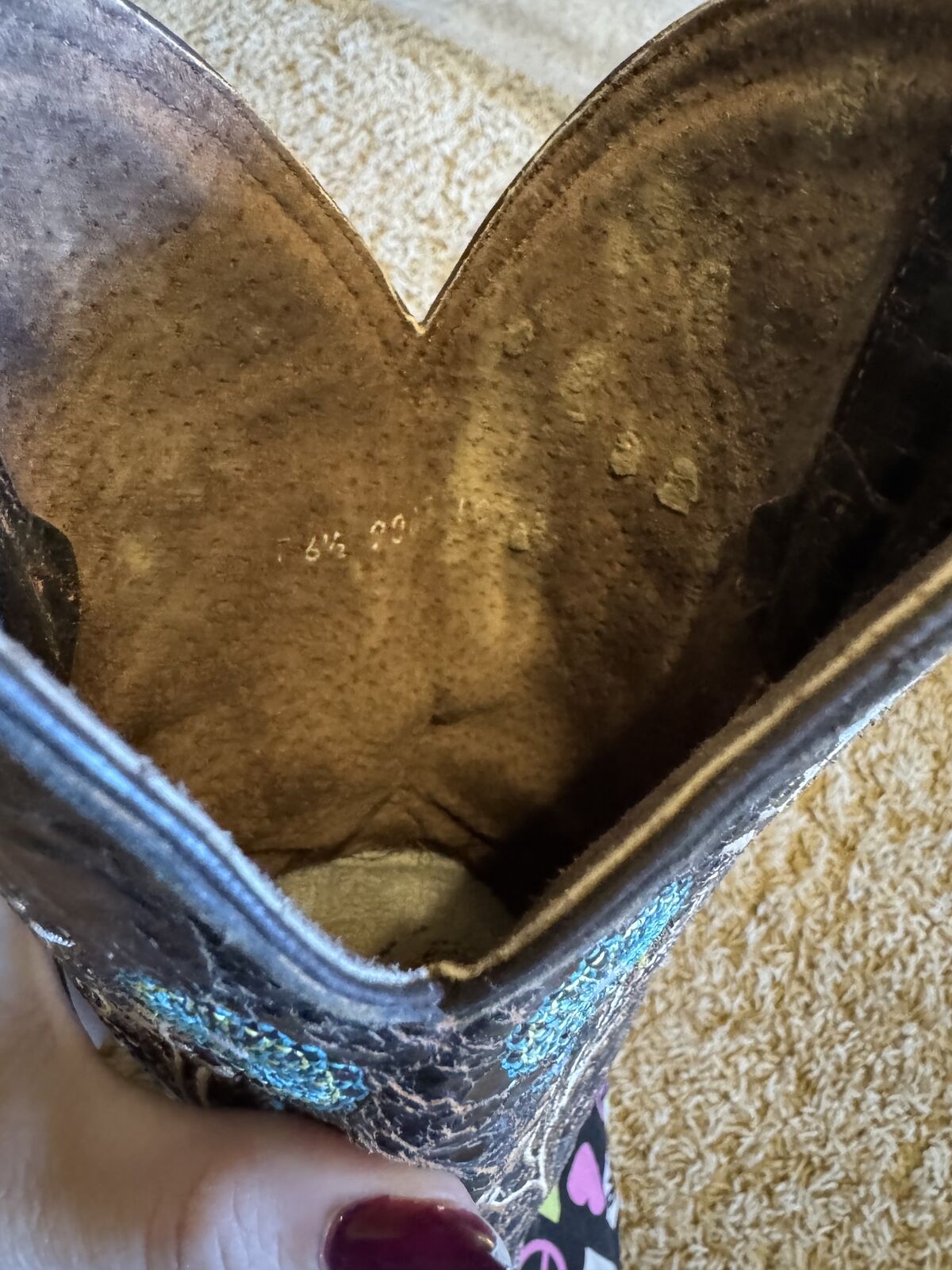 CashAppBeautiful intricate cowgirl boots! The brand is Pecos Bills and they are one of the most comfy boots you can get. The leather on these is very soft and doesn't give you blisters.size 6.5